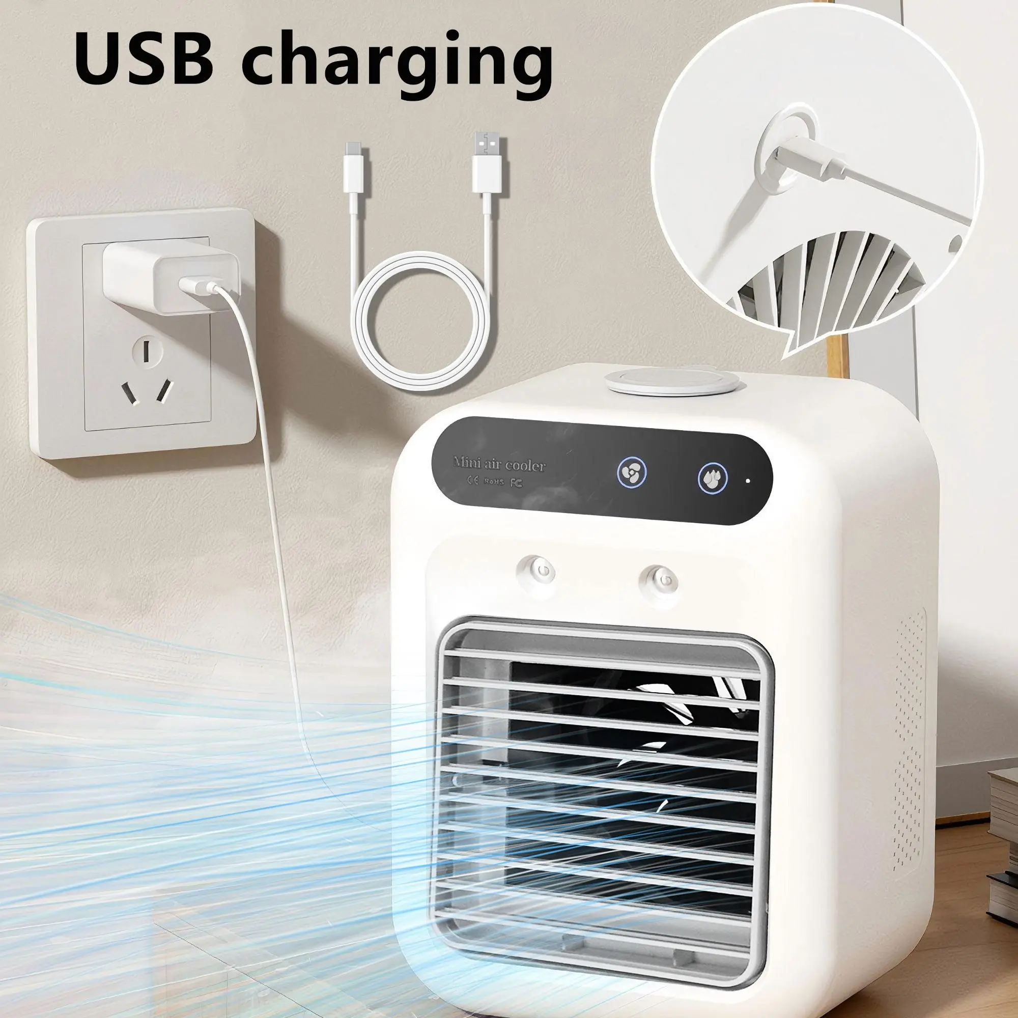 Portable USB Rechargeable Mini Desktop Air Cooler Humidifier, Silent Operation, 3-Speed Adjustment, Lithium Battery Powered for Home & Office