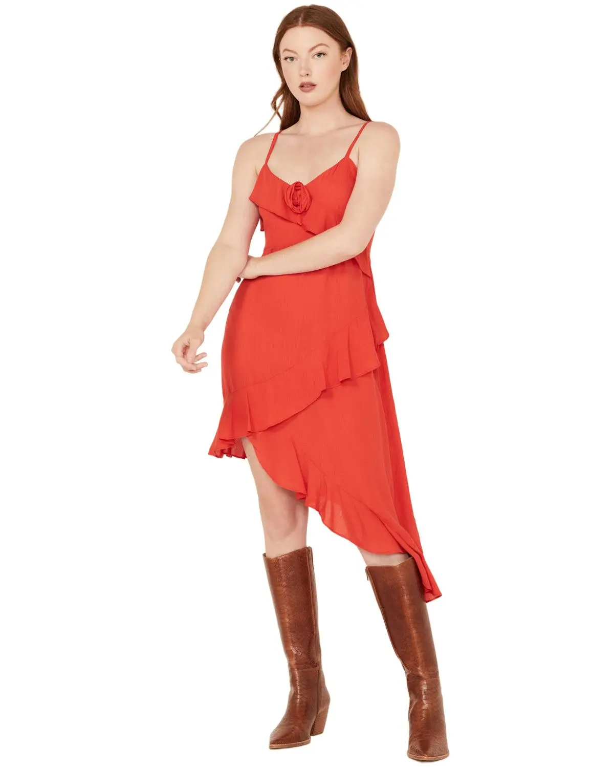 Model is 5'10" wearing a size small. 100% polyester. Sleeveless. Adjustable spaghetti straps. V neckline with rose detail. Smocked back. Ruffle accents. Solid red design. Asymmetrical hem. Imported.