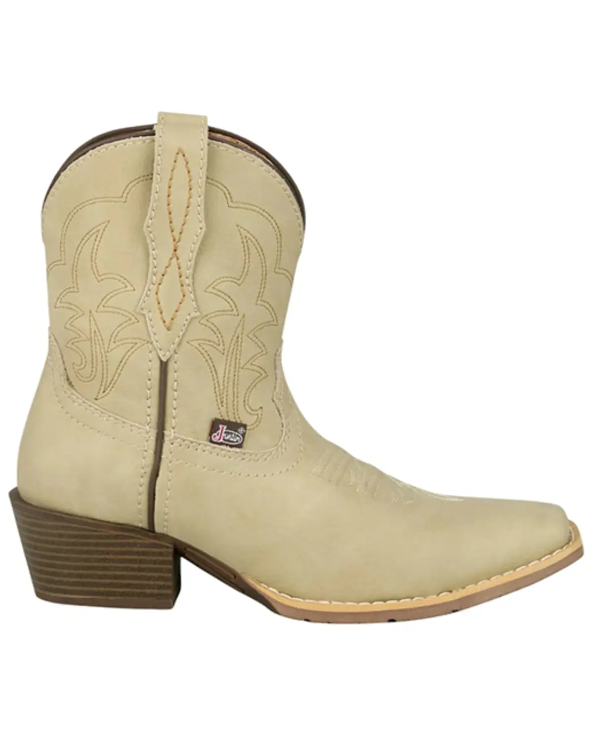 Suede leather upper. Square toe. 7" shaft height. Woven lining. Removeable orthotic insole. Single-stitched welt. Rubber outsole. 1.5" western heel. Solid ivory design with western stitching. Imported.