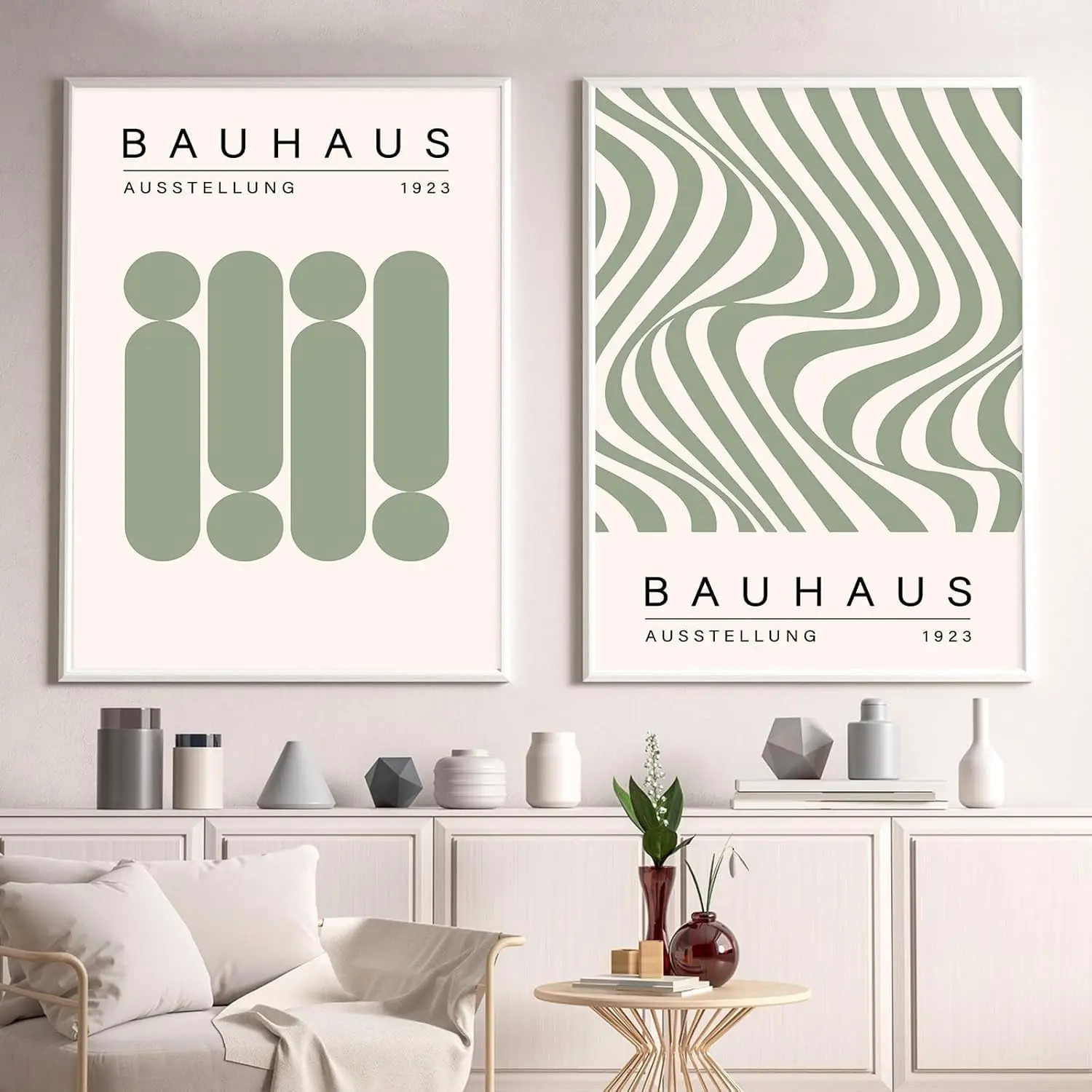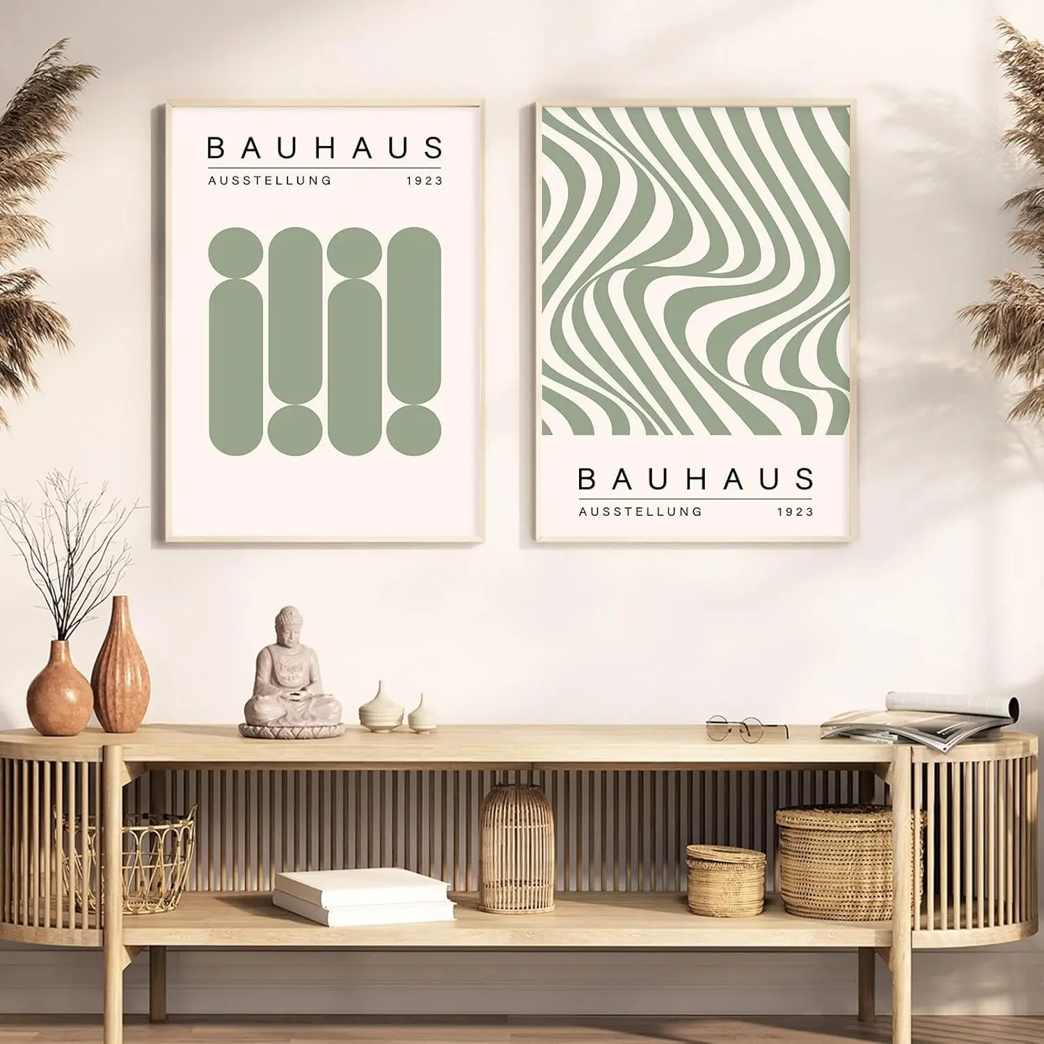 3pcs/set Geometric Line Wall Art Bauhaus 1923 Poster Sage Green Abstract Paintings Mid Century Modern Artwork Bauhaus Exhibition Poster Abstract Shape Prints Boho Modern Picture for Livingroom Unframed