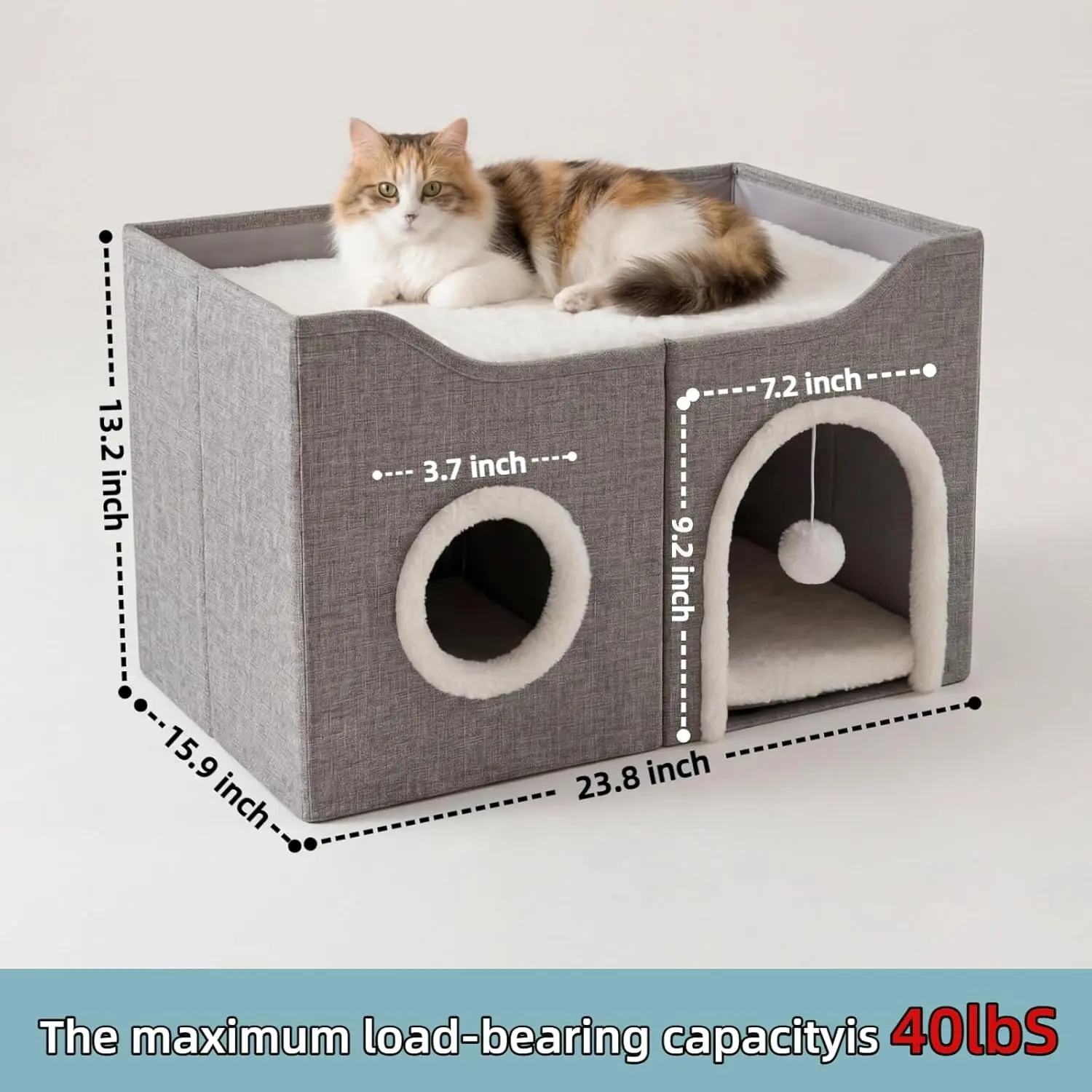 Cat Beds for Indoor Cats - Large Cat Cave for Pet Cat House with Fluffy Ball Hanging and Scratch Pad, Foldable Cat Hideaway, 23.8x15.9x13.2 inches, Grey
