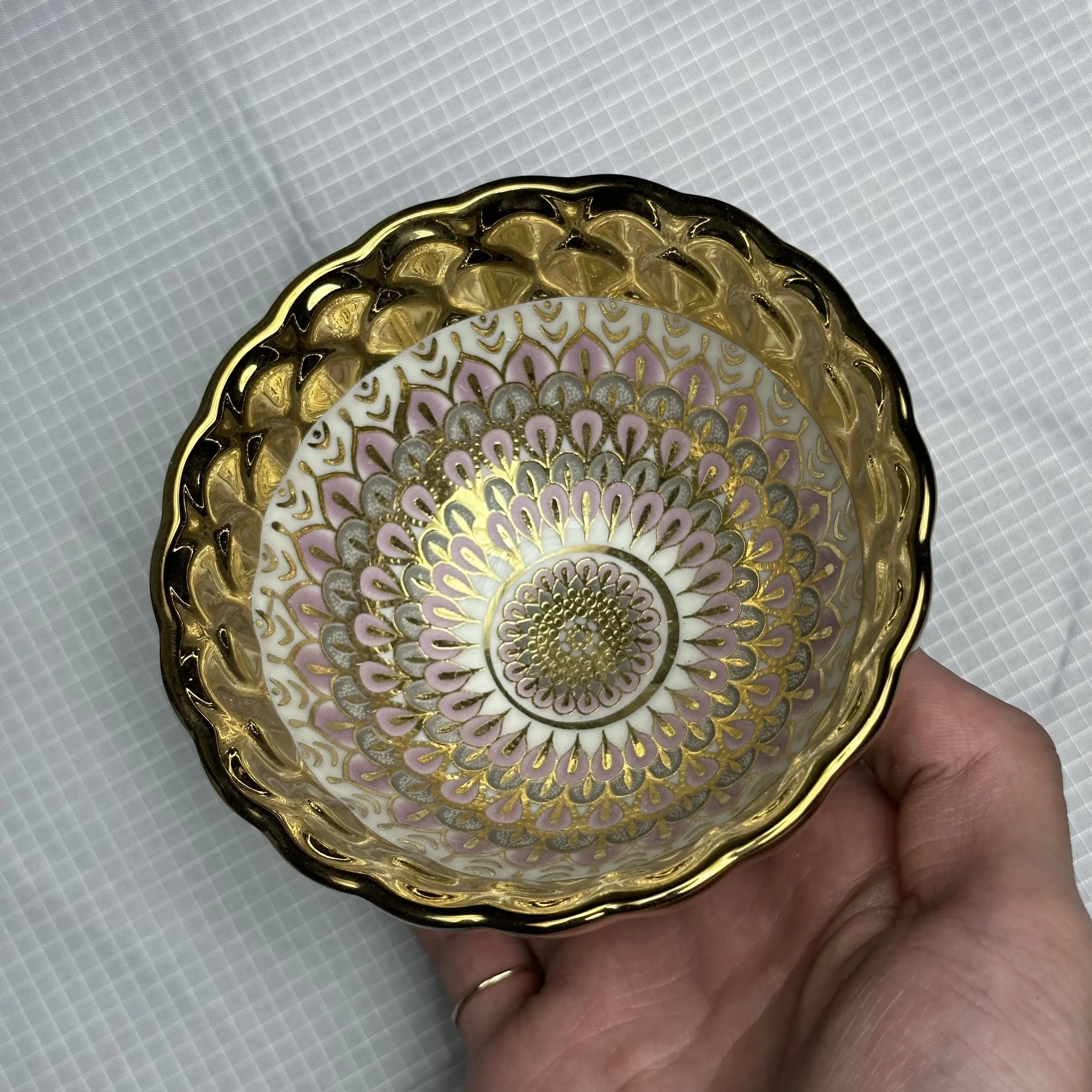 This ceramic teacup features a Bohemian Golden rim and a charming pink floral pattern. The scalloped edge adds a delicate touch to its design. Perfect for savoring your favorite beverages in style. The teacup combines functionality with aesthetic appeal, making it a delightful addition to any collection.