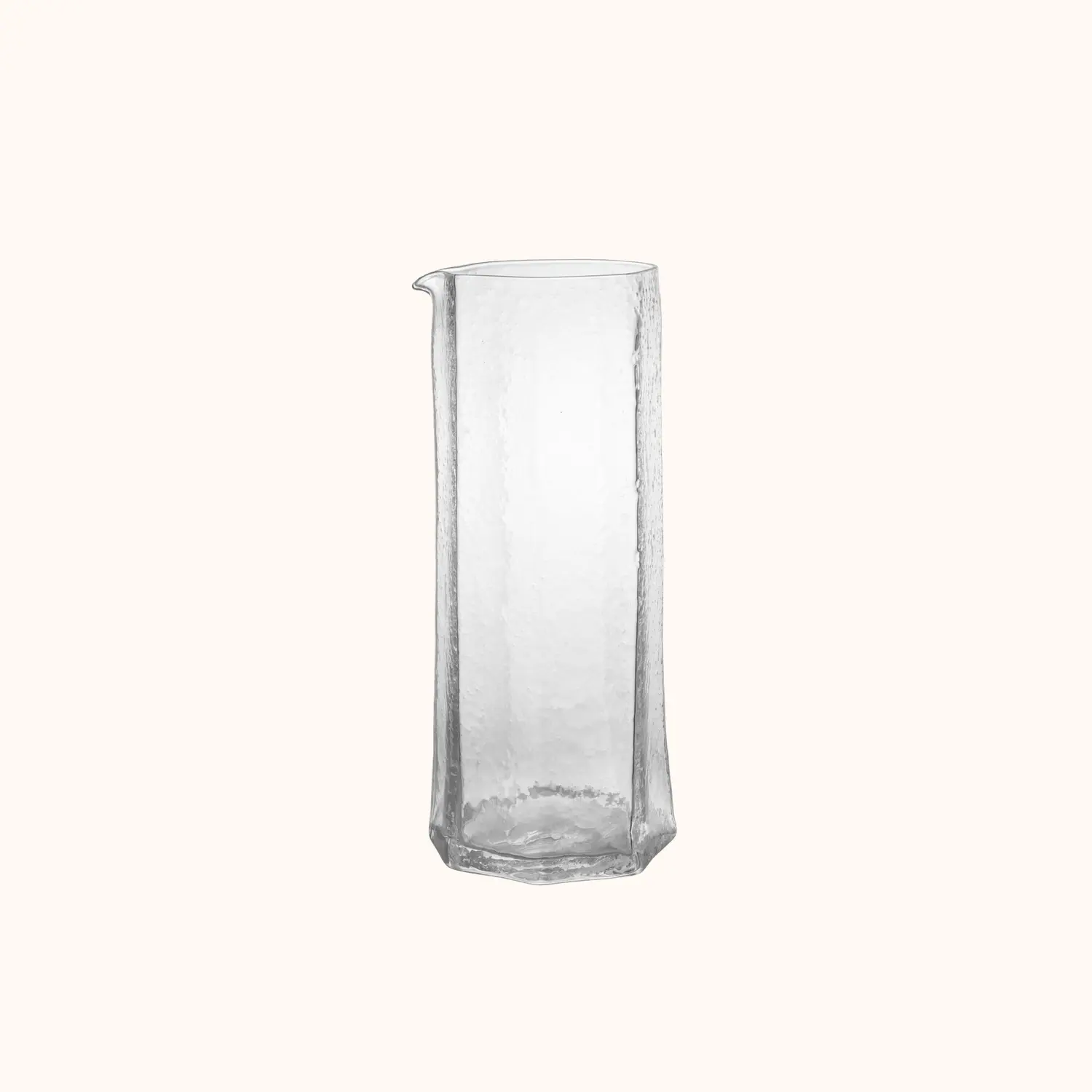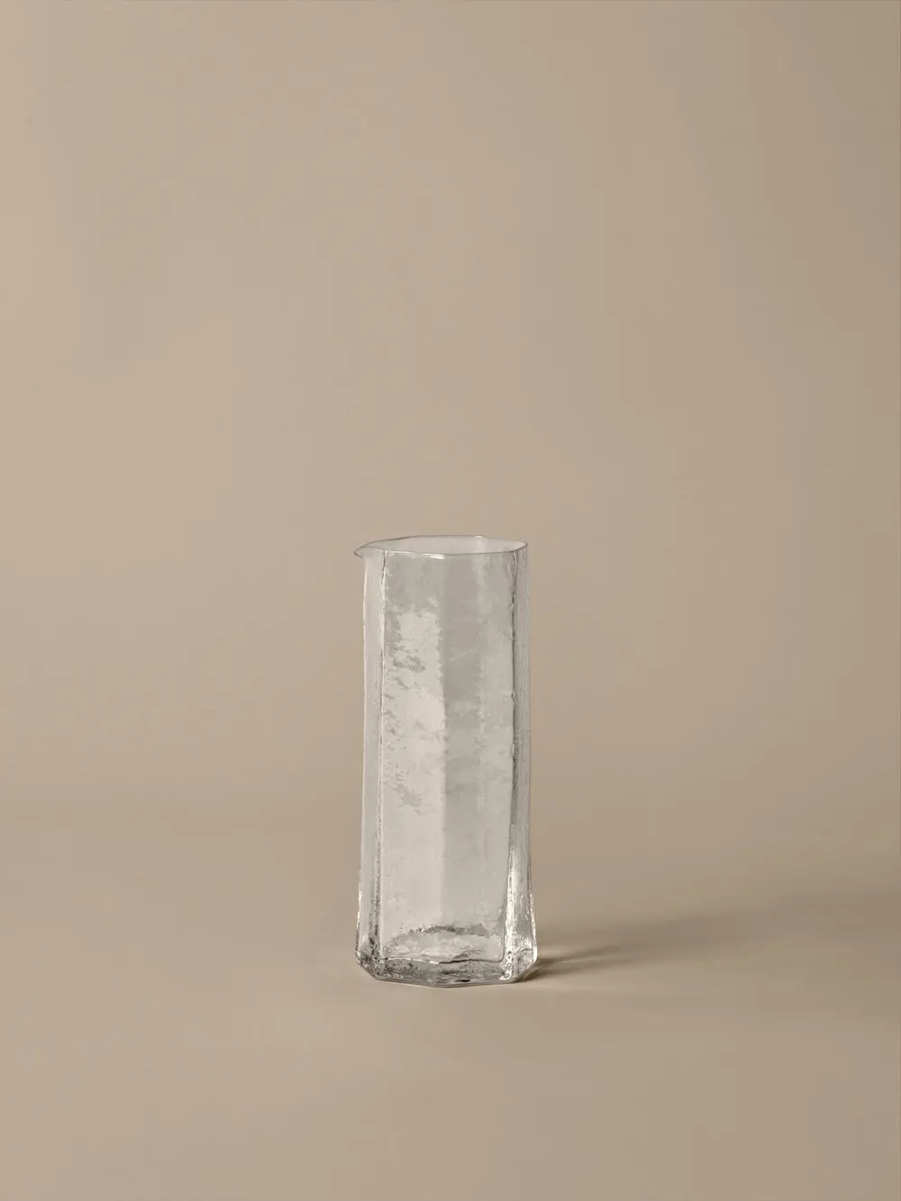 The Kiru Carafe is mouth-blown from 100% GRS-certified recycled glass using the Japanese Kurinuki technique - forms hand-carved in clay, translated into a brick mould, pressing ceramic texture directly into the glass. The result is a clear carafe with a finish that's entirely its own. Use it for water, juice or wine.