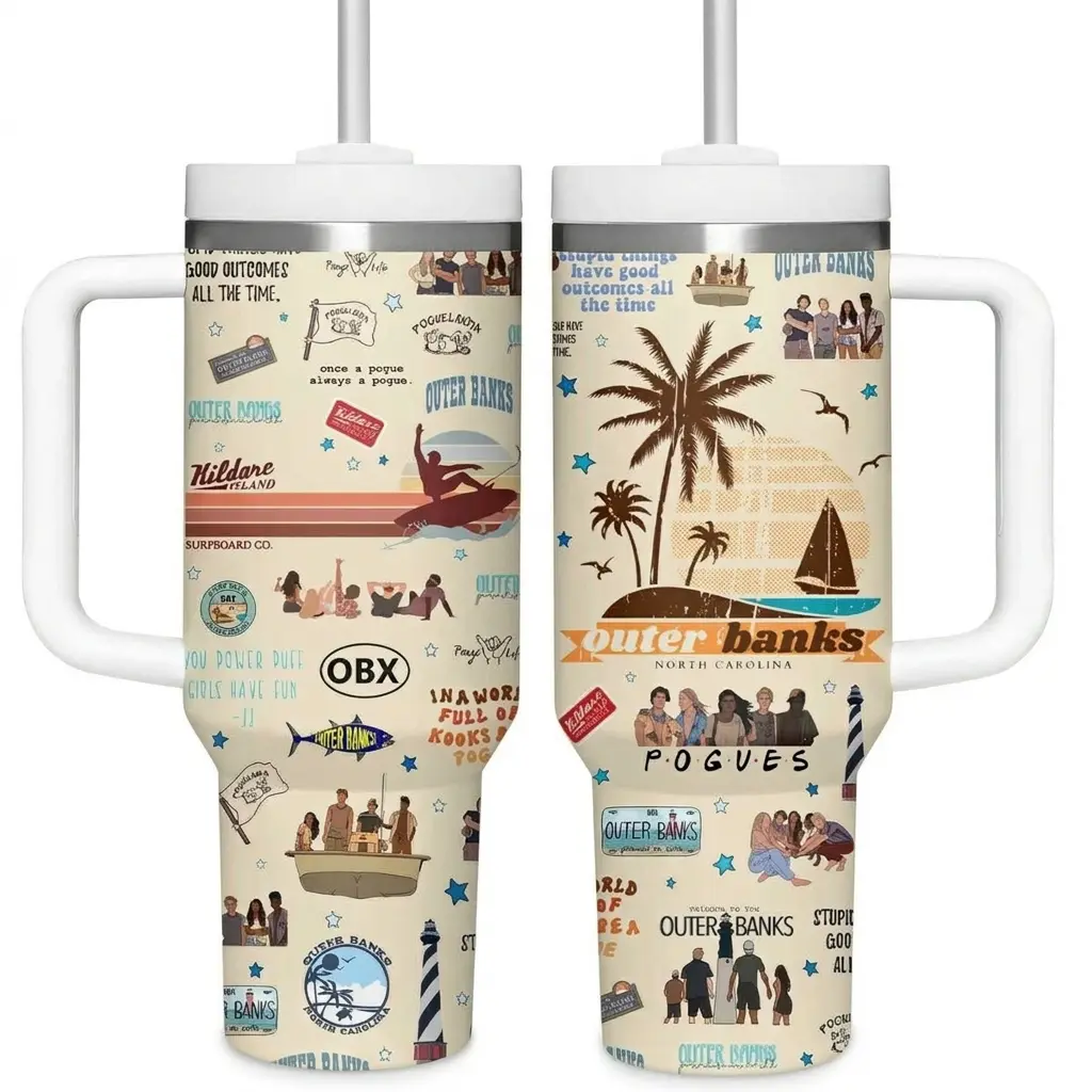 Outer Banks TV Series Tumbler 40oz with Handle, Pogues vs Kooks Aesthetic Cup, John B Sarah Cameron JJ Fan Gift, Beach Adventure Drama Mug, Coastal Vibe Travel Mug, Stainless Steel Tumbler