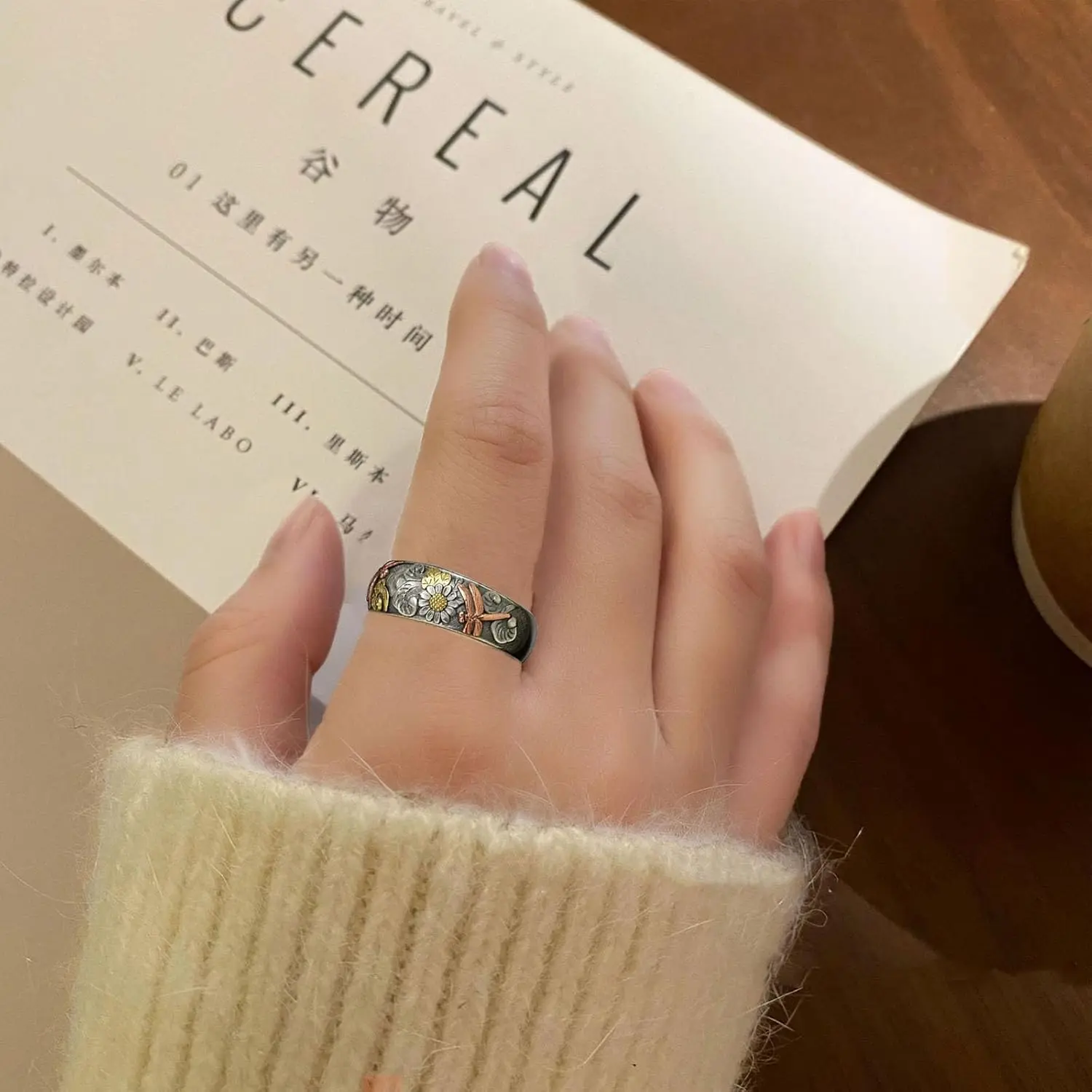 Vintage silver and rose gold engraved dragonfly and sunflower ring, unique hammered metal lotus ring for women, engagement party ring jewelry, gift for girlfriend or friend