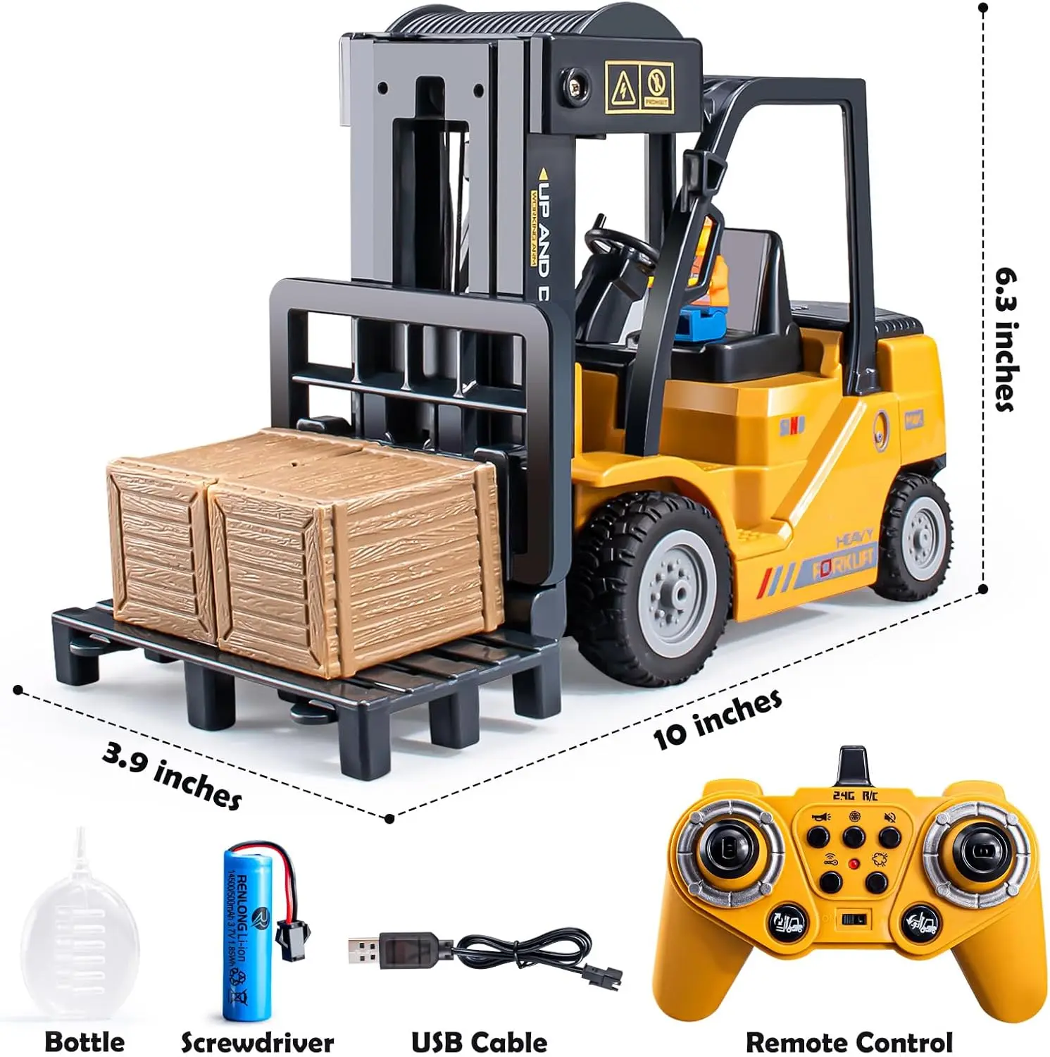 ·【11-channel Forklift】RC forklift truck has eleven different functions, rc crane can be forward/backward, left/right, can move the forklift to push the box to move . The fork on the front of the cart can be moved up and down.The car also has authentic forklift sounds, lighted music features.The car runs and behaves like a realistic bulldozer.