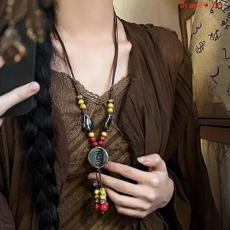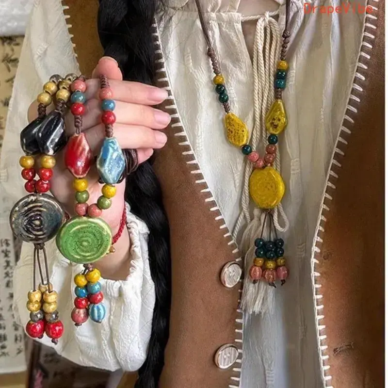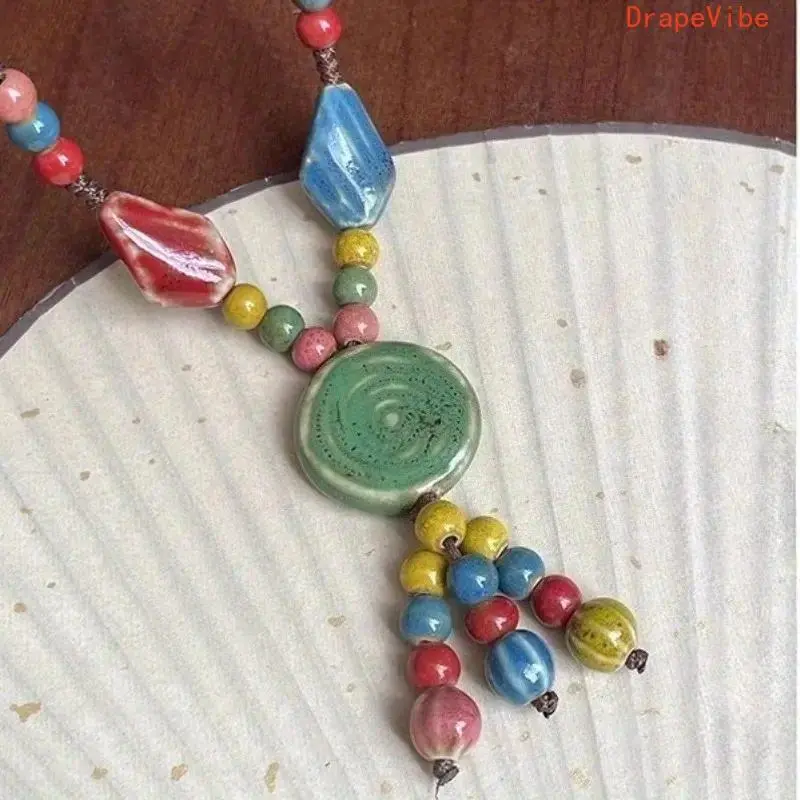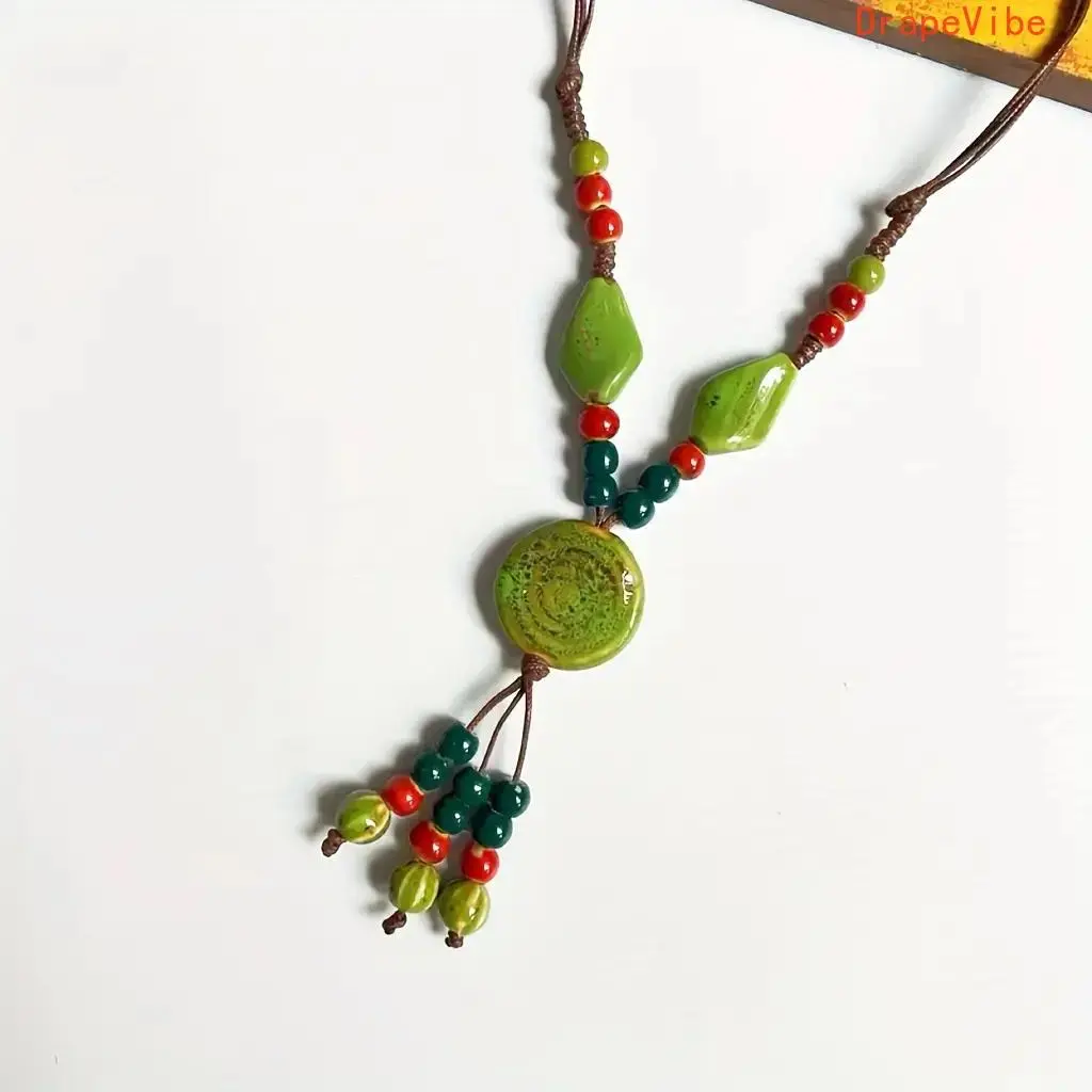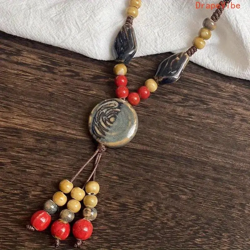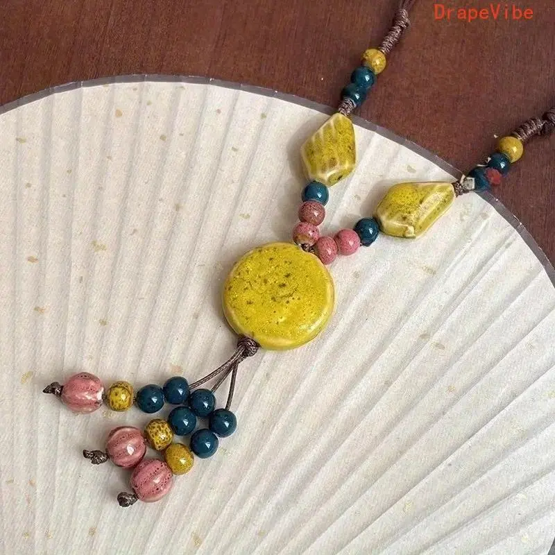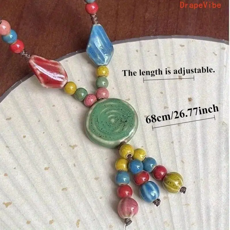 Vintage Tribal Adjustable Disc Ceramic Bead Necklace Handmade High Temperature Kiln Fired Irregular Bohemian Ethnic Sweater Chain For Women Daily Vacation Wear