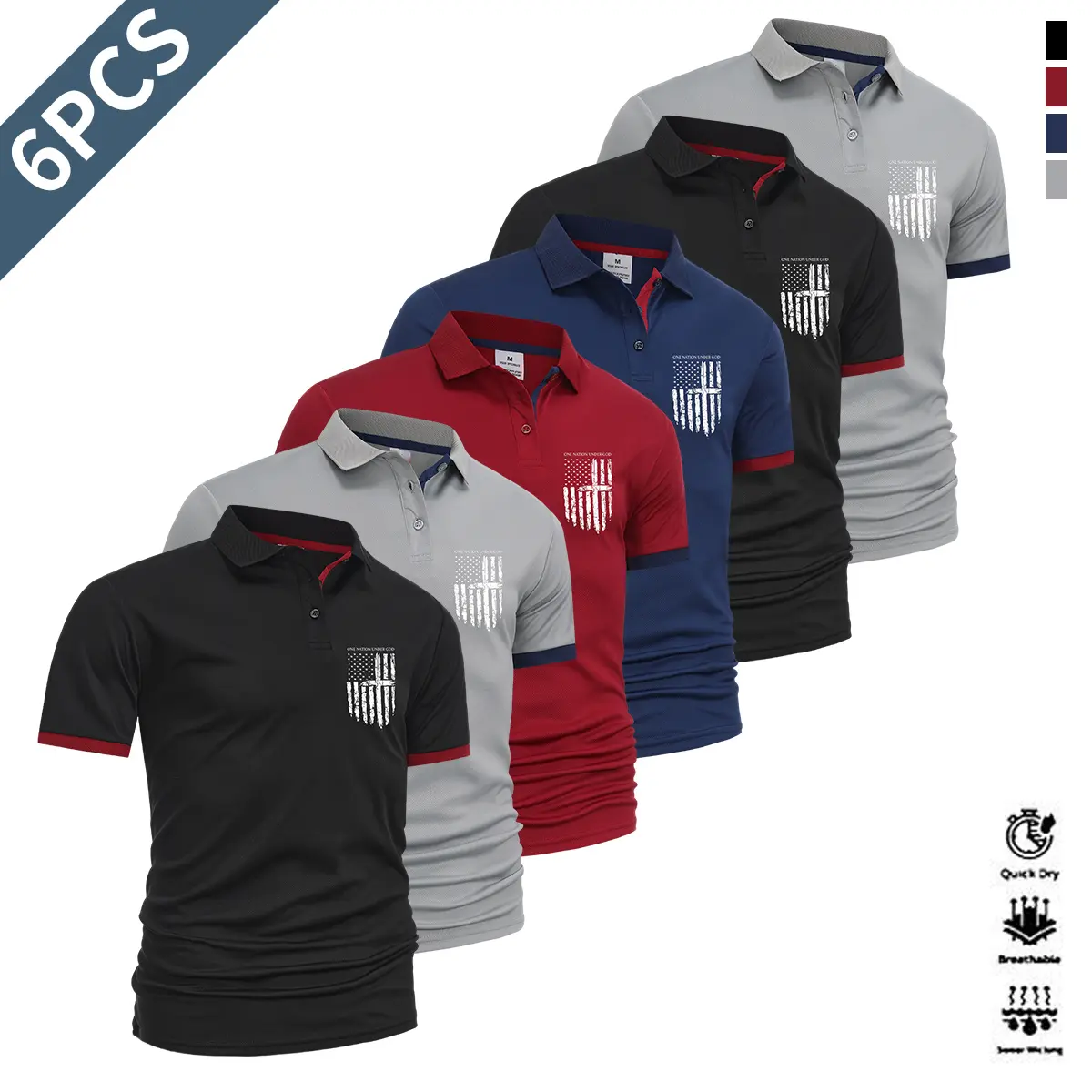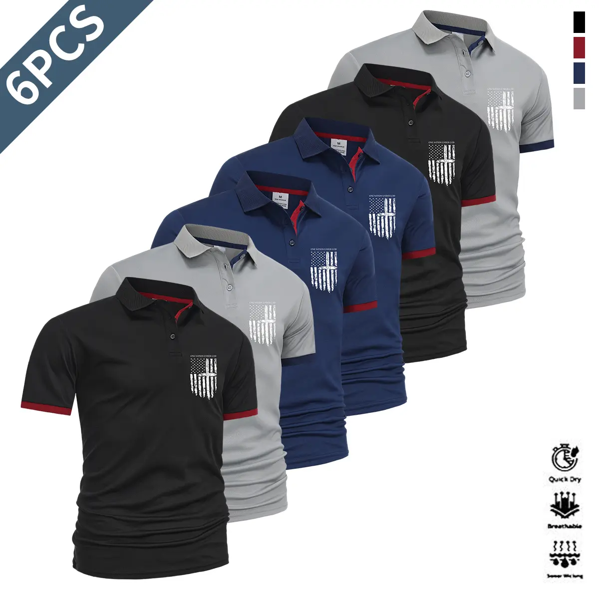 Men’s summer essential 6-pack polo shirts—simple commuter style with contrast stripe accents at the collar and cuffs; versatile short-sleeve design suitable for business meetings, friend gatherings, sports, fitness, and more.