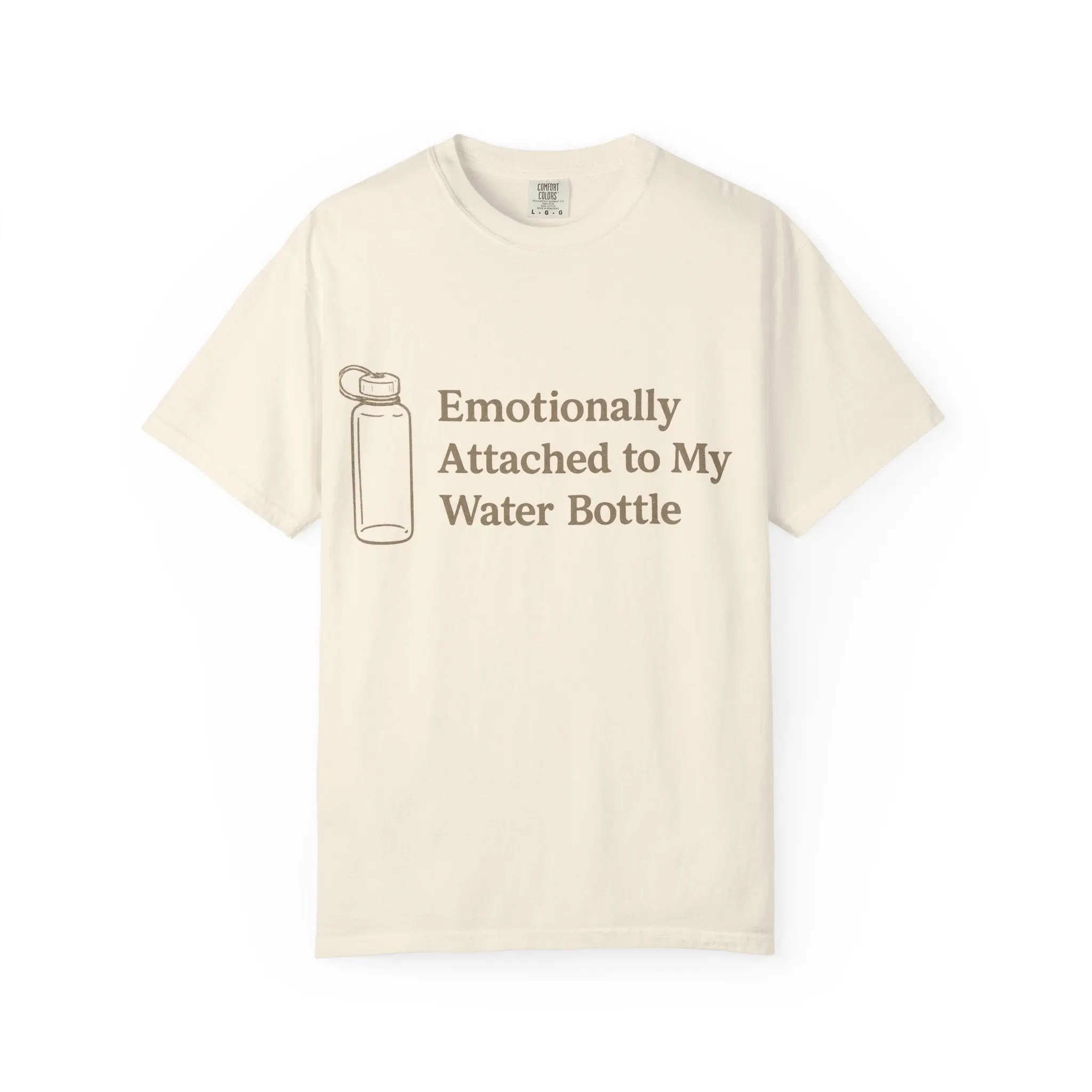 Soft, lived-in comfort with a wink. This garment-dyed tee feels like an old favorite from the first wear—weighty enough to hold its shape, but soft to the touch. A light, minimalist sketch of a water bottle sits beside the playful line “Emotionally Attached to My Water Bottle,” a quiet nod to people who carry hydration like a ritual. Wear it on morning walks, coffee runs, or lazy weekends; the relaxed cut and heavyweight cotton keep things cozy while the subtle print speaks your language without shouting. Available in many muted, garment-dyed hues that soften over time, it becomes more personal with every wash.