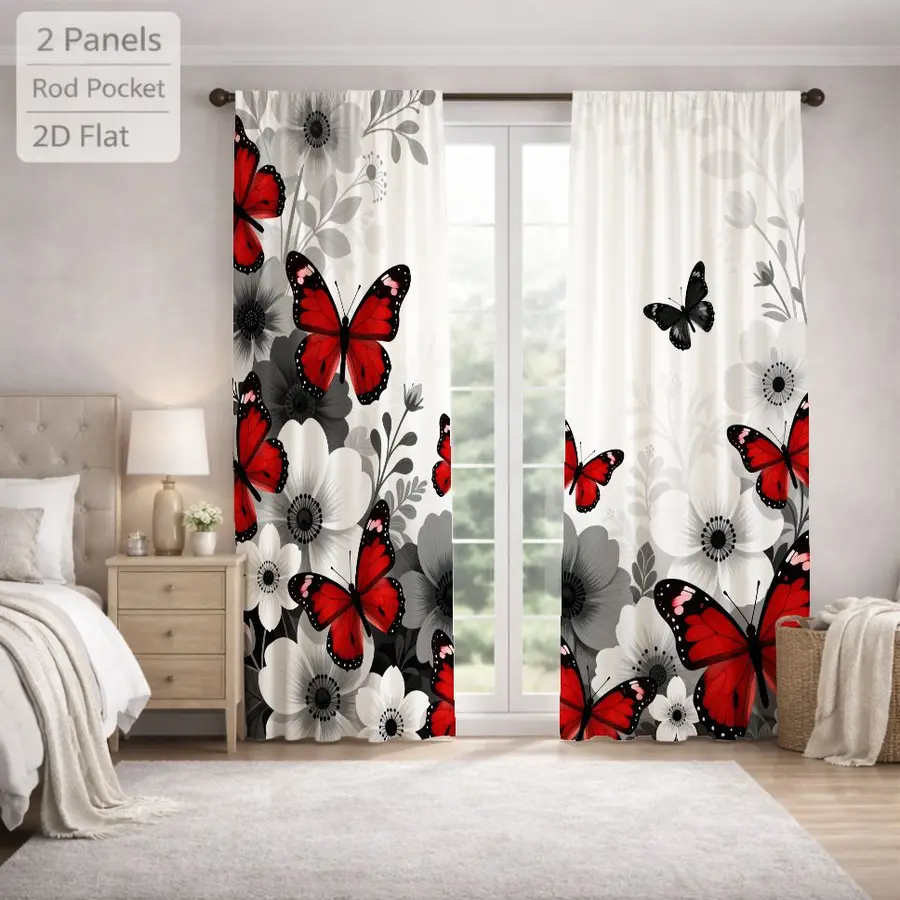 2Pcs Red Butterfly Floral Pattern Curtains Digital Printed Rod Pocket, Window Treatment For Bedroom Office Kitchen Living Room Study Home Decor