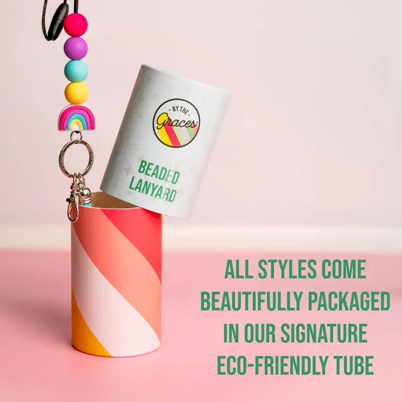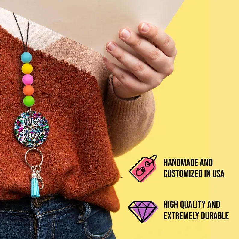 Our personalized lanyards are 40" long (easily shortened for the perfect fit!) and include silicone and wooden beads; no need to worry about them breaking!