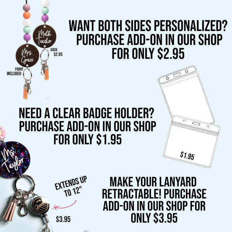 Each lanyard includes a beautiful acrylic name tag that is personalized with the text of your choice! All of the acrylic discs feature floral patterns.