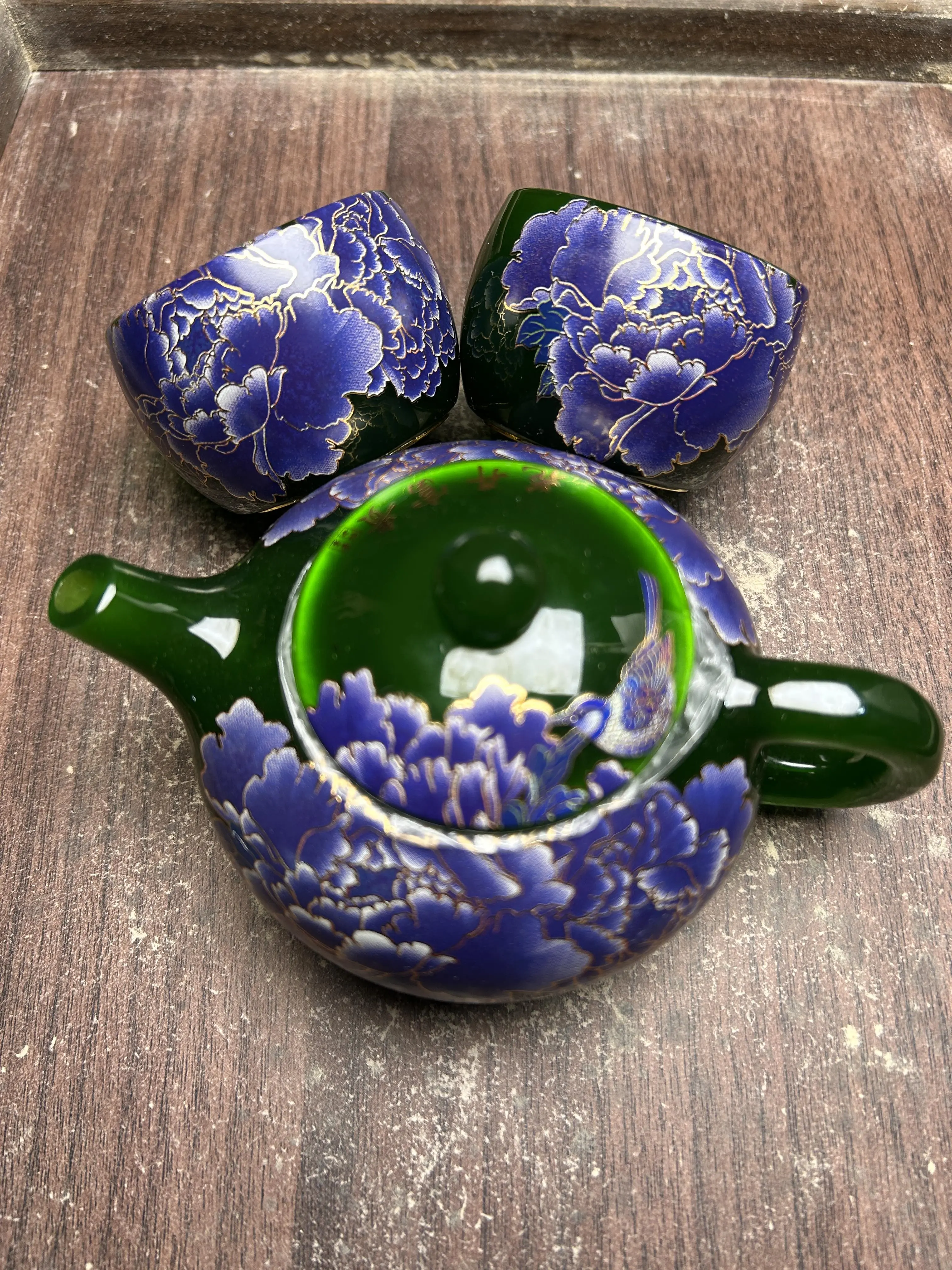 Color-Changing Green Peony Teapot Set with Golden Accents