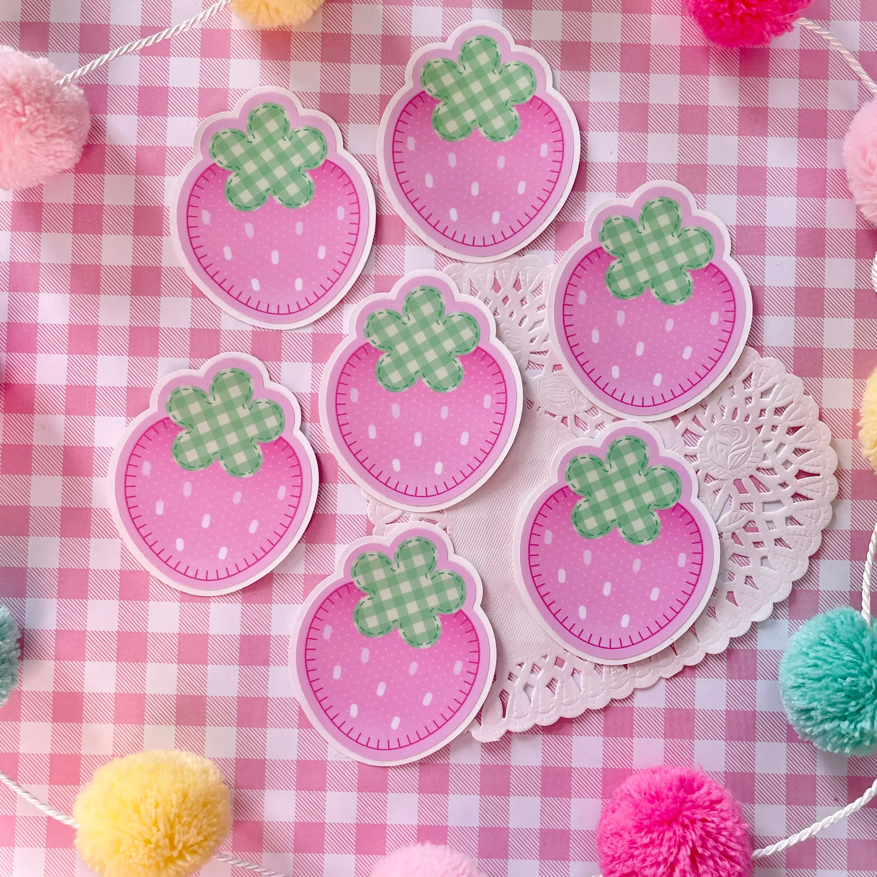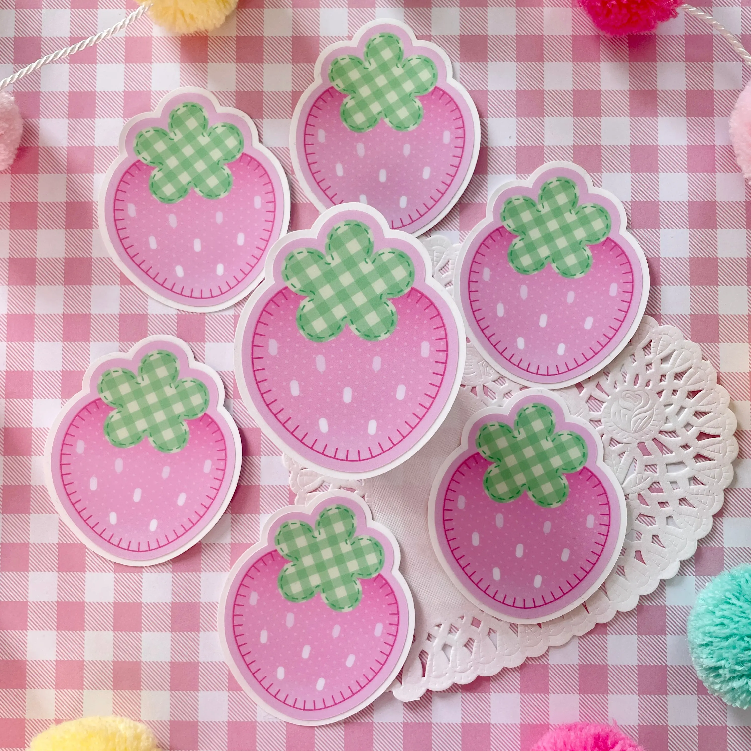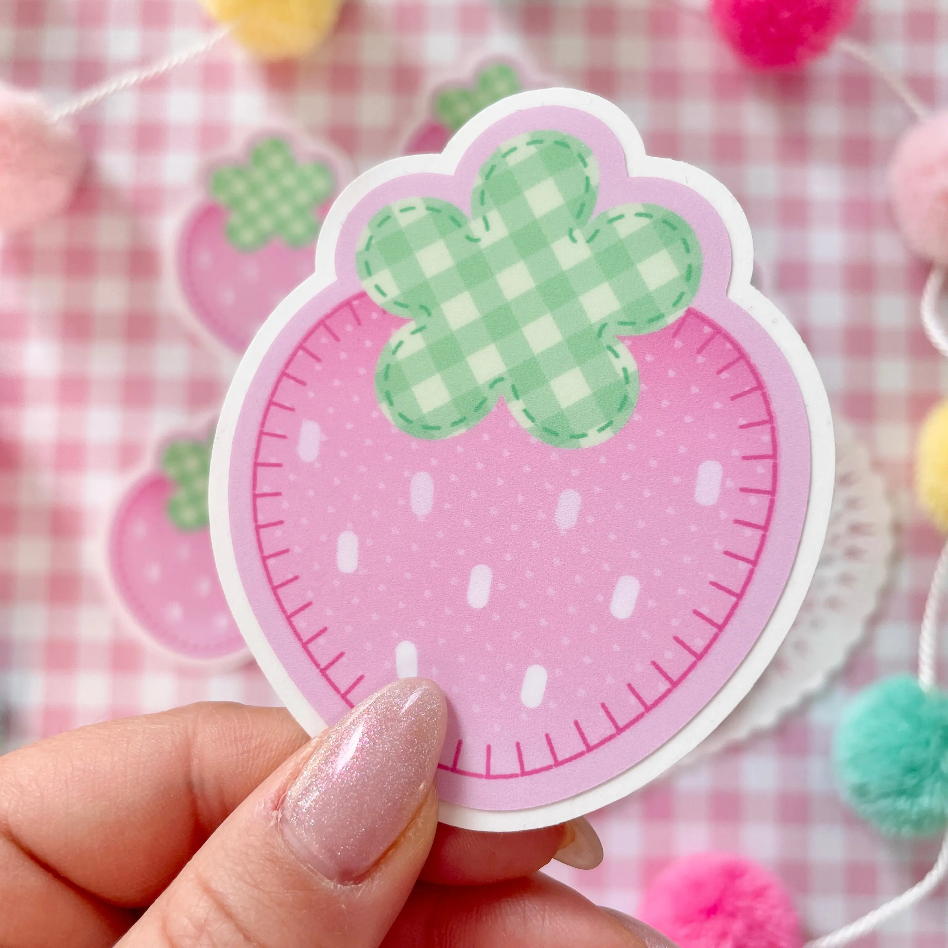 ✧˖° Cute, pink strawberry shaped sticker with light green gingham leaves and a subtle heart pattern on the fruit~