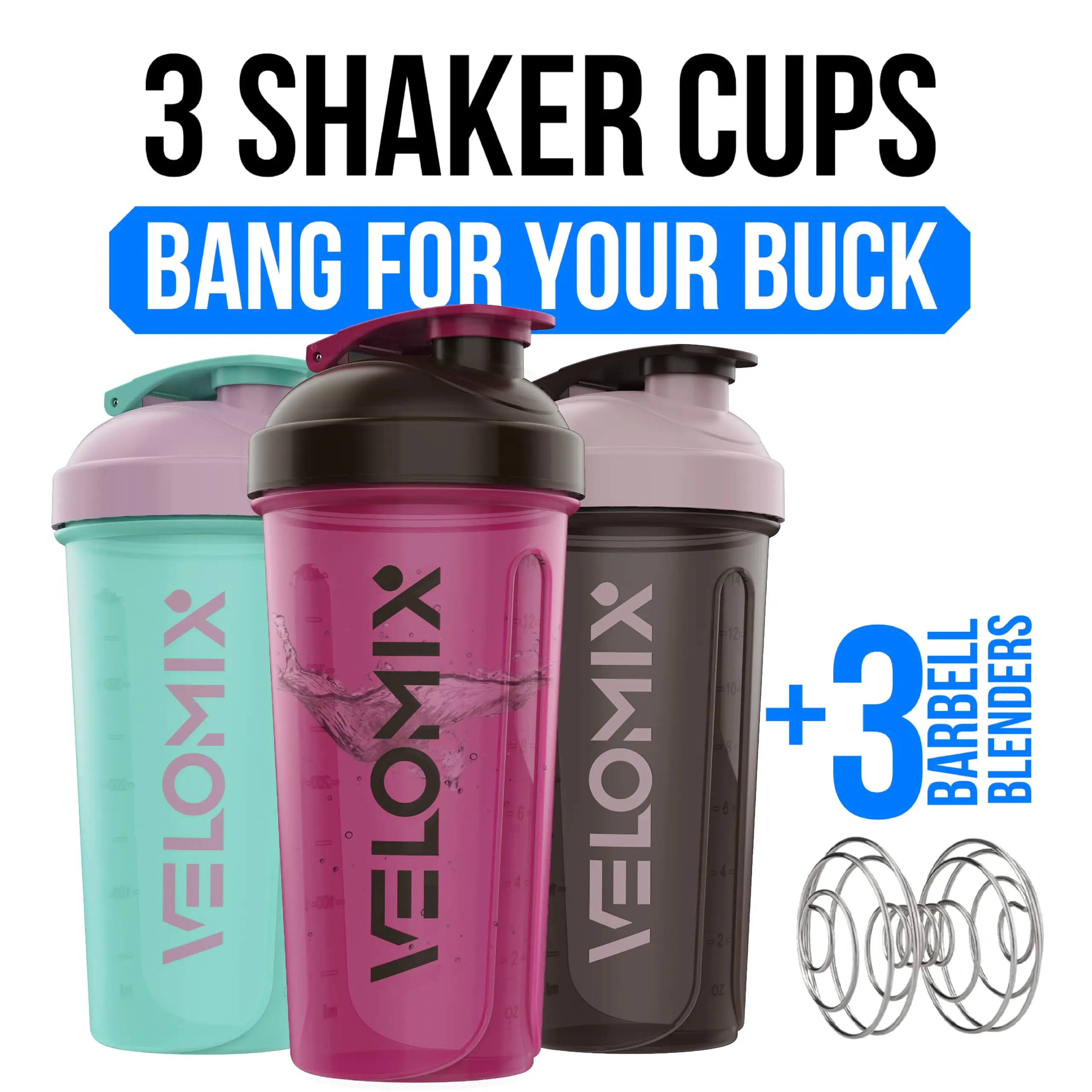 Velomix 3-Pack Protein Shaker Bottle With Wire Whisk for Shakes Leak Proof Stackable Dishwasher Safe Premium Quality Smart Price Built to Last