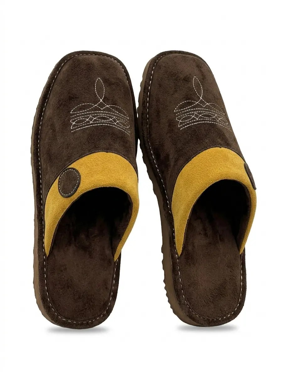 Cowboy Suede Slippers with Boot Stitch – Square Toe House Shoes for Men & Women, Indoor Outdoor