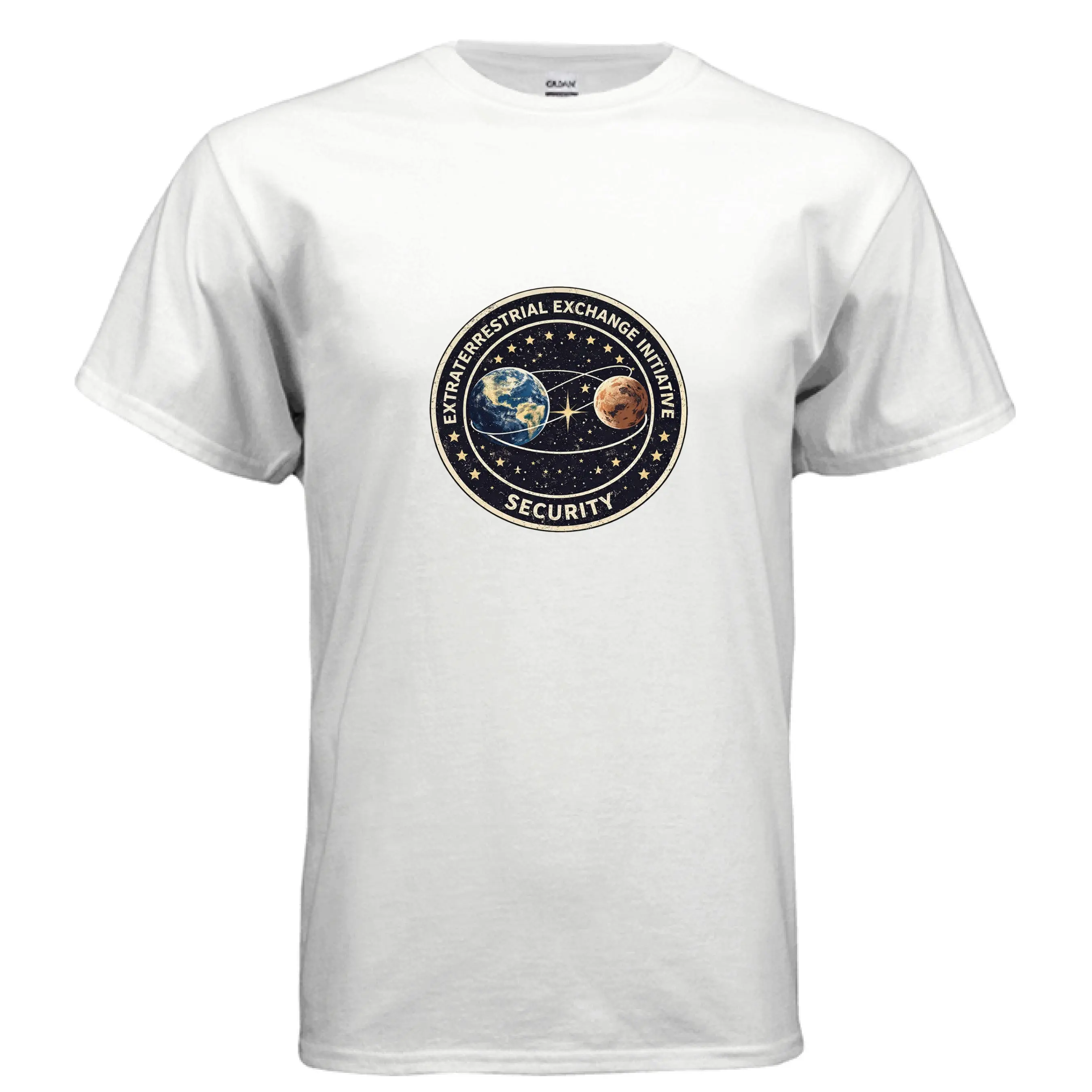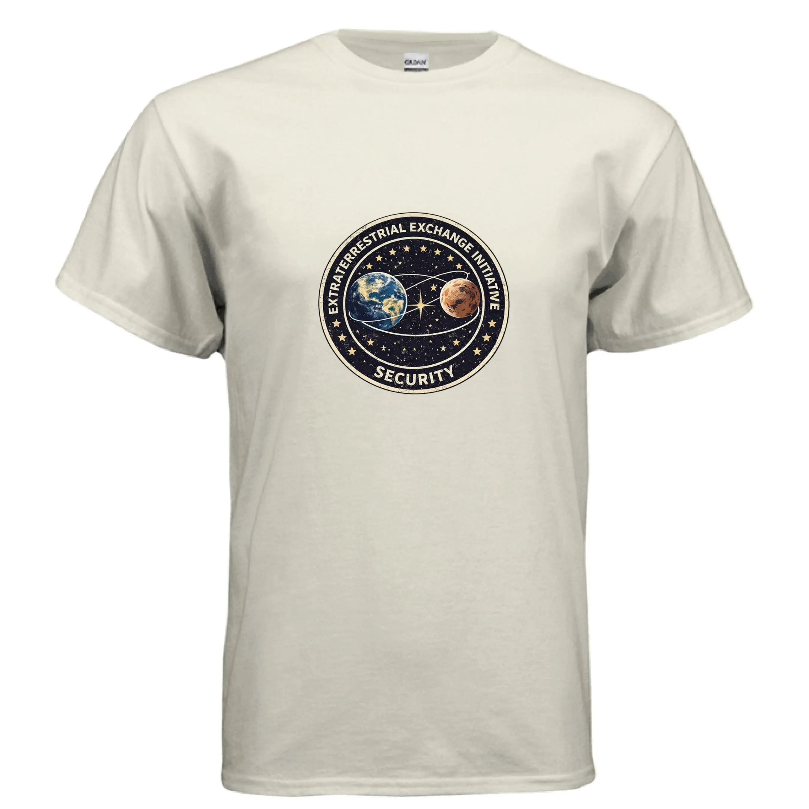 Crafted in a distressed, retro mission-patch style, this shirt feels like it came straight out of a declassified archive. The circular insignia, starfield backdrop, and orbital trajectory lines evoke a covert exchange program operating far beyond public knowledge. It’s the perfect piece for fans of UFO lore, conspiracy culture, sci-fi aesthetics, and military-style insignias.