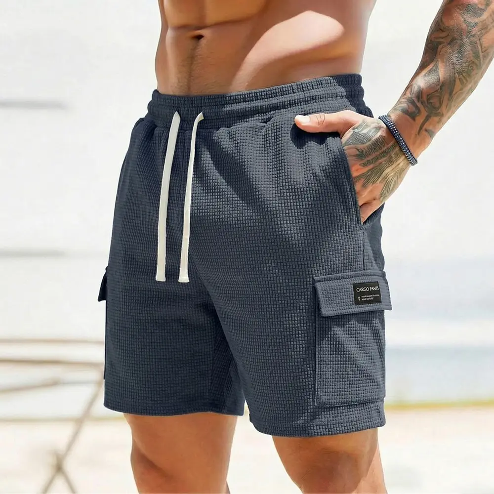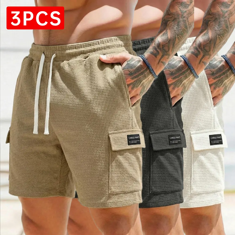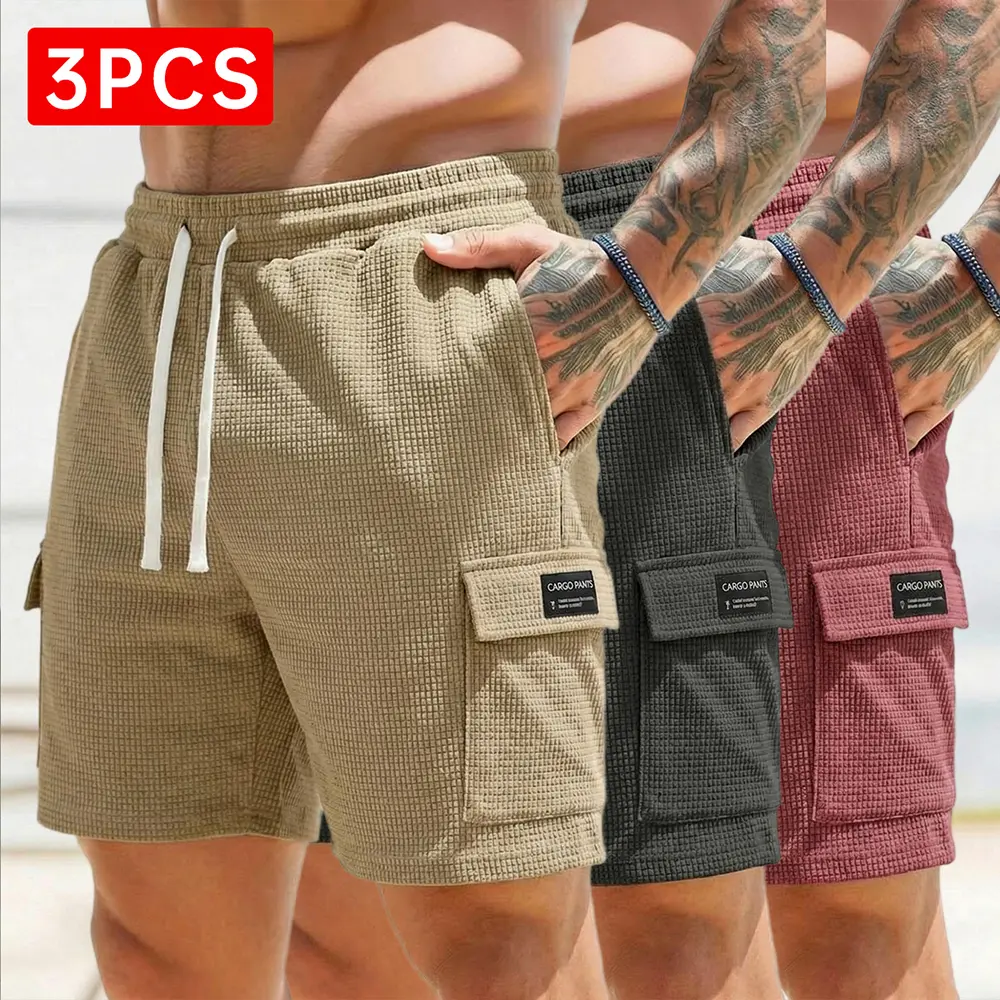 3-pack men’s waffle cargo shorts with a drawstring elastic waistband—breathable and comfortable, slimming and versatile, featuring textured fabric and multiple pockets—ideal for everyday summer outings.