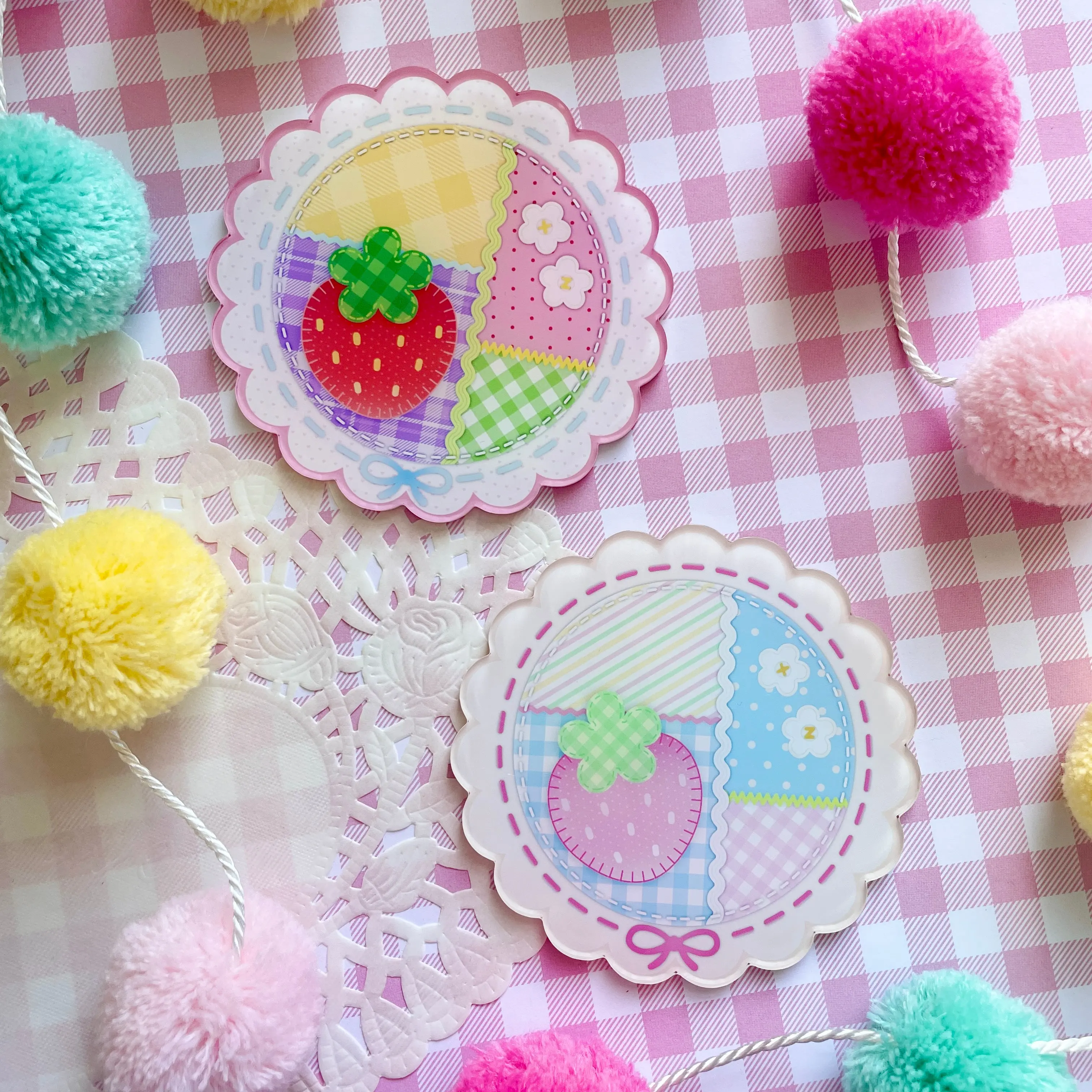 ─★⸝⸝🍓‧₊ !! Scalloped acrylic coaster with a quirky patchwork quilt theme