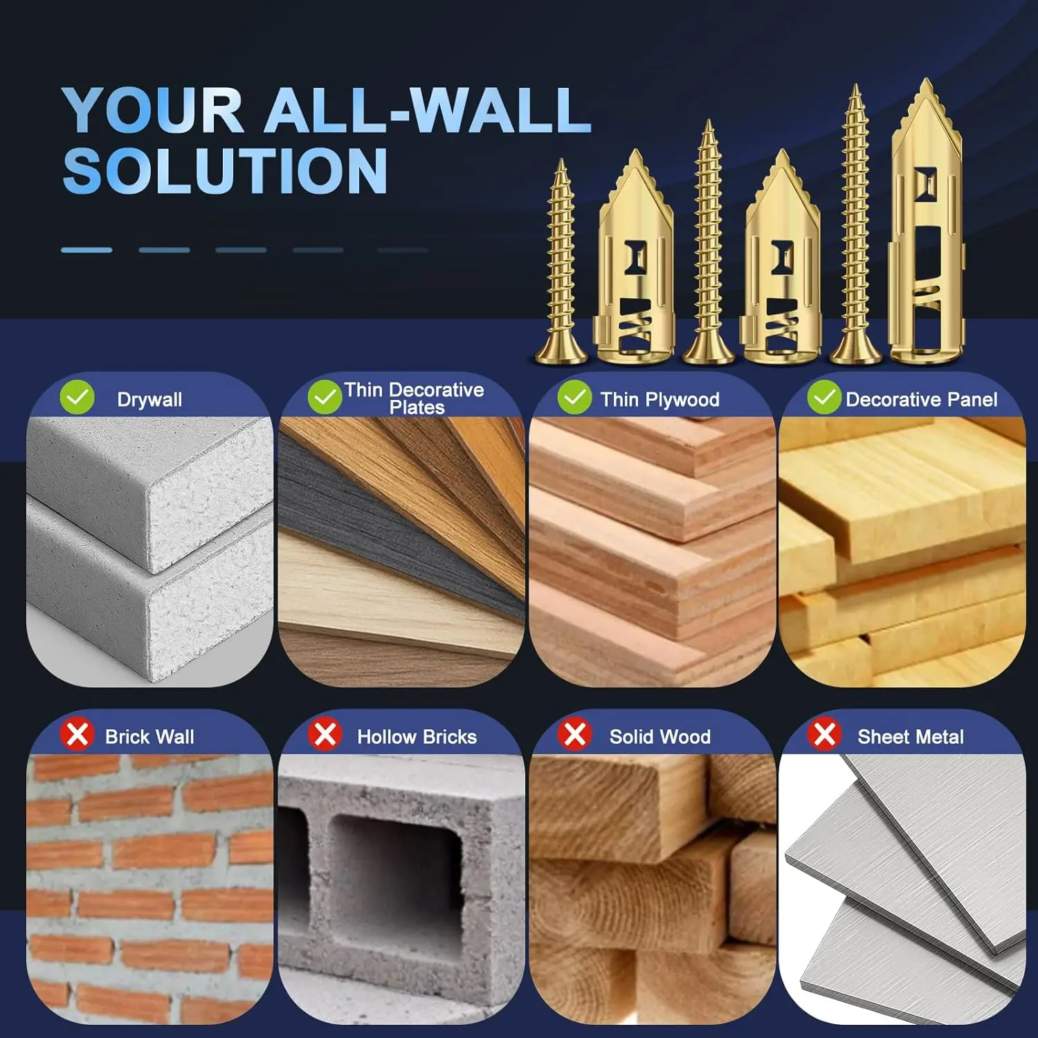 ·Reusable for All Walls: Works perfectly in drywall, gypsum, hollow & lightweight bricks. The metal anchor stays in place when you remove the screw, allowing endless adjustments and reuse. A durable, cost-effective solution vs. weak plastic anchors