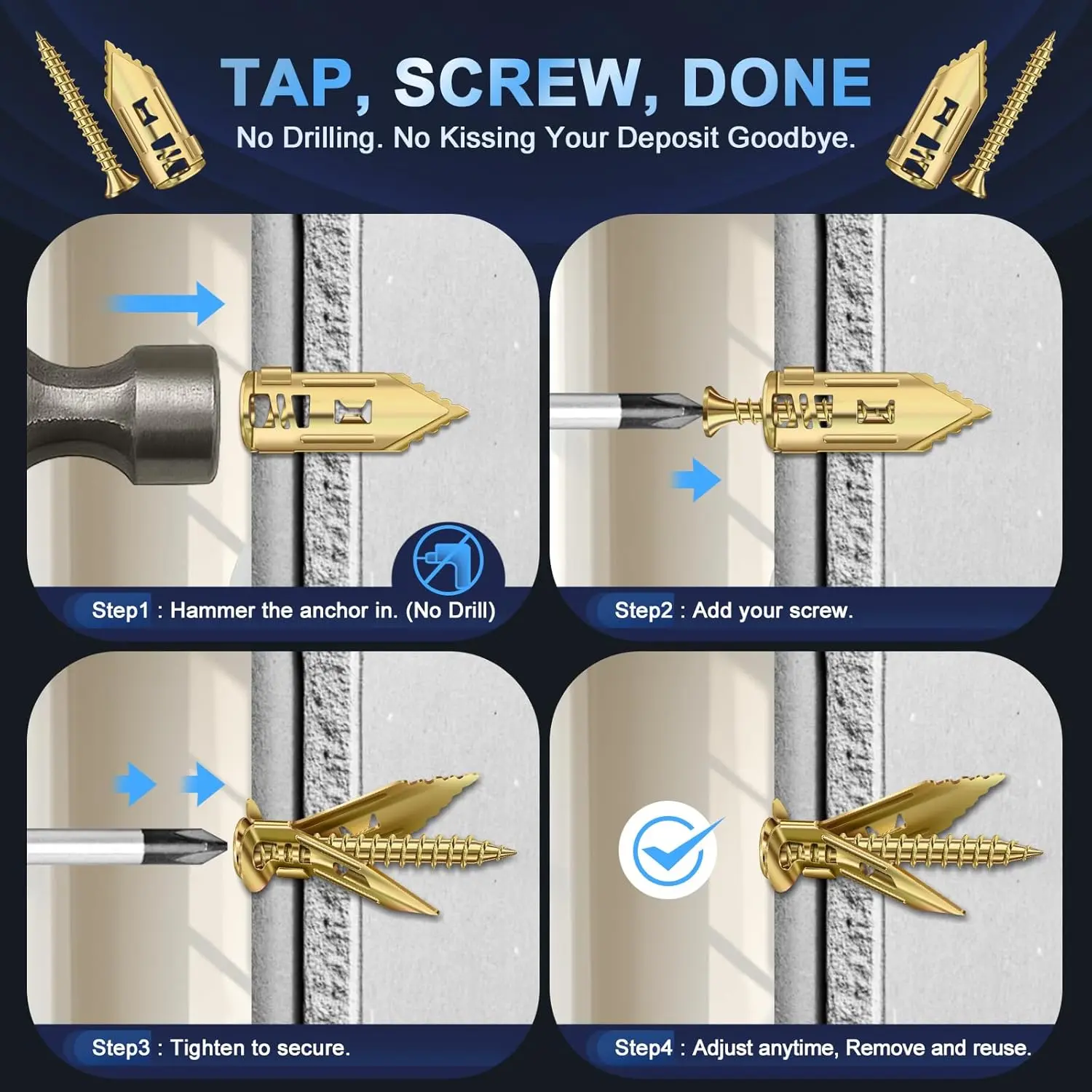 ·Simply tap the metal anchor directly into the drywall using a hammer. No drilling, no dust!