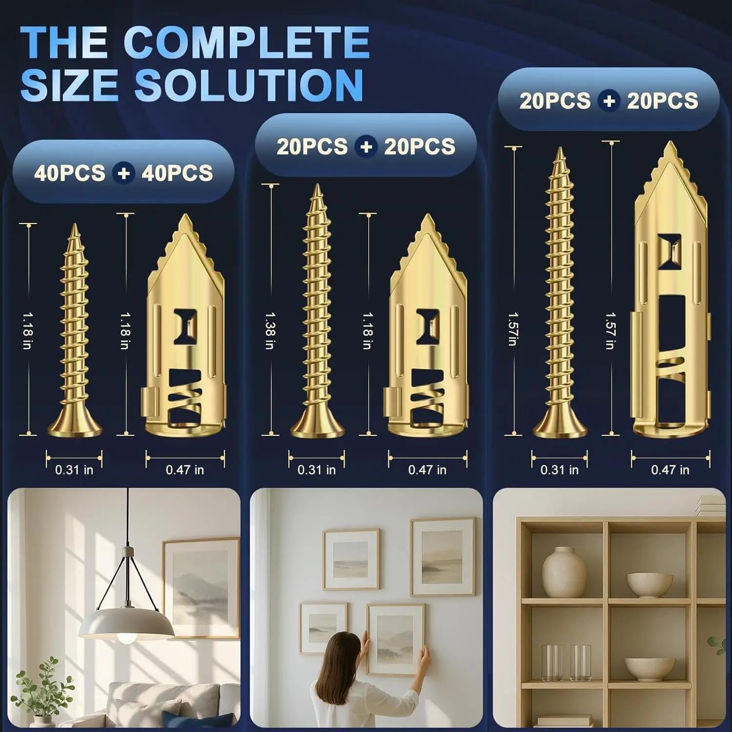 ·Complete 3-Size Anchor Kit: 80pcs 1.18 in, 40pcs 1.38 in, 40pcs 1.57 in anchors with matching screws. Match size to wall thickness & object weight. Hang pictures, shelves, or heavy TVs with confidence. No more buying separate kits