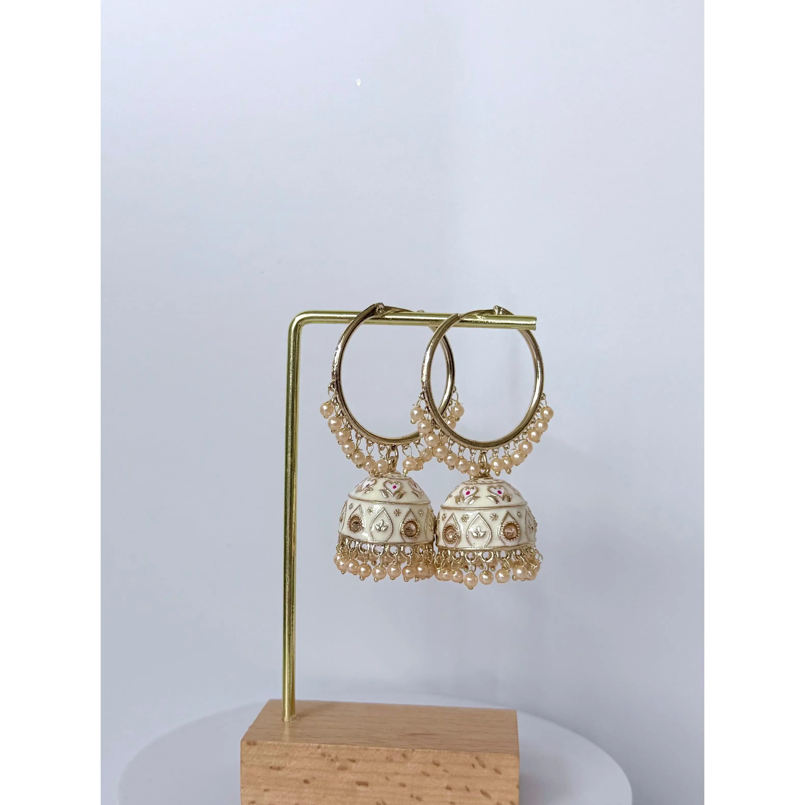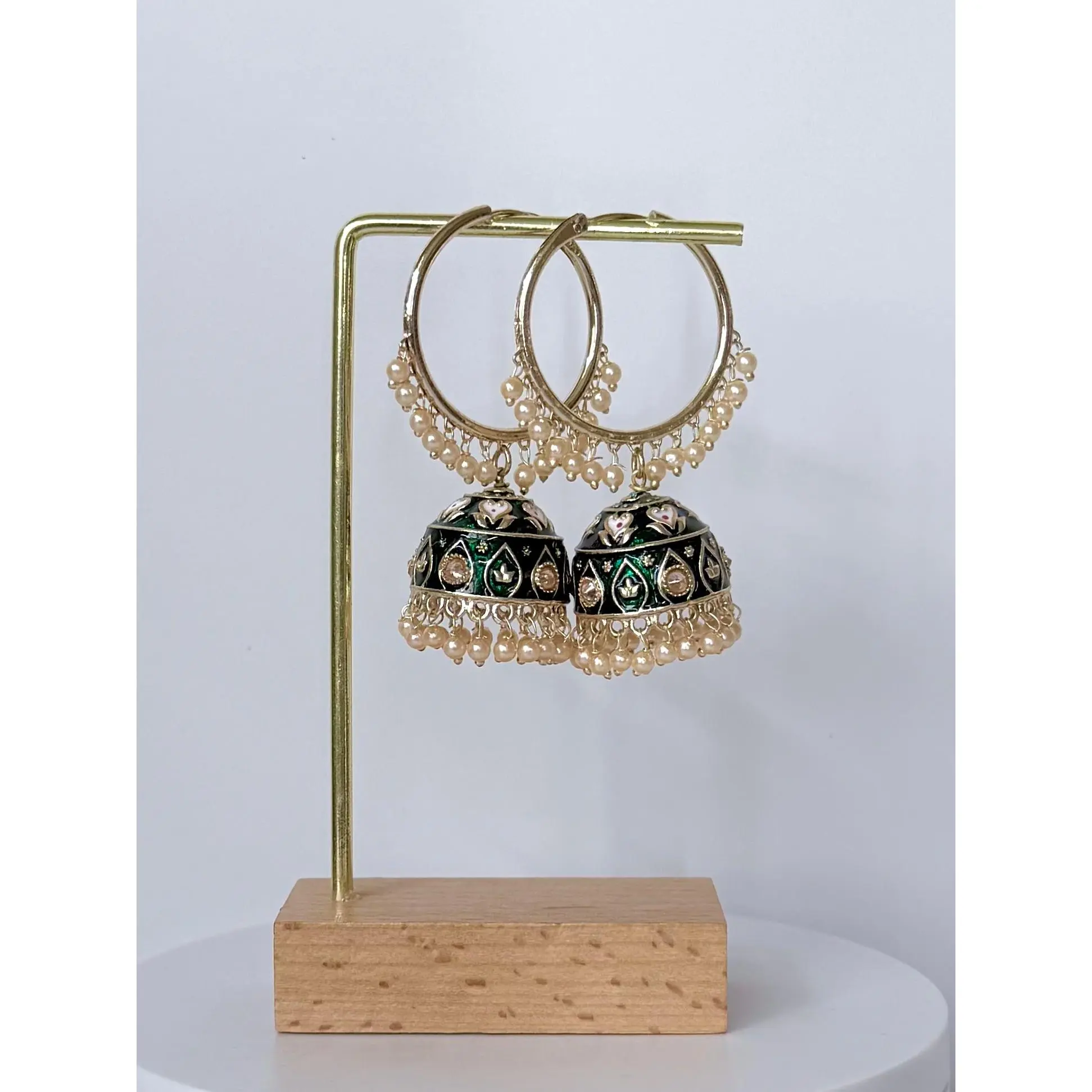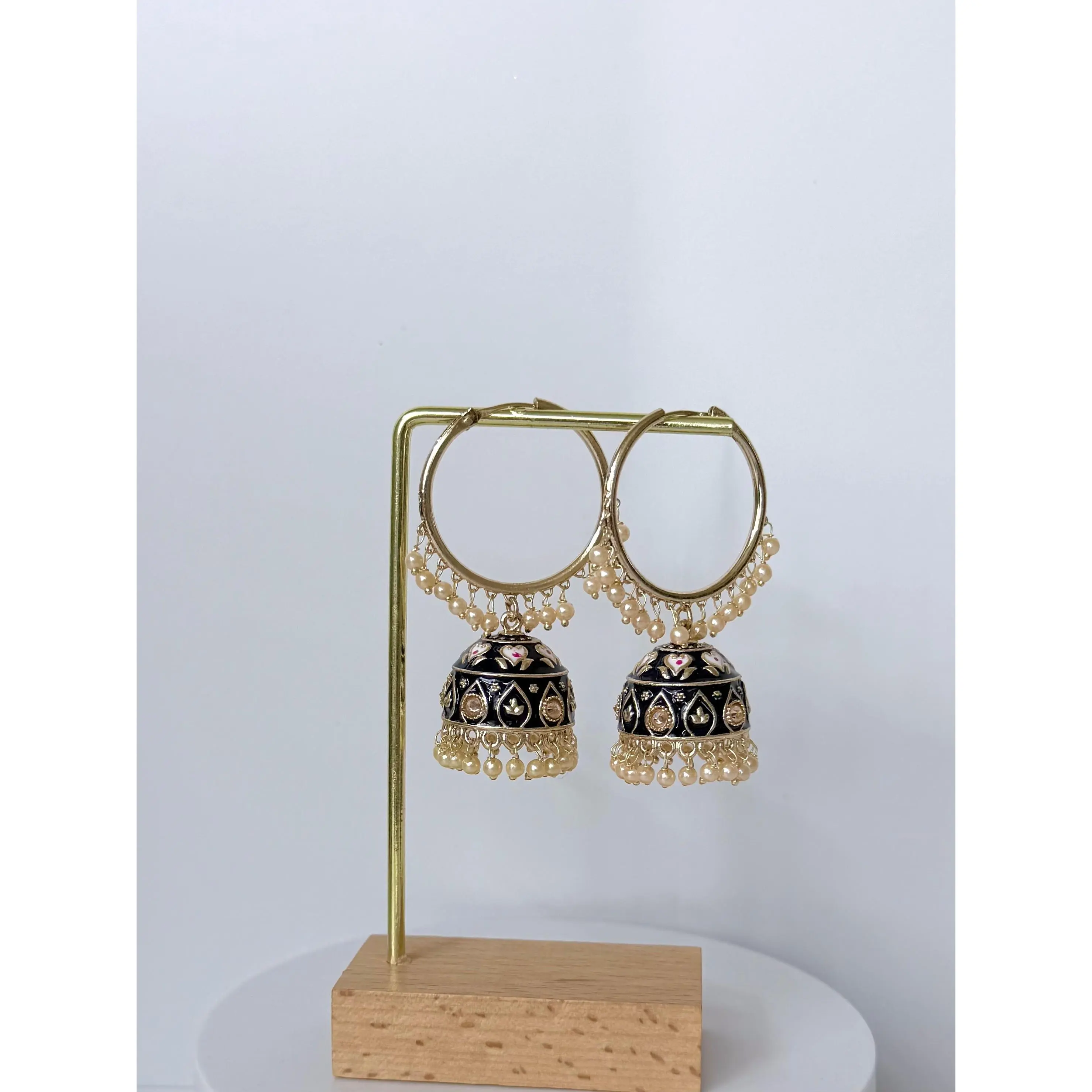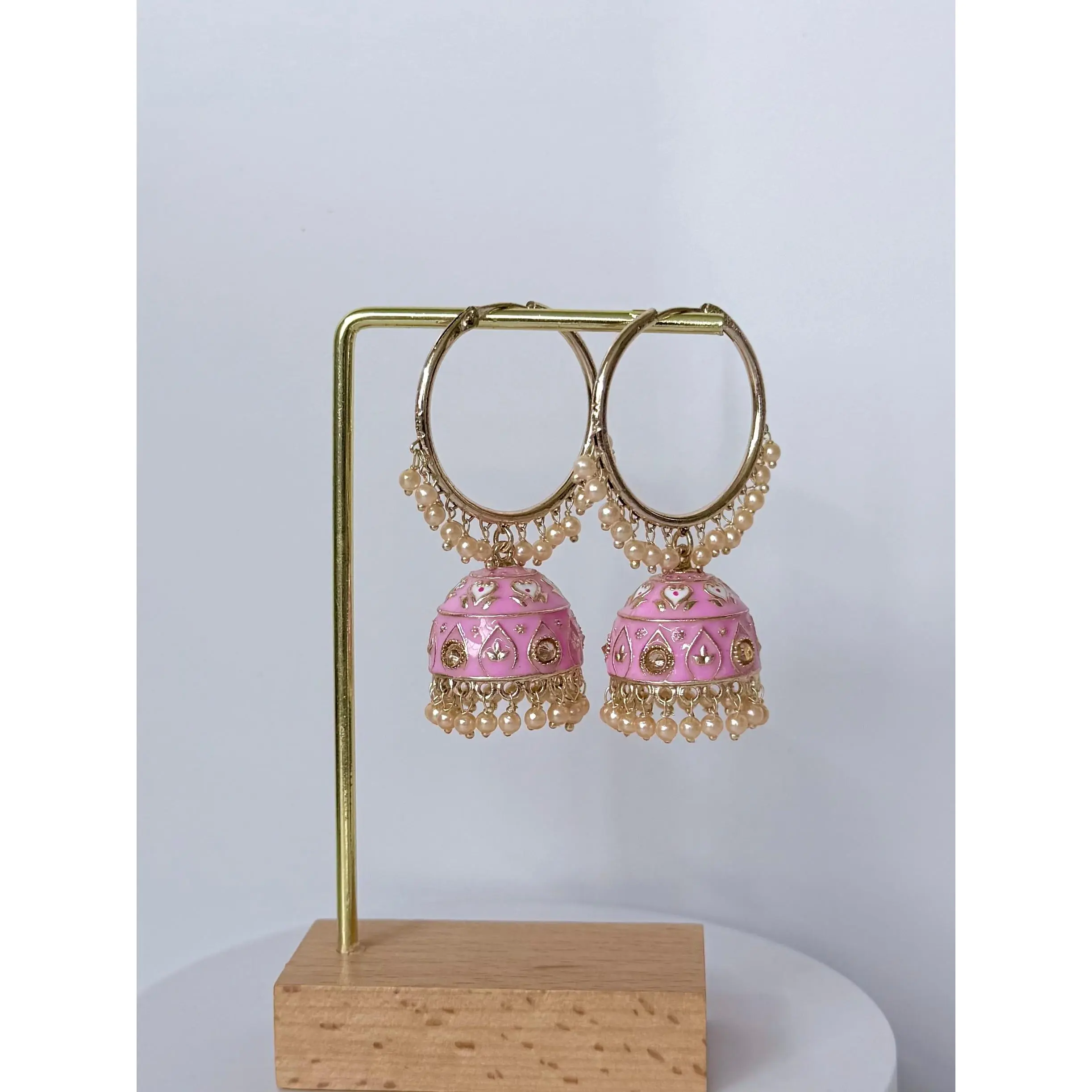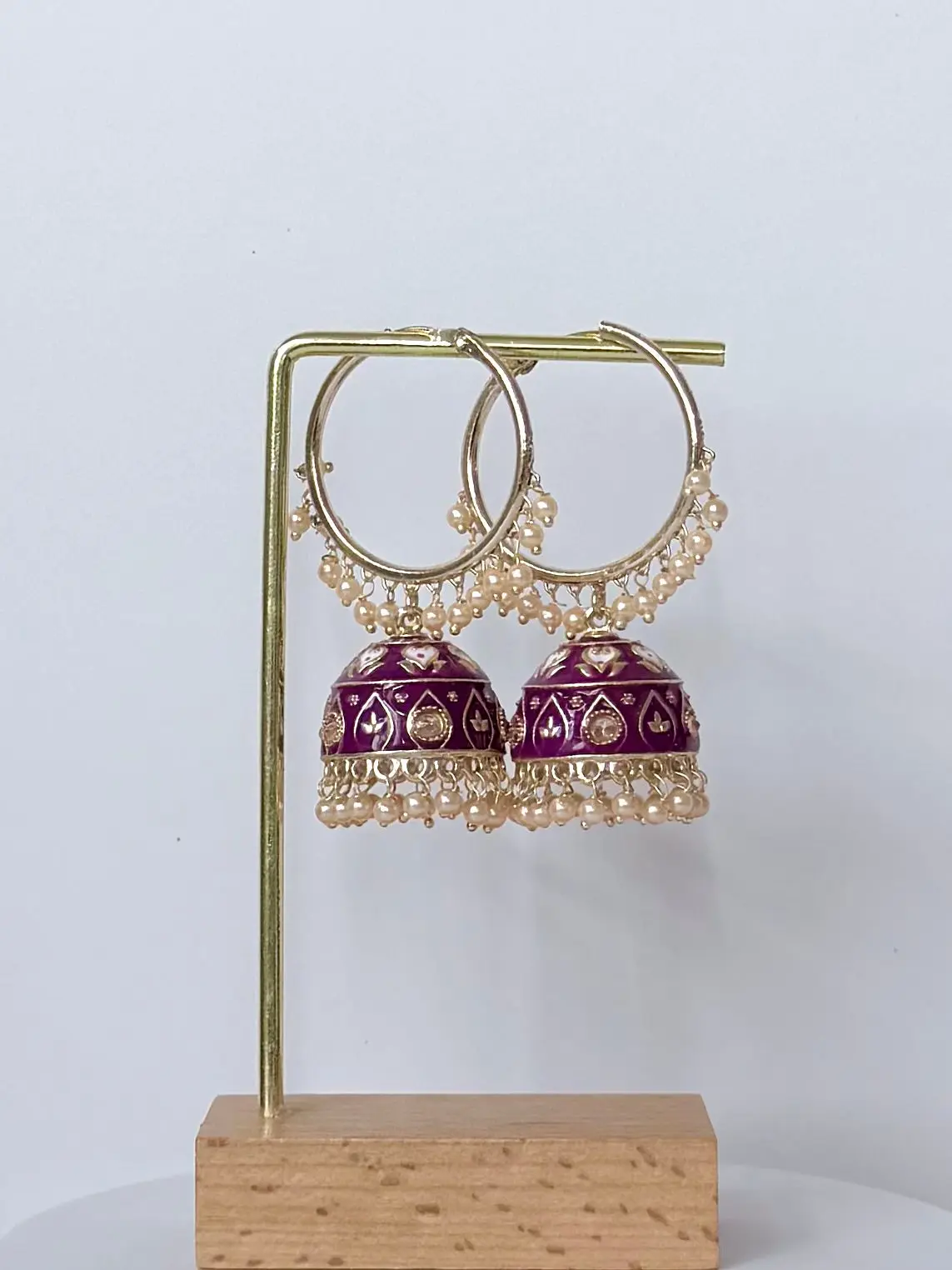 Intricately handcrafted meenakari bali jhumkas featuring vibrant enamel detailing and a classic dome silhouette. The delicate hand-painted work adds a pop of color, while the lightweight bali hoops ensure all-day comfort. Finished with elegant ghungroo accents for that subtle traditional charm, these jhumkas are perfect for festive wear, weddings, or elevating your everyday ethnic look.