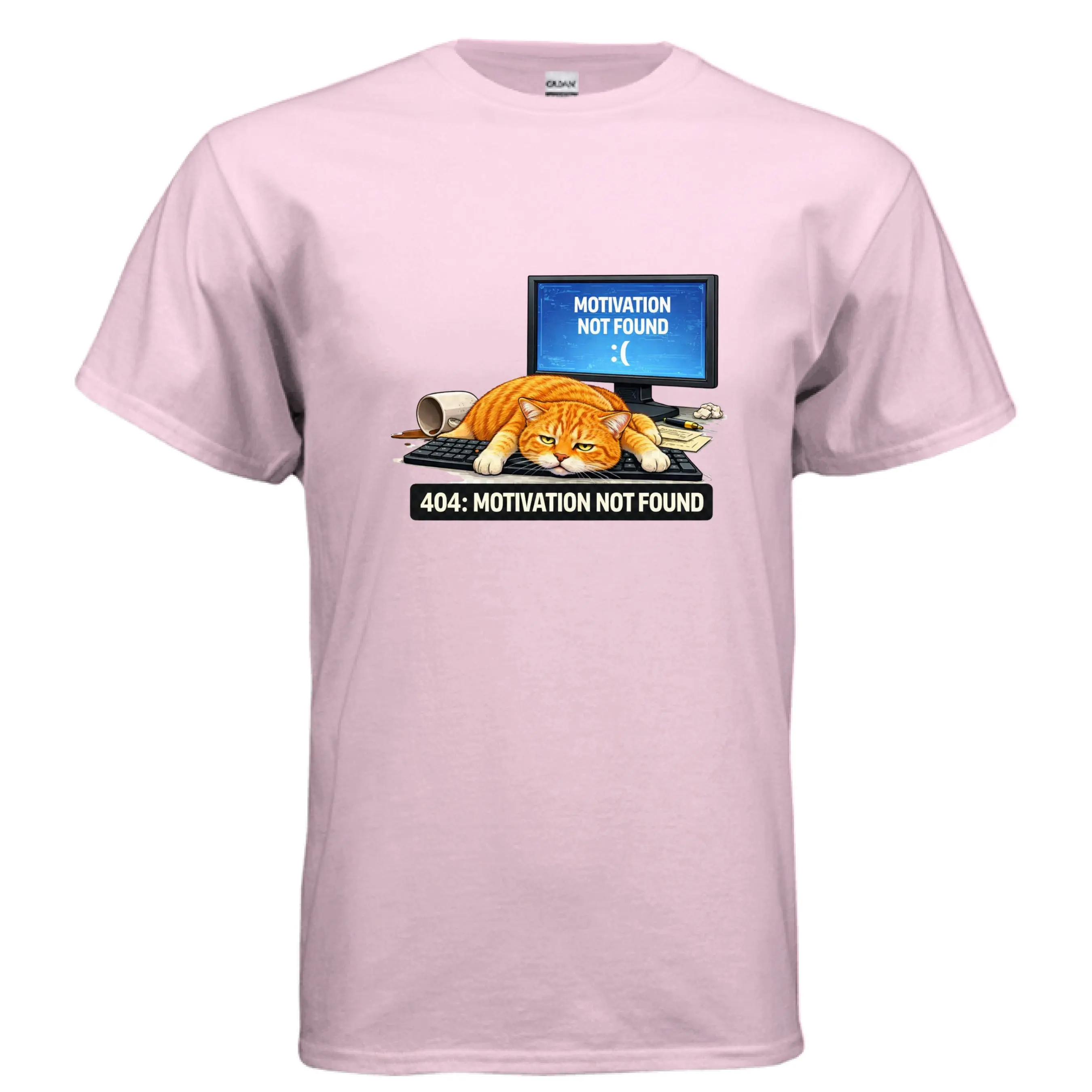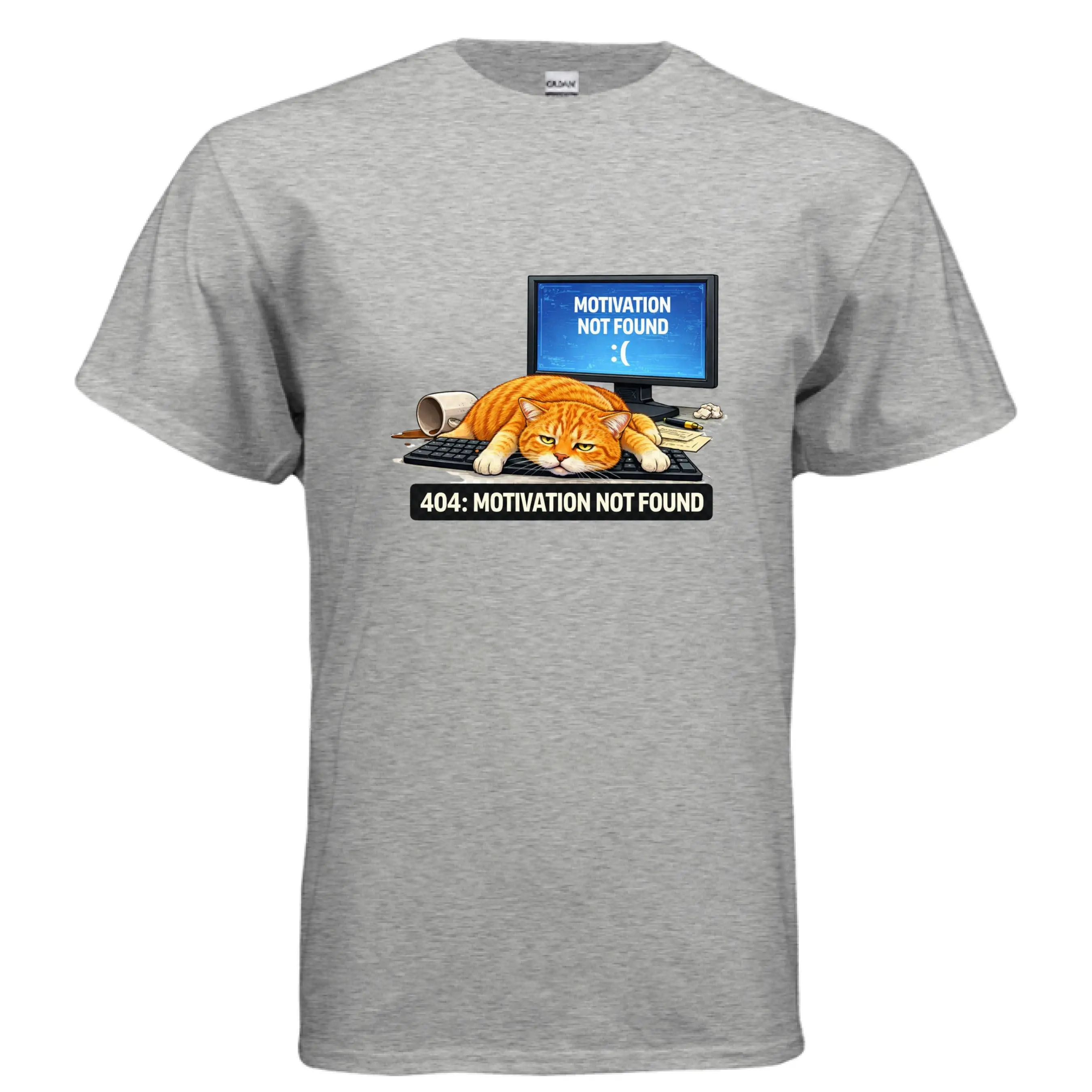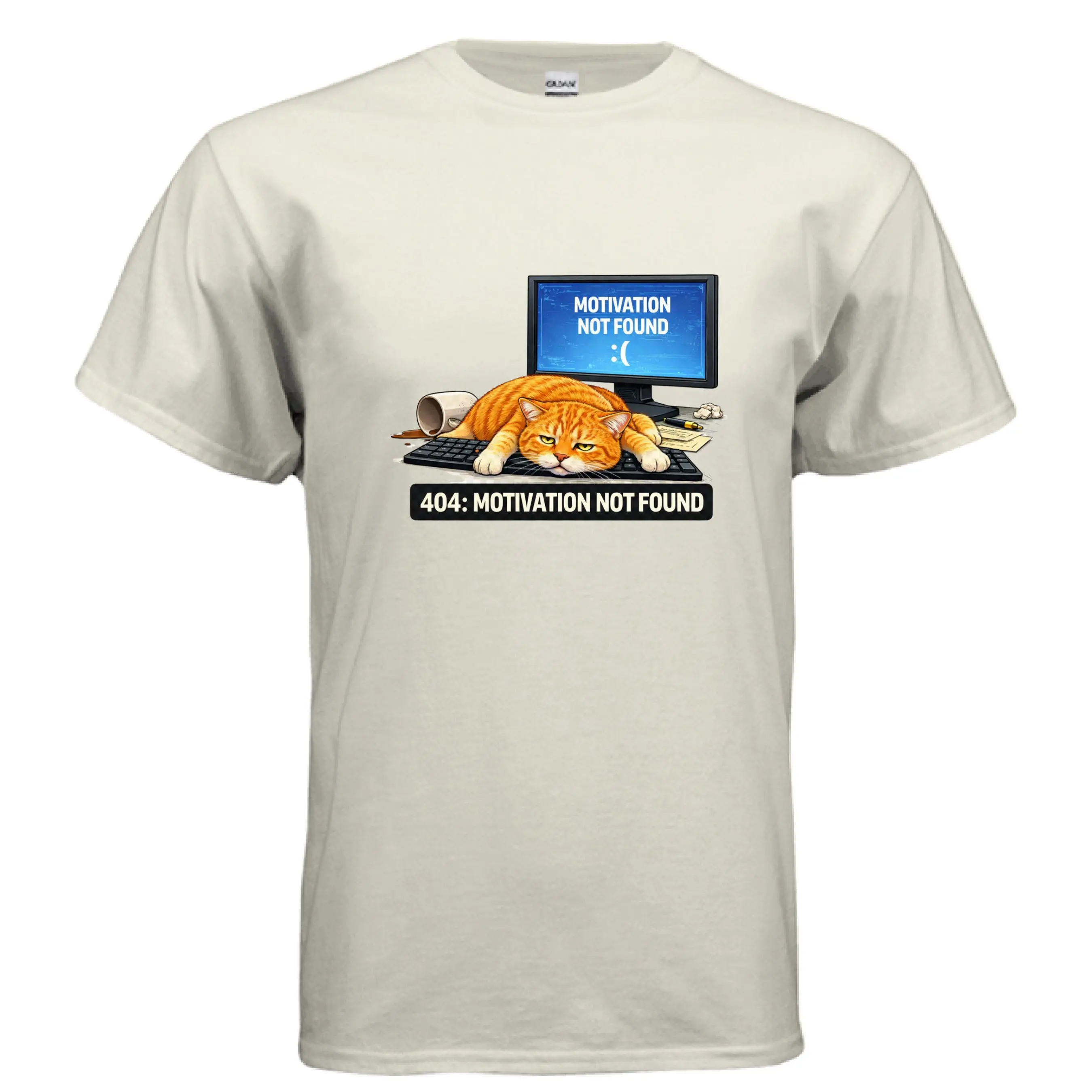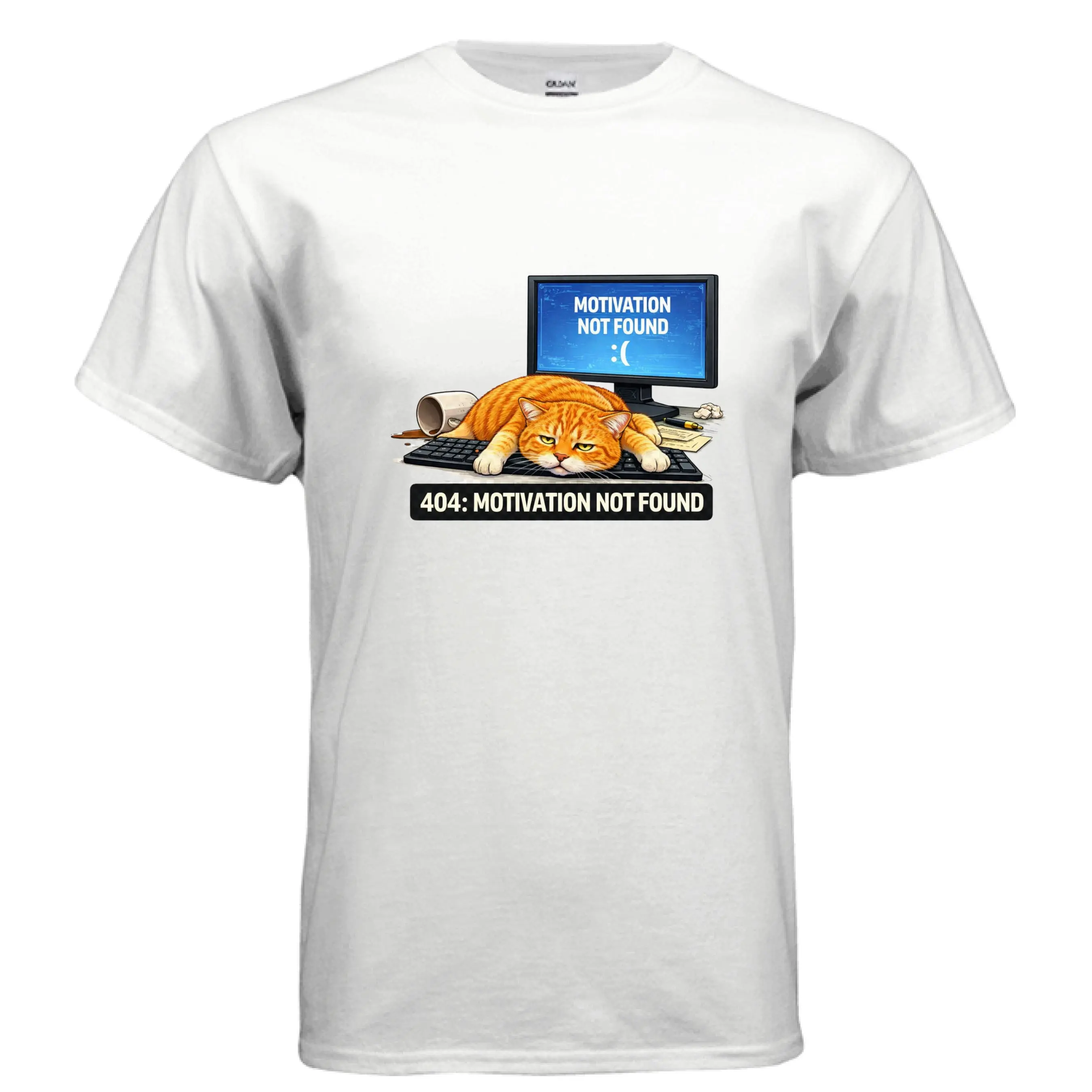 Featuring a hilariously unmotivated orange tabby sprawled across a keyboard, paired with a glowing screen that reads “Motivation Not Found,” this design captures the exact moment your ambition logs off for the day. Whether you're coding, working from home, procrastinating, or just embracing the chaos of modern life, this tee delivers relatable humor with a clean, bold visual.