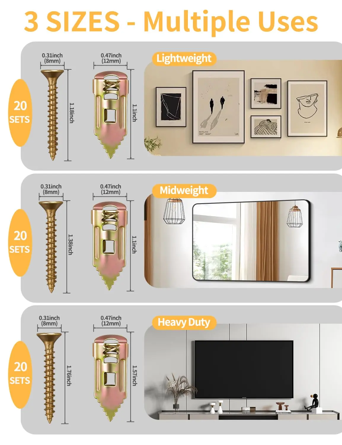 ·3 SIZES FOR EVERYTHING – PHOTO FRAMES TO TVs: 1.18"(1-3/16") for photos & small decor, 1.38"(1-3/8") for shelves & mirrors, 1.76"(1-9/16") for TVs & heavy items.No guesswork-just match the drywall anchors to your wall thickness and what you're hanging. Supports up to 100 lbs+ without fail
