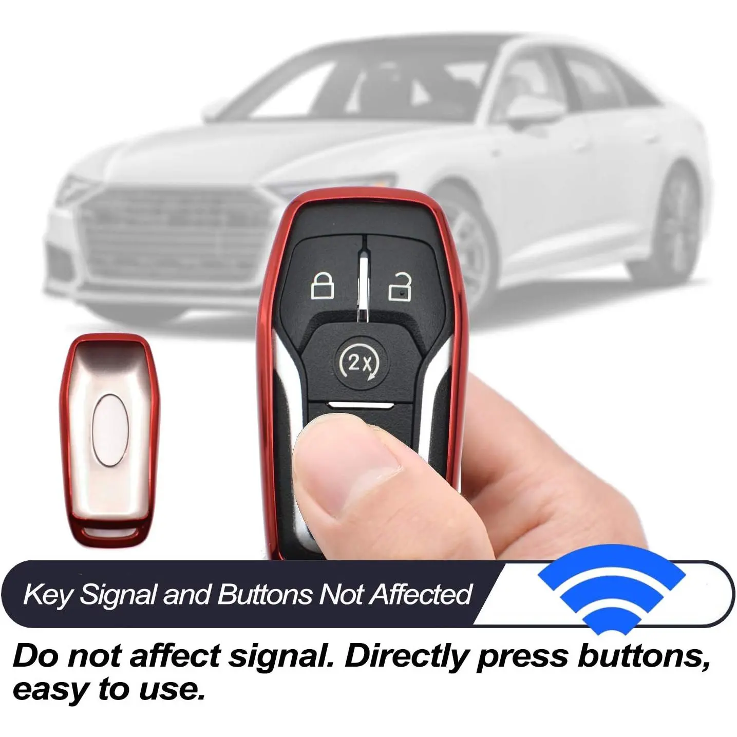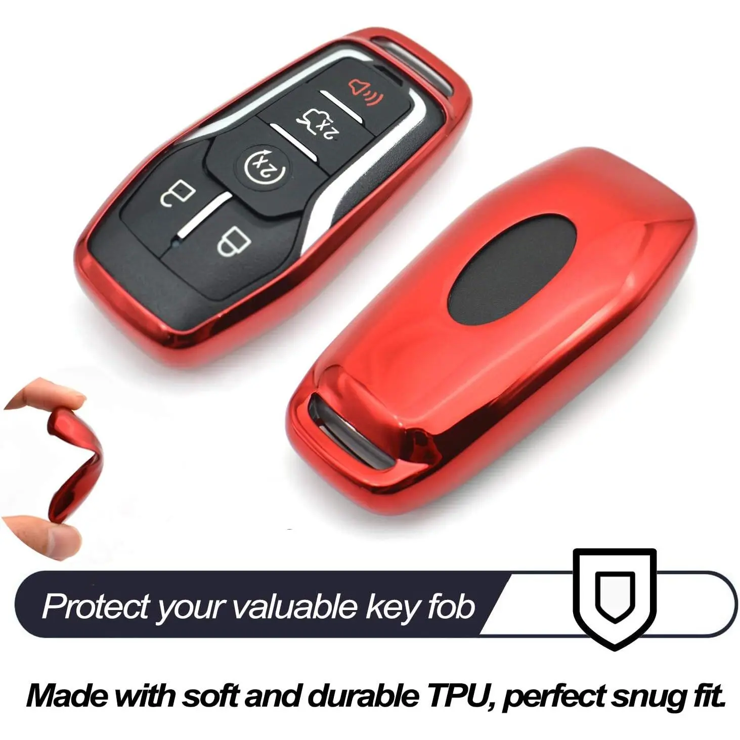 This key fob cover fits Ford and Lincoln models like Edge, Explorer, Fusion, Mustang, Expedition, F-150, F-250, F-350, F-450 Super Duty, Transit-150, 250, 350 HD, Lincoln MKC, MKX, MKZ, Nautilus. It's a red key fob cover, not for flip keys. Perfect for car enthusiasts who value compatibility and reasonable pricing.
