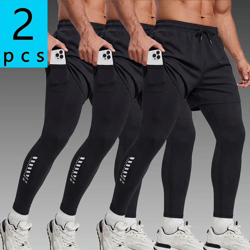 3-pack, 2-in-1 men’s athletic pants for summer—faux two-piece design with letter print running/fitness long pants featuring a pocket; lightweight and comfortable; suitable for spring/summer everyday outdoor training and jogging; built-in phone pocket