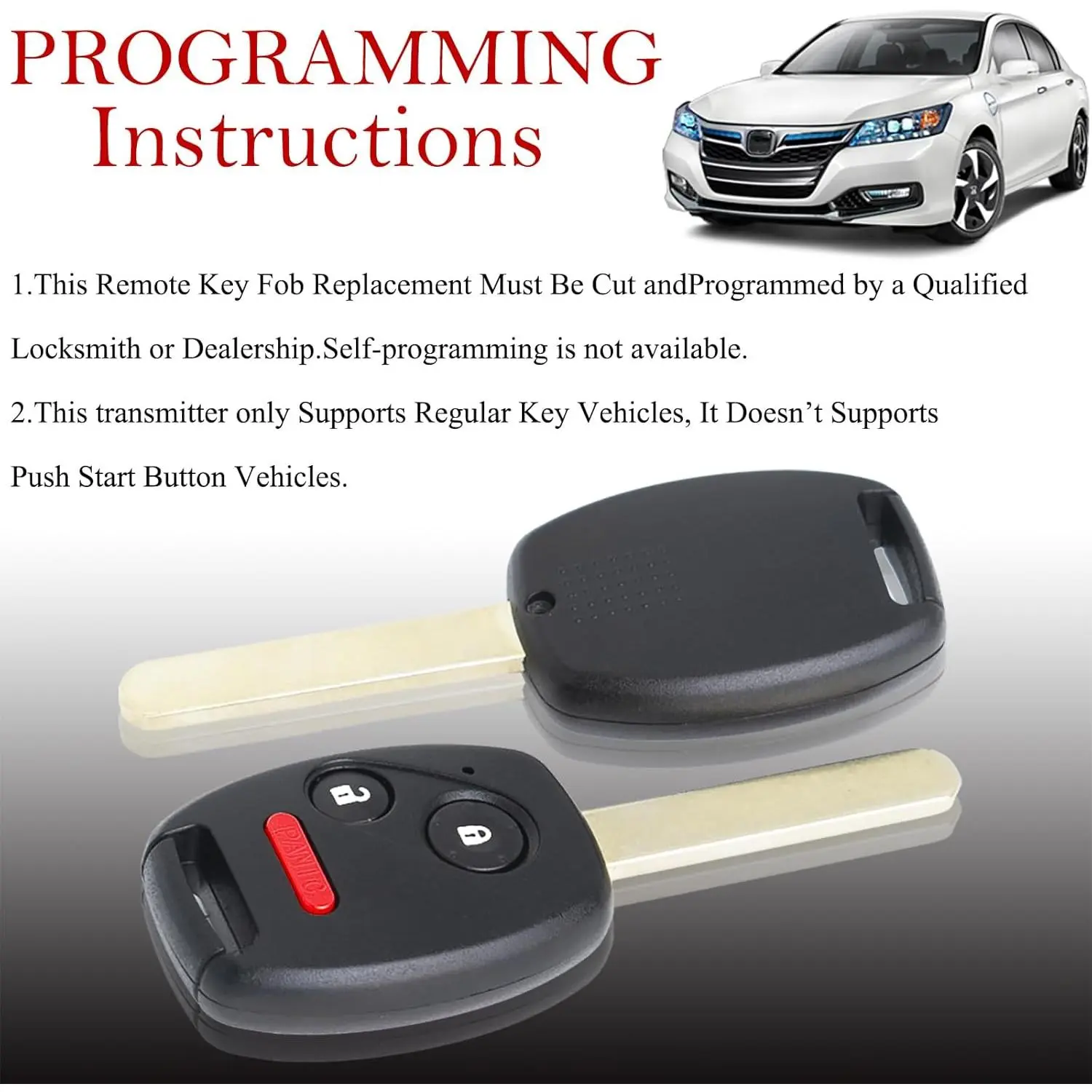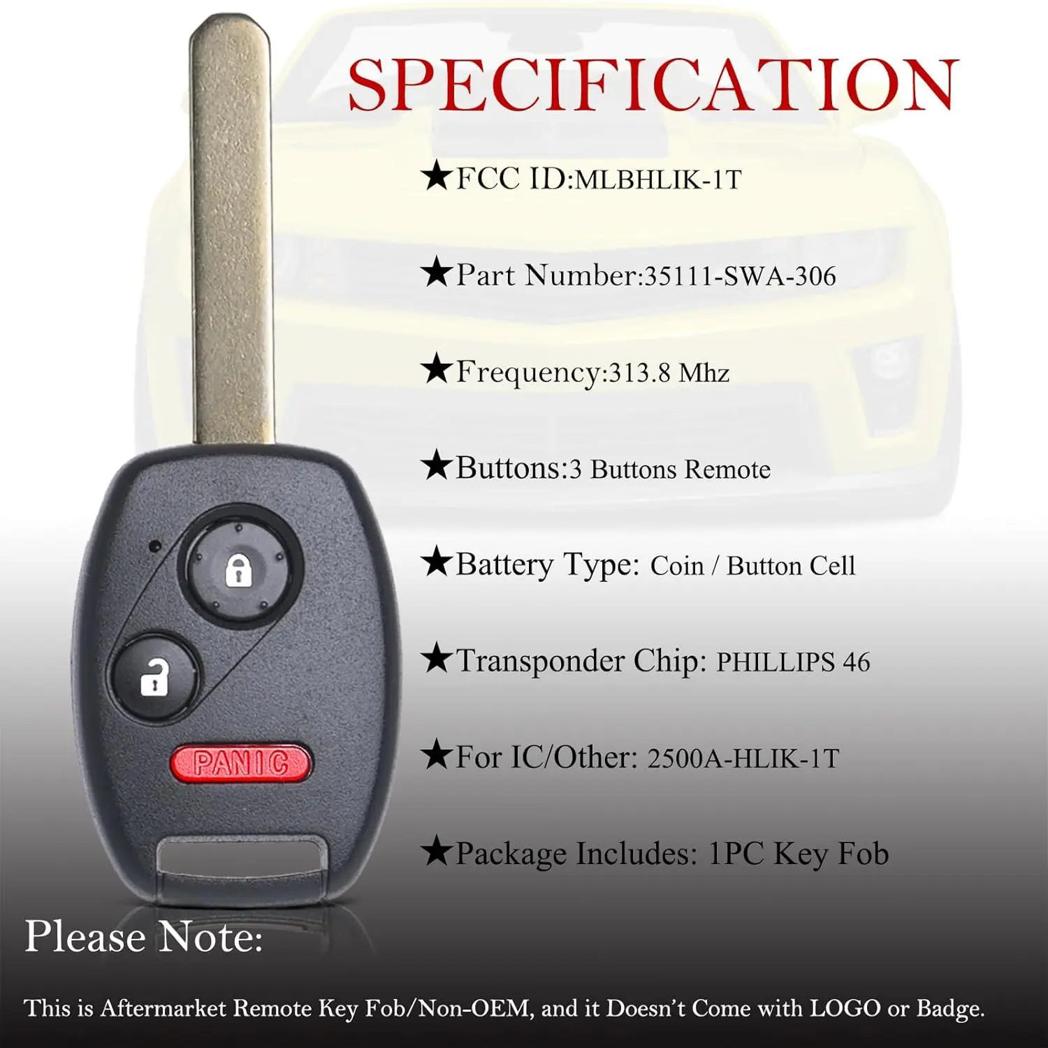 This key fob remote fits Honda CRV, CRZ, Accord Crosstour, Pilot, Civic, Acura MDX, Accord, and Element. It supports models from 2005 to 2015. The remote has 3 buttons and a 46 Chip. It's ready to program but requires a locksmith or dealership for setup. No logo or badge included. Not for push start vehicles.
