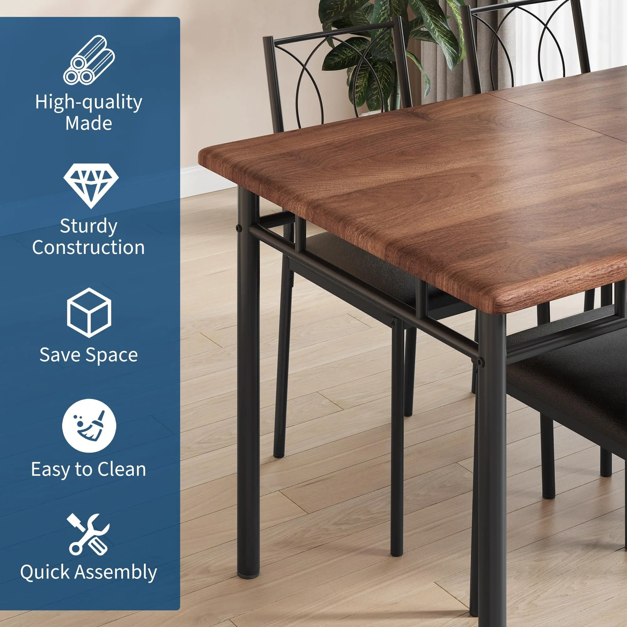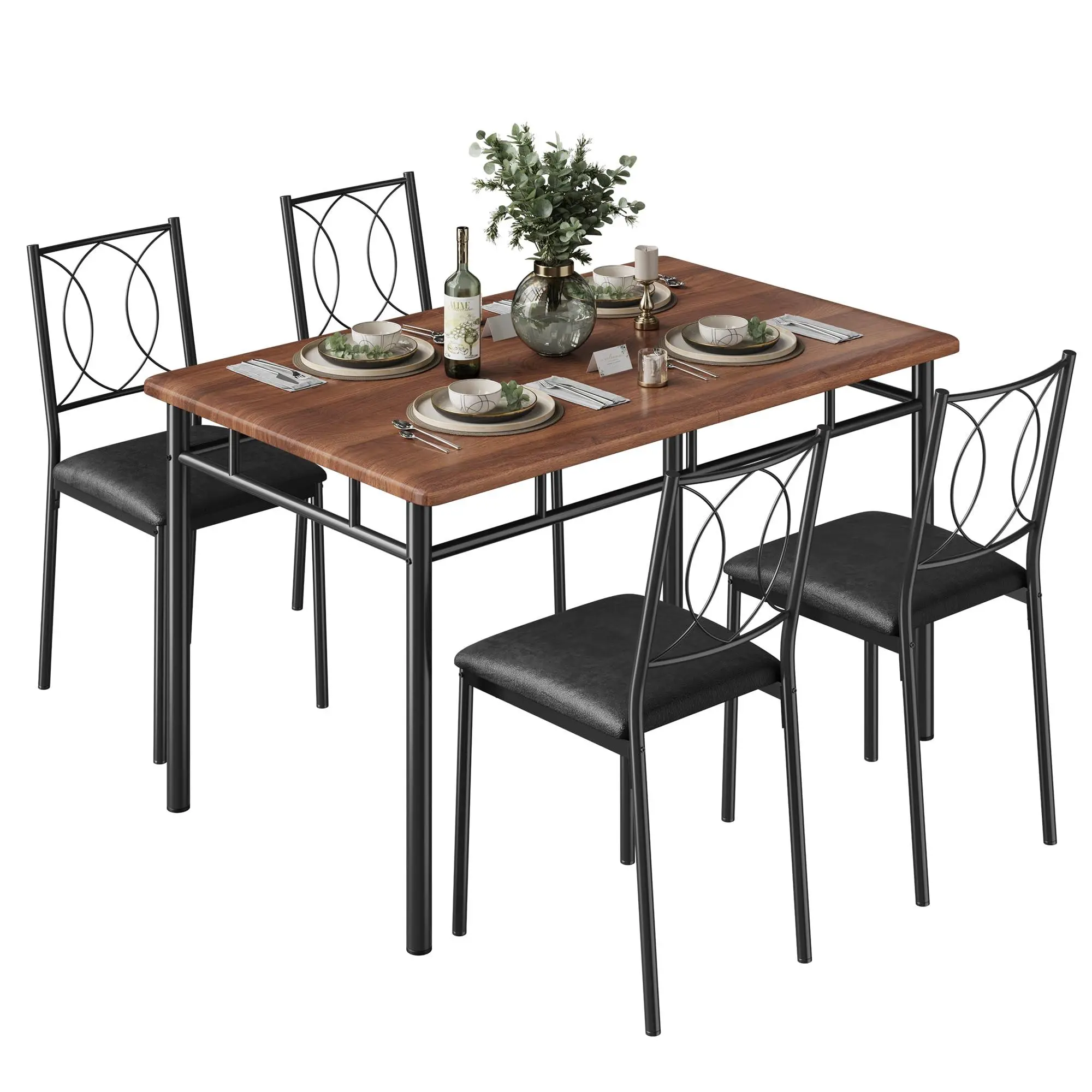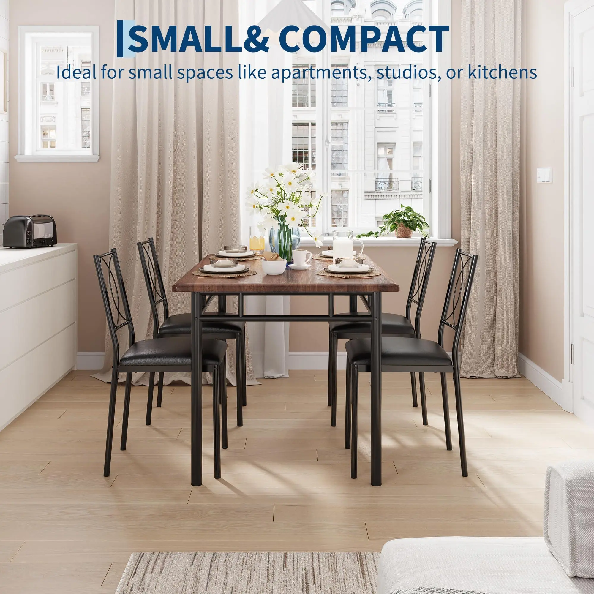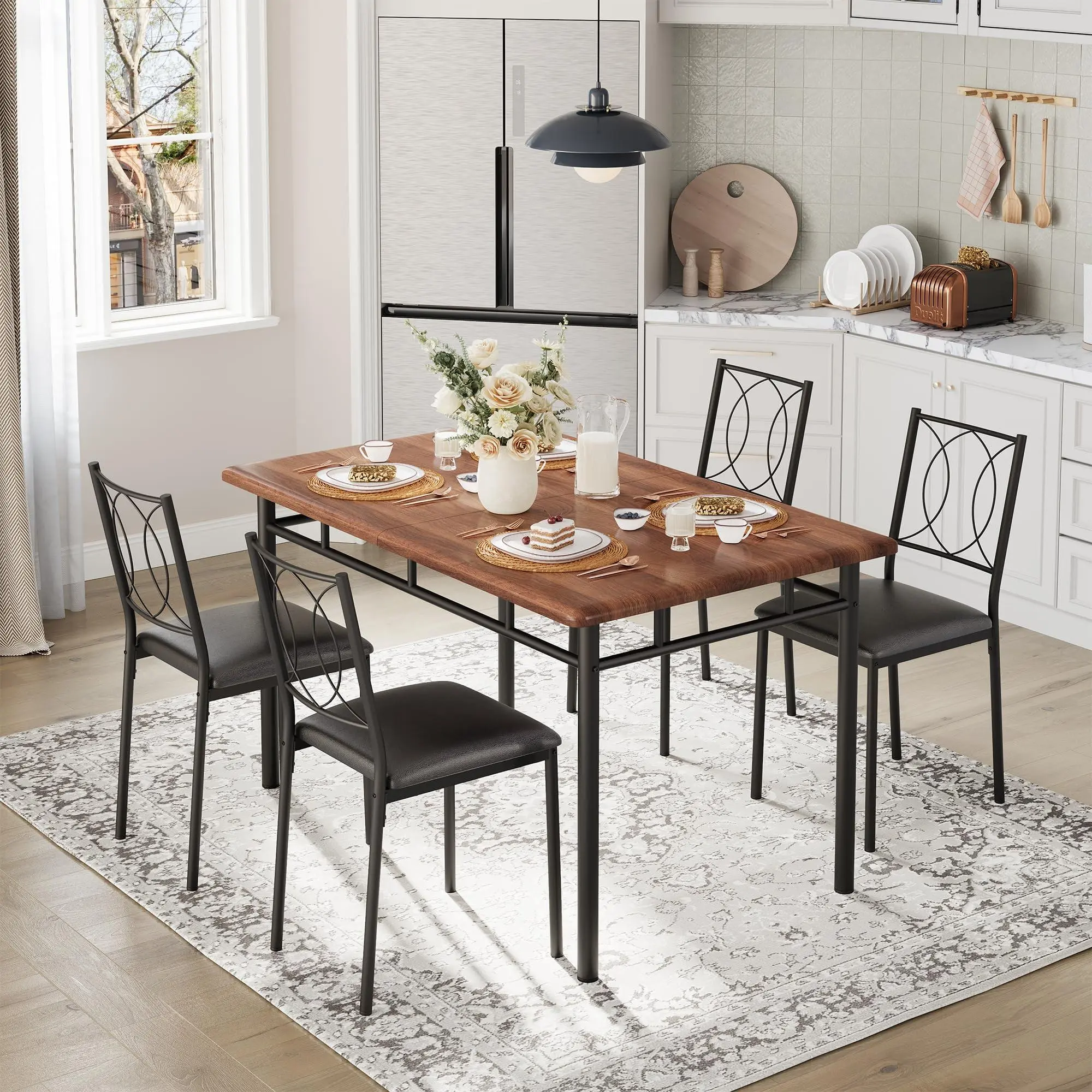 5-Piece Dining Table Set for 4, Farmhouse Wood & Steel Table with Upholstered Chairs, Compact Kitchen Furniture, Easy to Clean, Ideal for Small Apartments & Breakfast, Walnut