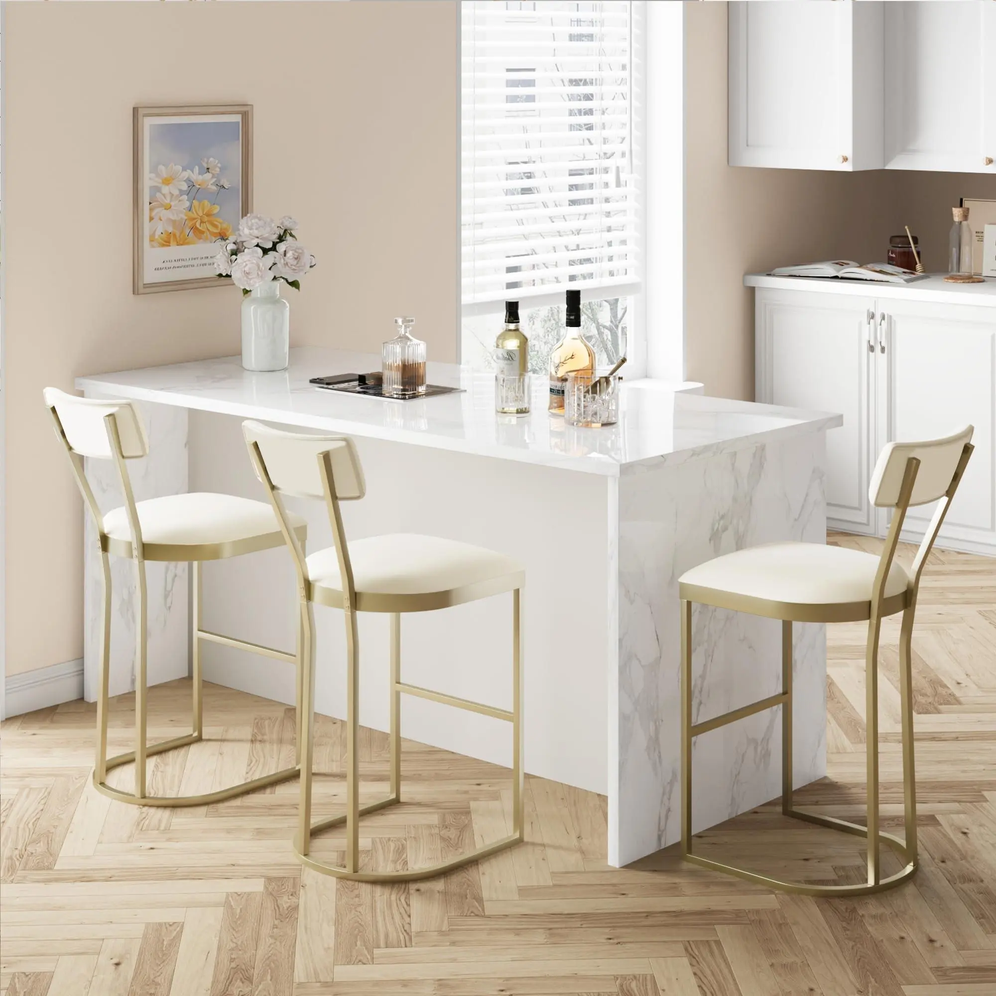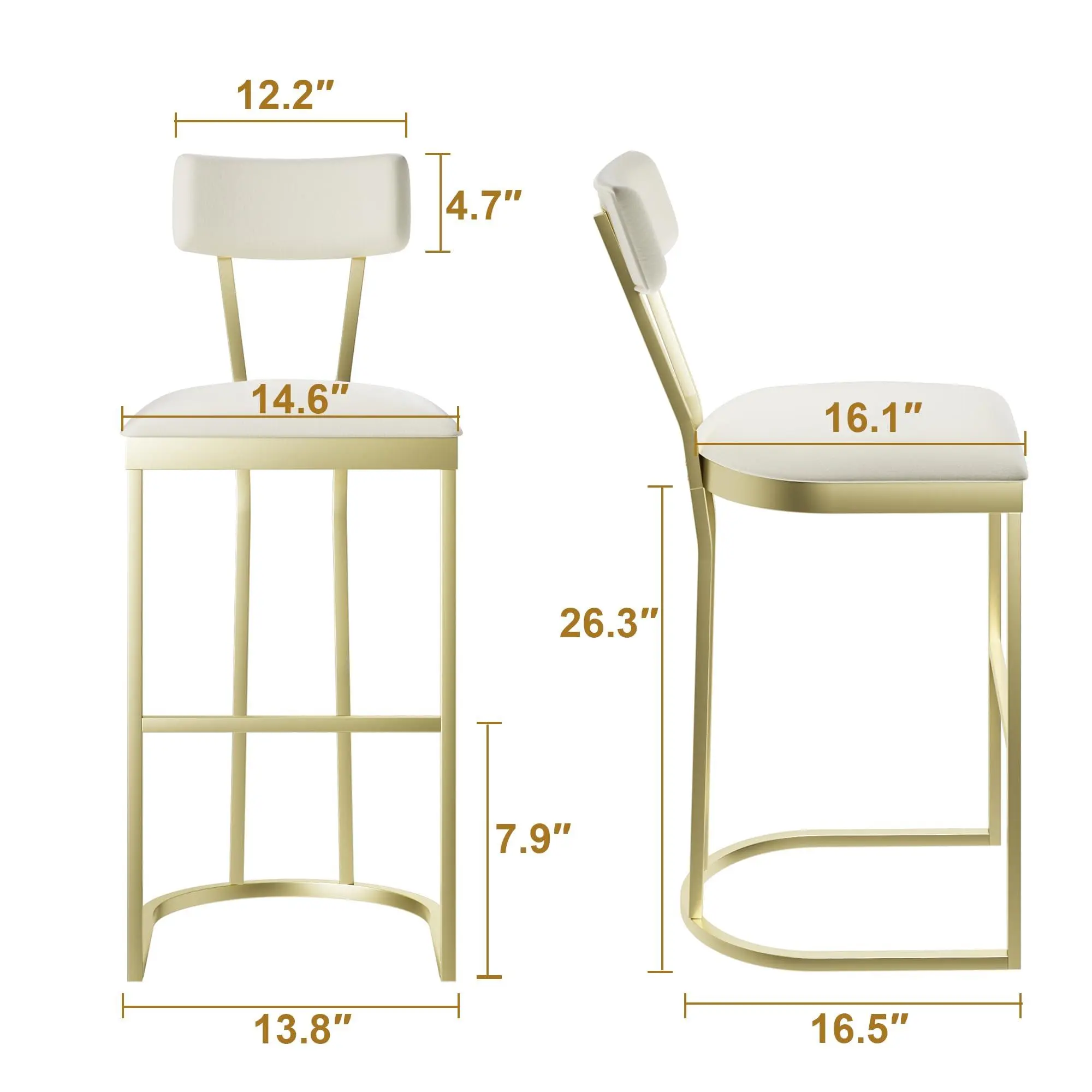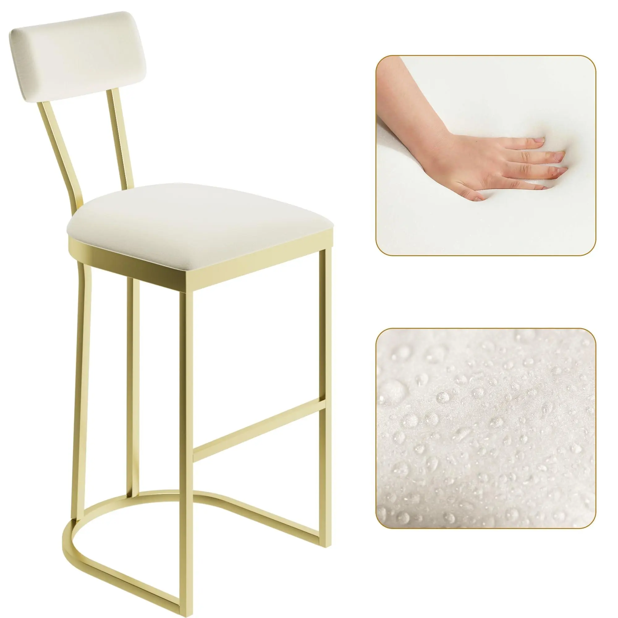 Multi-space versatility : Compact and luxurious in design, with a 16.5-inch length, these stools for kitchen counter fit narrow kitchen islands, home bars, cafes, and more, and are suitable for a wide array of decor styles, including modern, farmhouse, industrial, and more. The bar stools are upholstered in white velvet, which is easy to clean.