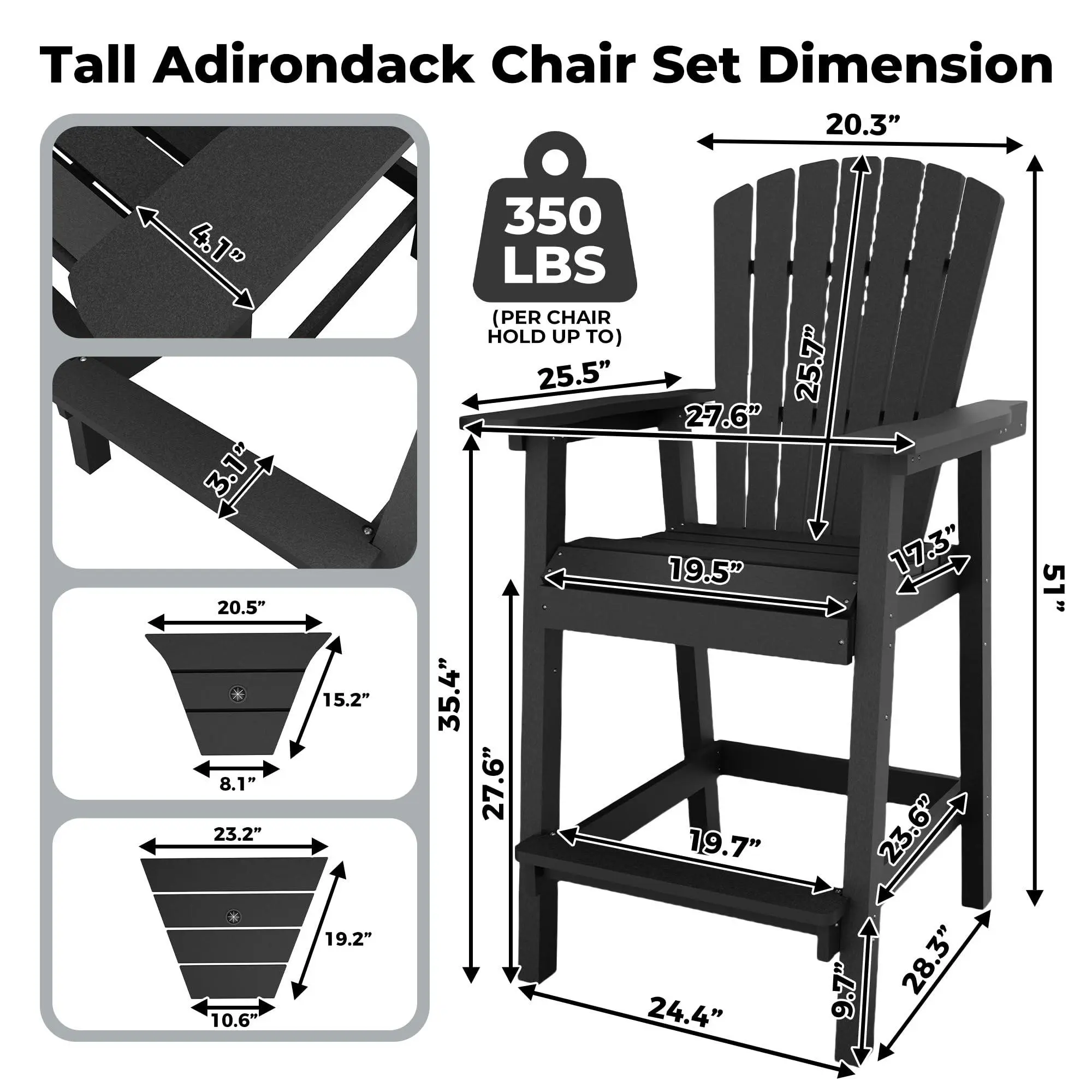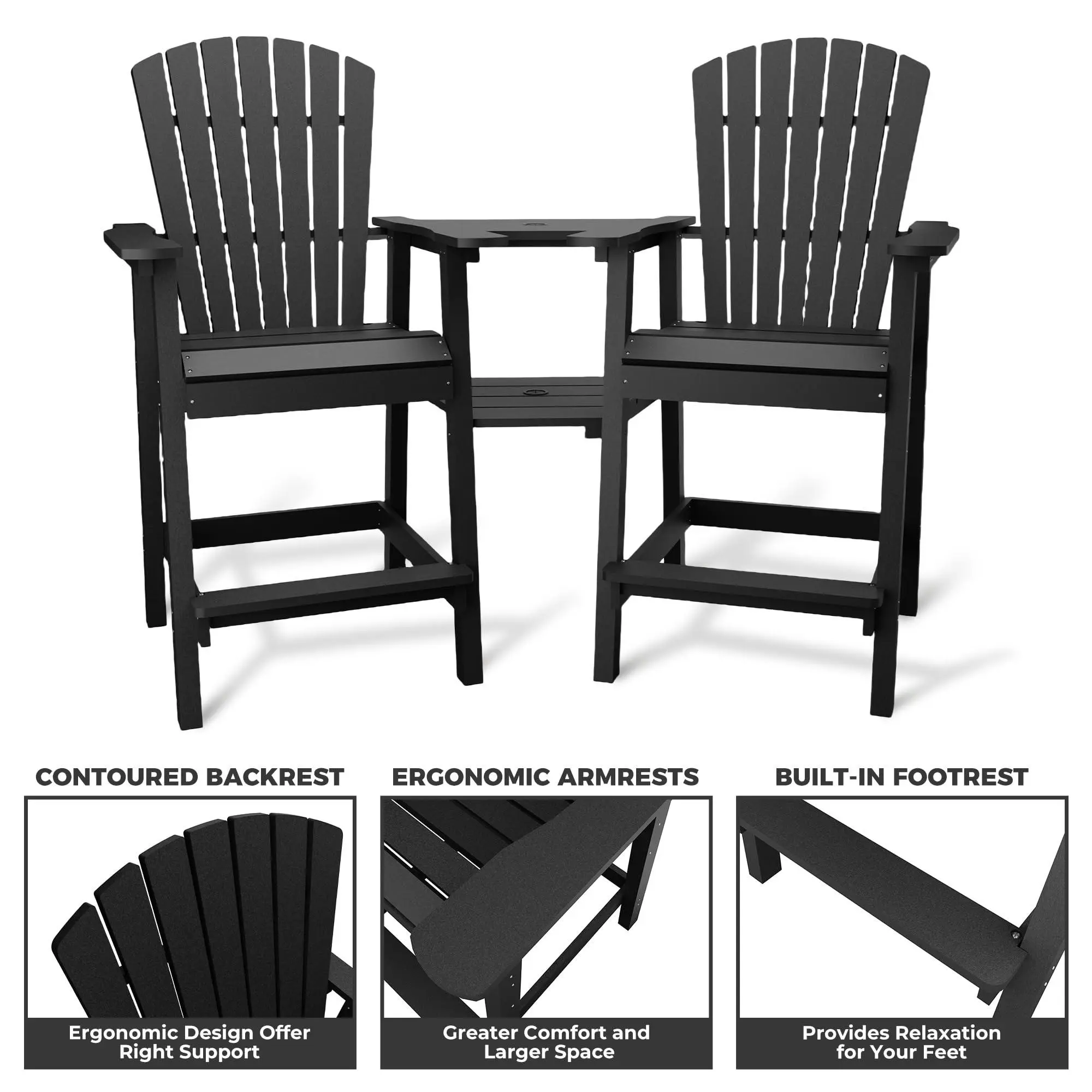 【ERGONOMIC COMFORT DESIGN】Tall Adirondack bar chairs feature contoured high backs, wide armrests, and 3.1" built-in footrests, providing superior lumbar support and all-day comfort for relaxing or entertaining.
