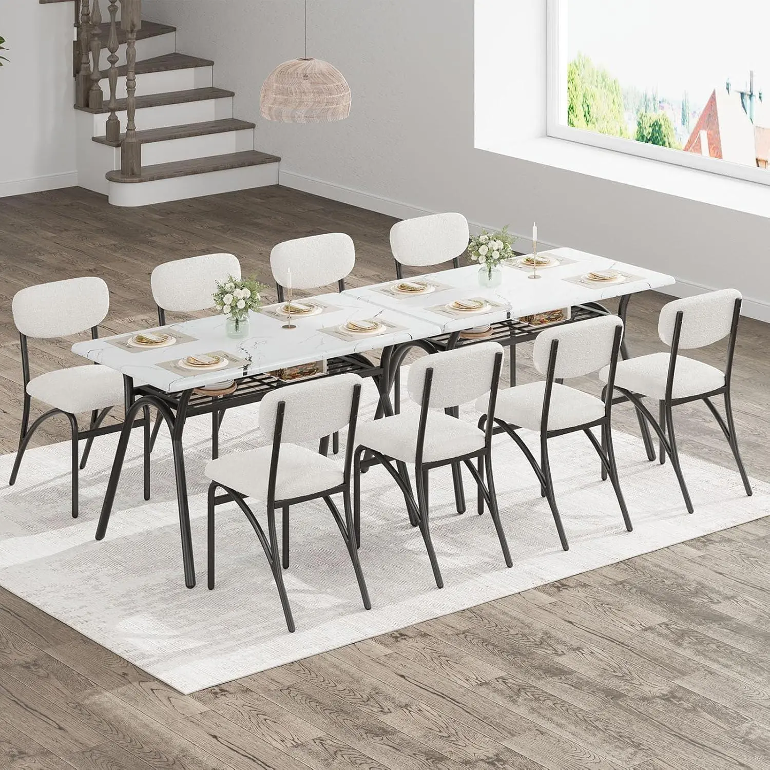 ERGONOMIC DINING CHAIR SETS : Our dining set includes 4 chairs upholstered in durable boucle material. Each chair features a soft cushion and high-density foam backrest for superior comfort and resilience. The high backrest is ergonomically designed to support your back, ensuring a comfortable seating experience whether you're enjoying a meal or entertaining guests