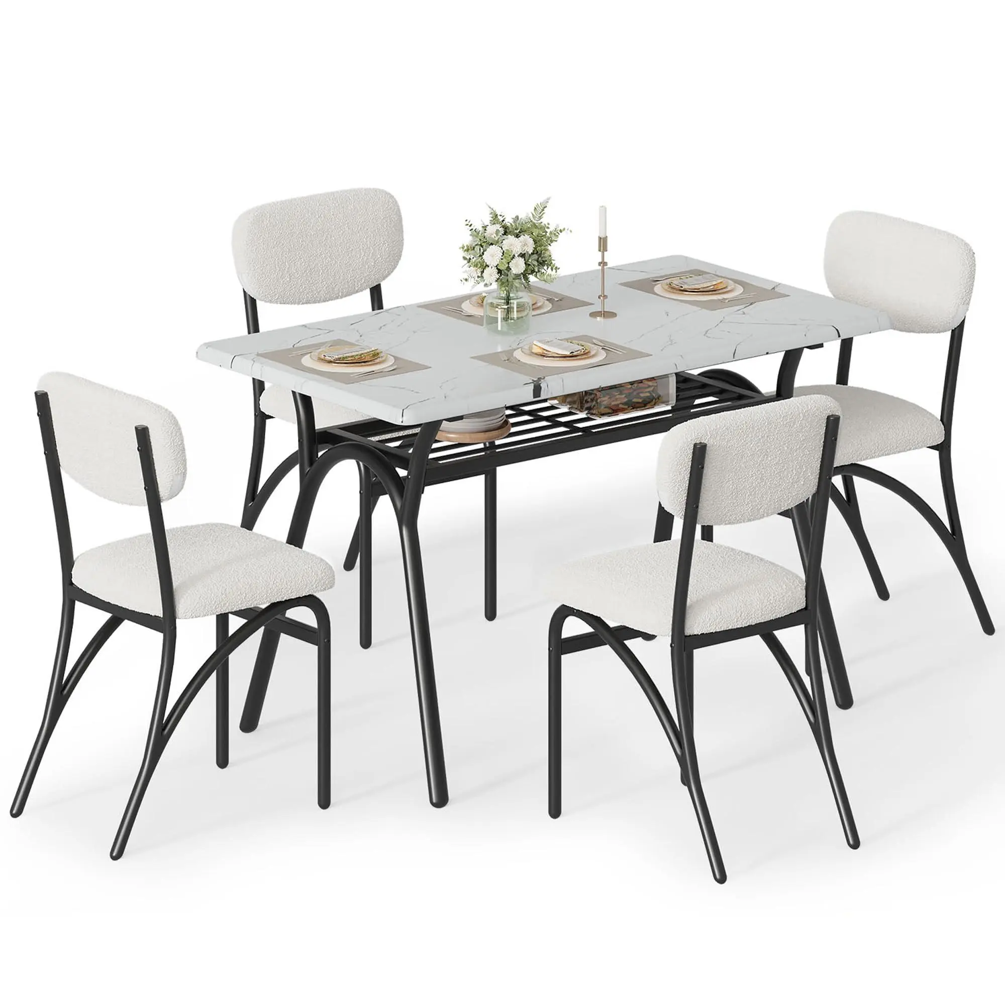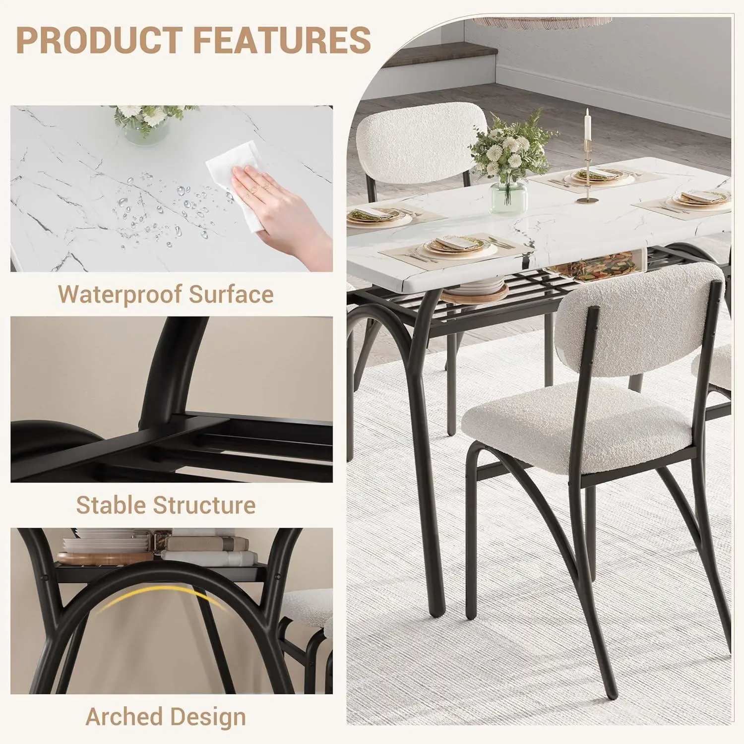 ELEGANT RECTANGULAR DINING TABLE SET FOR 4 : Elevate your dining experience with our stylish rectangular kitchen table chairs set, which includes a modern table and four chic boucle chairs. Dining table minimalist design seamlessly fits into any space, while the wear-resistant and waterproof surfaces ensure easy cleaning and lasting durability