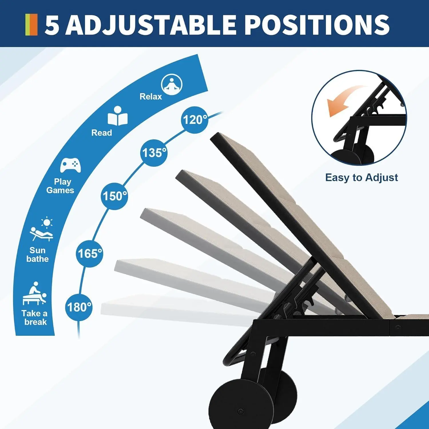 5 Position Adjustable Backrest for Custom Comfort: Relax exactly how you want with the integrated Adjustable Lounge Chair mechanism. Whether you are sunbathing, reading, or napping, this Patio Chaise Lounge Chair offers five distinct angles to support your neck and spine. The smooth transition between positions makes it a must have Outdoor Lounger for your backyard or porch, solving the pain point of stiff, non adjustable seating.