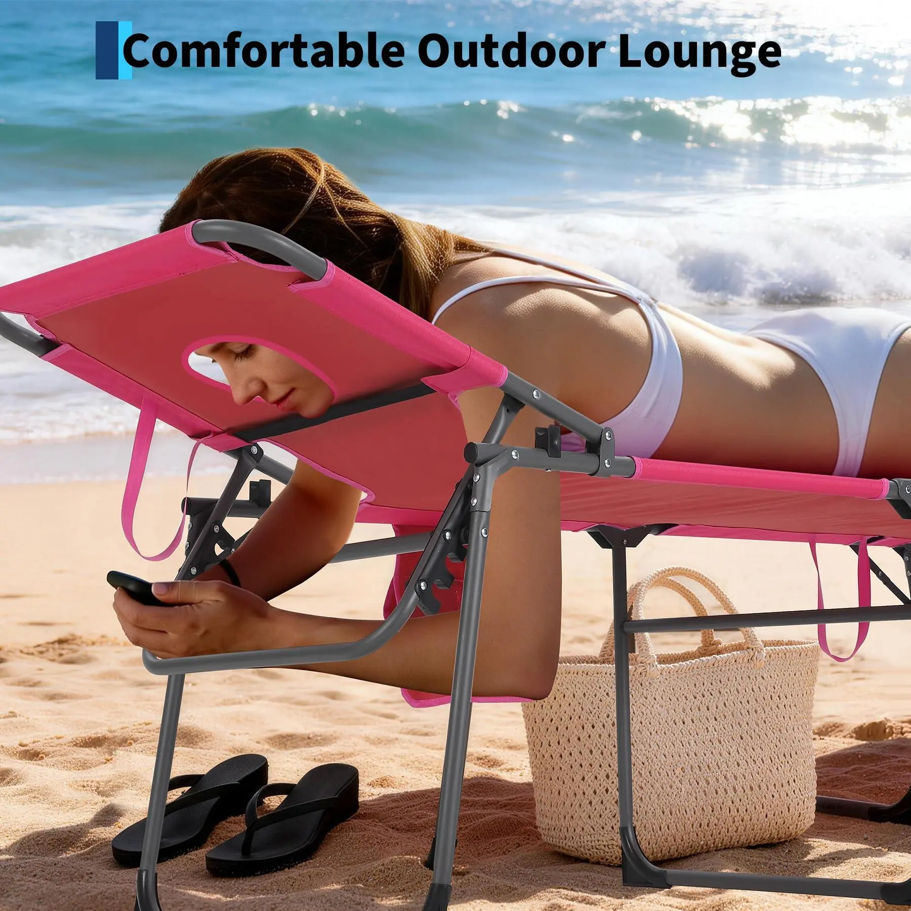 Tanning Chair with Face Hole:The seat surface is specially designed with facial openings and soft padding support. When lying down, the face naturally hangs off the edge, allowing for smooth breathing and avoiding pressure. At the same time, it is convenient for reading or using a mobile phone. It is an ideal choice for sunbathing and relaxing the cervical spine.