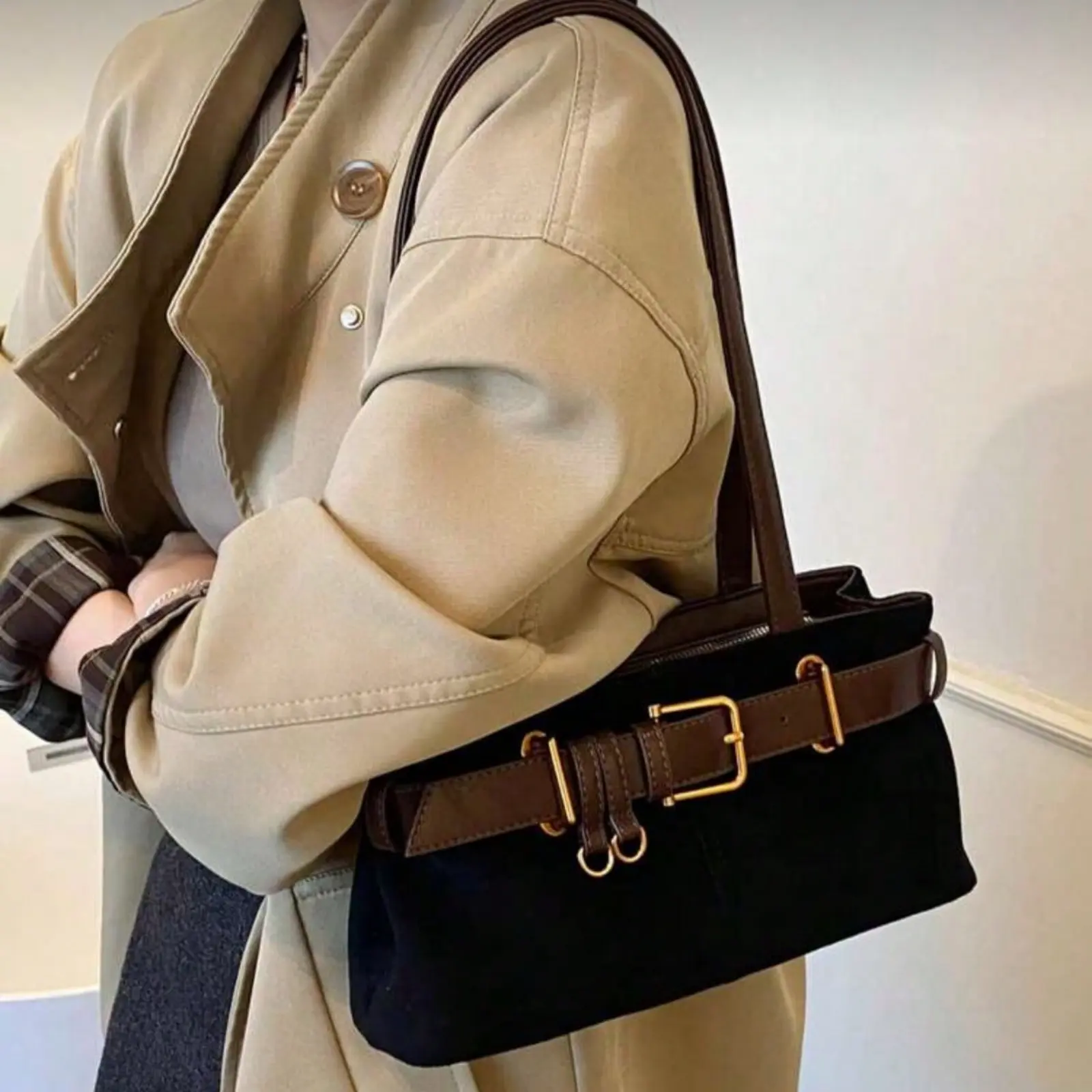 Tea Solid Color Suede Fabric Shoulder Bag, Women Retro Fashion Square Tote Bag With Top Double Handles Zipper Closure Handbag Suitable For Travel, Shopping, Dating, Women's Gift, Great For Commuting, Outdoor, Travel, Hiking