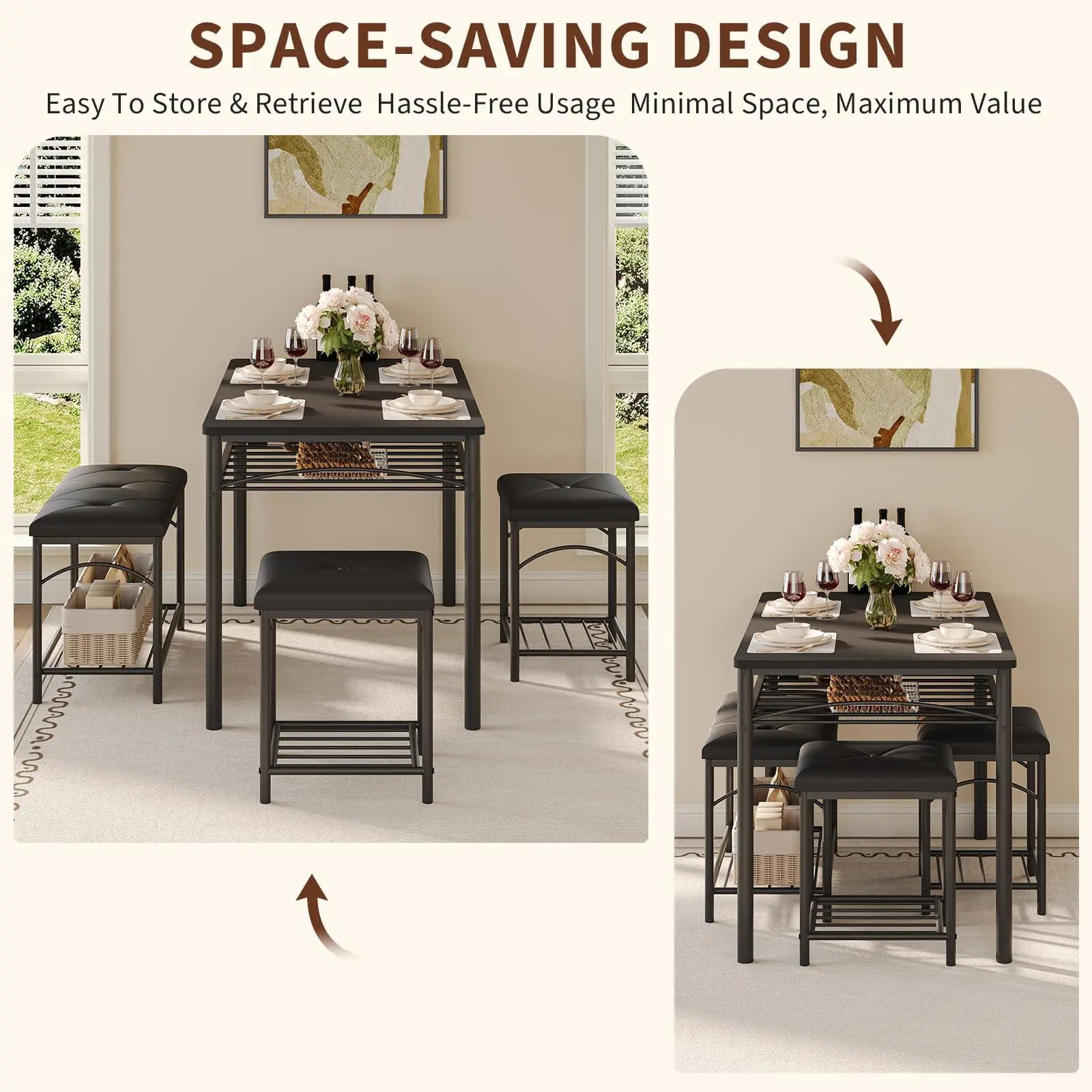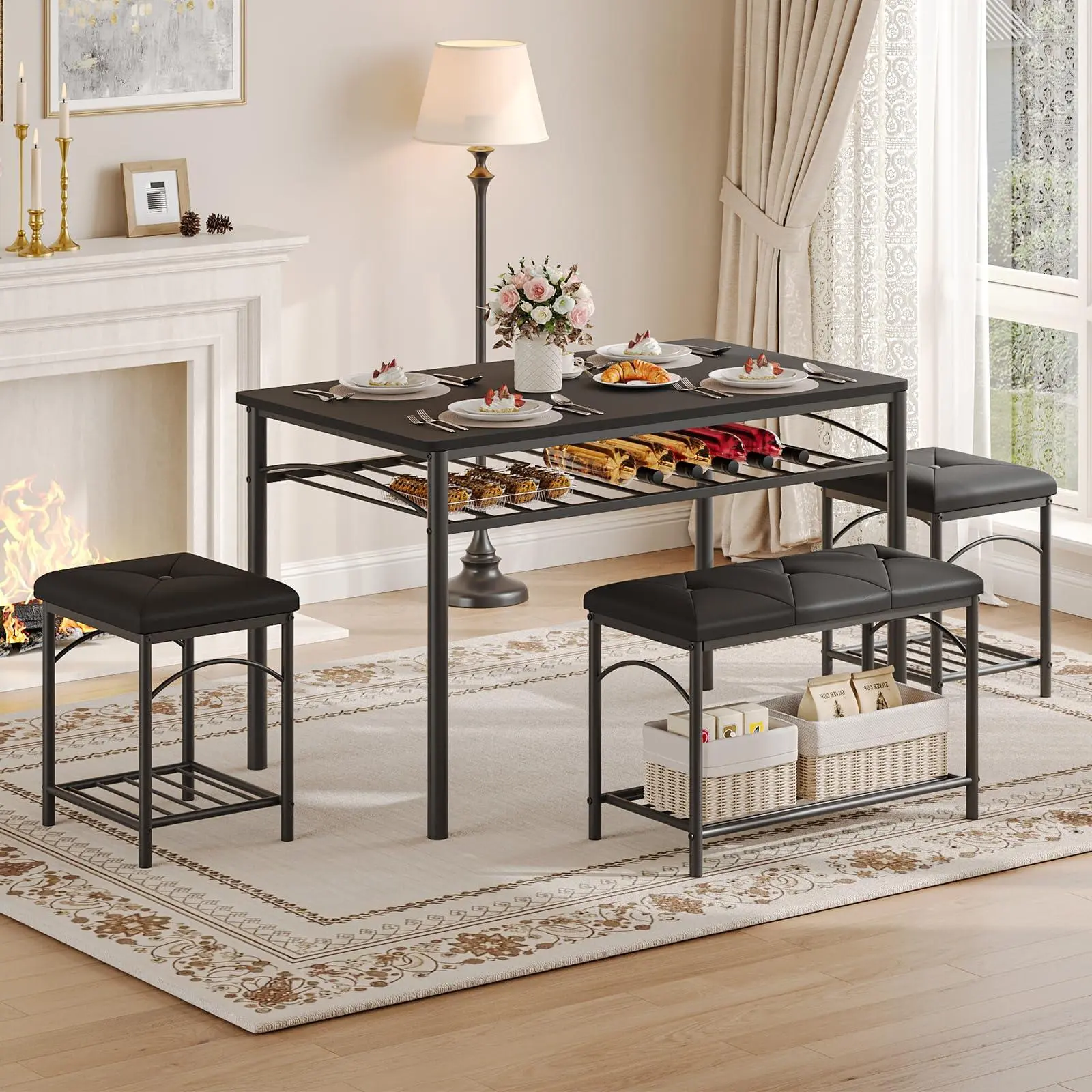 【Integrated Storage Solutions】: Built with convenient metal racks under the table and seating, this 4 person dining table set functions as a versatile dining table with storage shelves, organizing cookbooks and tableware in breakfast nooks to eliminate countertop clutter and help residents maintain a tidy, professional environment even in limited living spaces.
