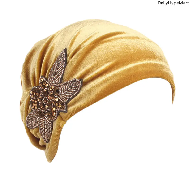 Velvet Pleated Turban Hat with Beaded Flower, Soft Hair Loss Bonnet for Women