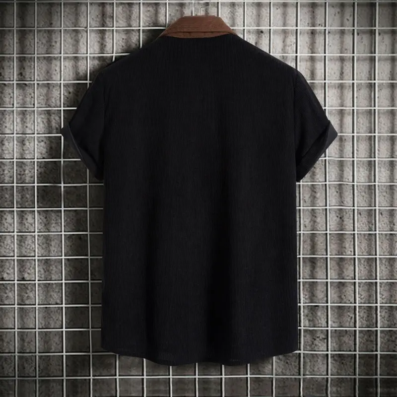 Men's corduroy color-block short-sleeve shirt, casual button-up shirt with chest pocket, vintage summer street style, soft and breathable, suitable for everyday wear