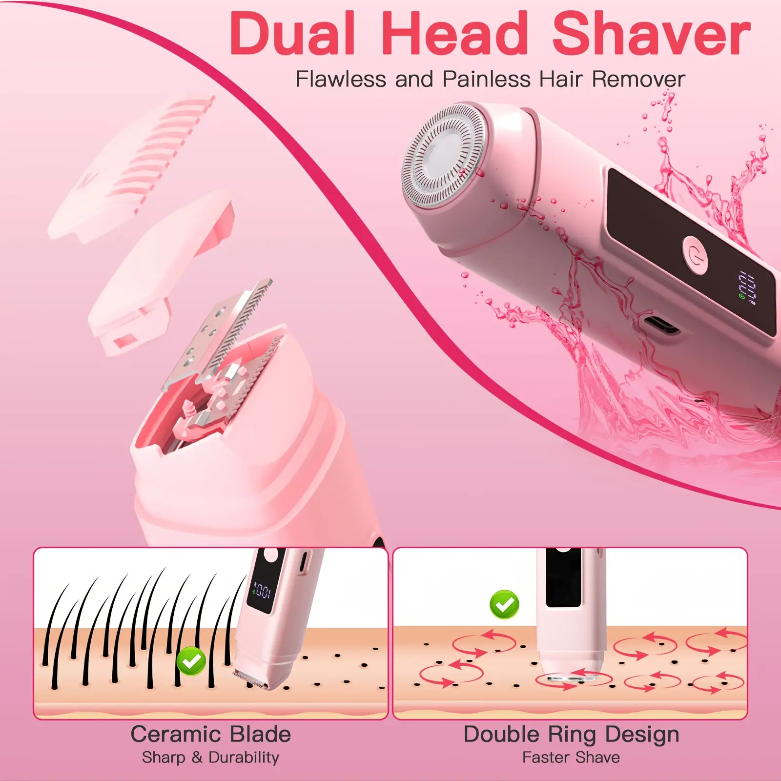 2-in-1 Women’s Electric Shaver designed for body, bikini line, and facial hair grooming. This dual-head shaver features a body trimmer head for larger areas and a rotary shaver head for short, fine hair touch-ups.