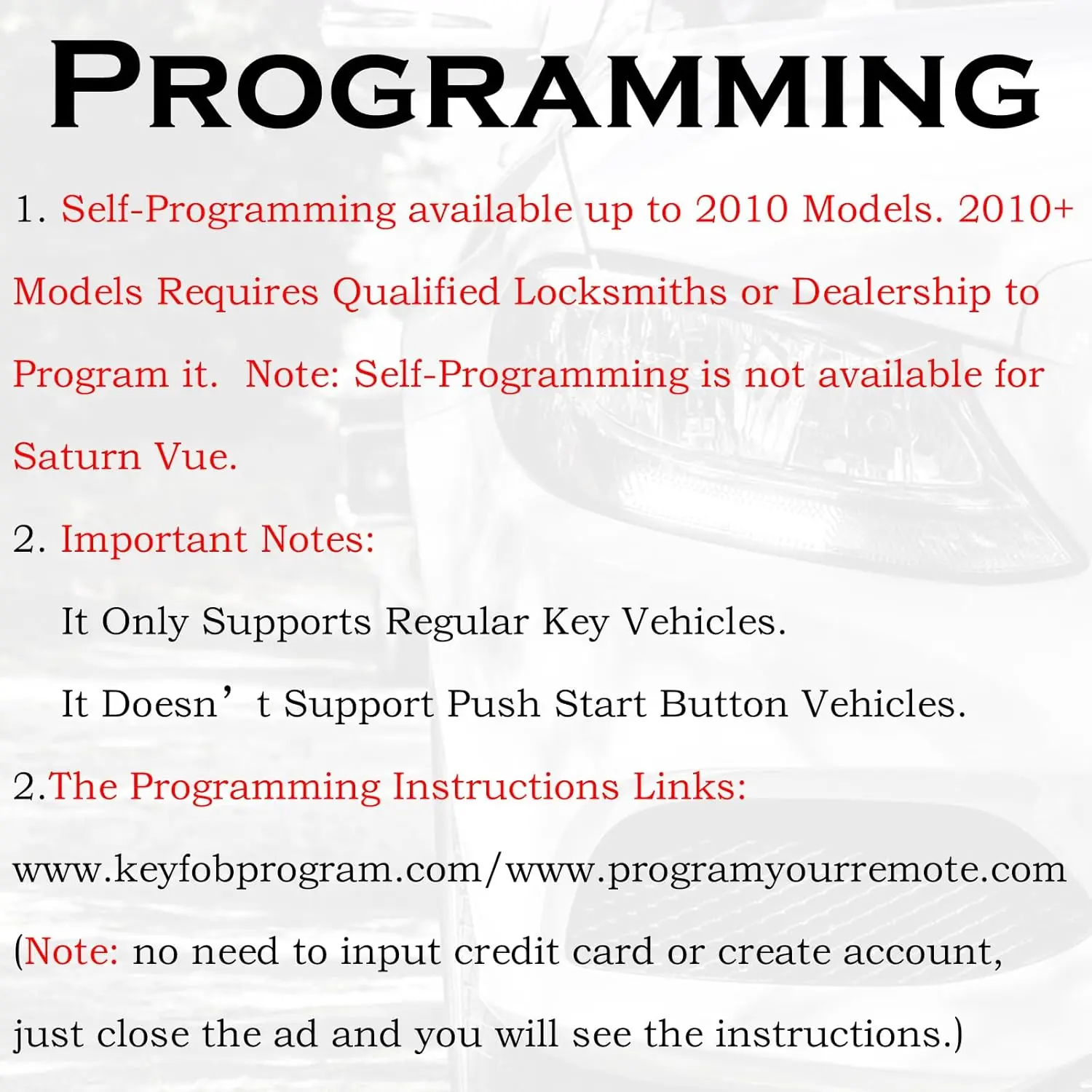 Customer reviews average 4.4 out of 5 stars. Prices range from $9.95 to $19.95. Self-programming is not available for Saturn Vue. This is an aftermarket remote key fob, not OEM. All product logos and brands are the property of their respective owners. Vehicles' brands are used for identification purposes.