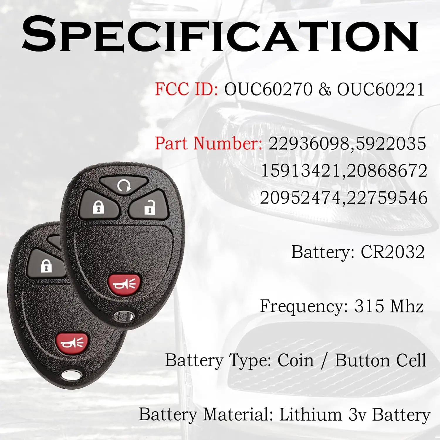 This remote key fob replacement fits Chevy Silverado, Avalanche, Equinox, Express, Traverse, GMC Yukon, Sierra, and more. Compatible with models from 2007 to 2016. It includes a lock, unlock, and remote start button. The red button is for panic. FCC ID: OUC60270. Part numbers: 15913421, 20868672, 20952474, 22759546, 22936098, 5922035. Self-programming available for 2010 models. For 2010+ models, a locksmith or dealership is required.