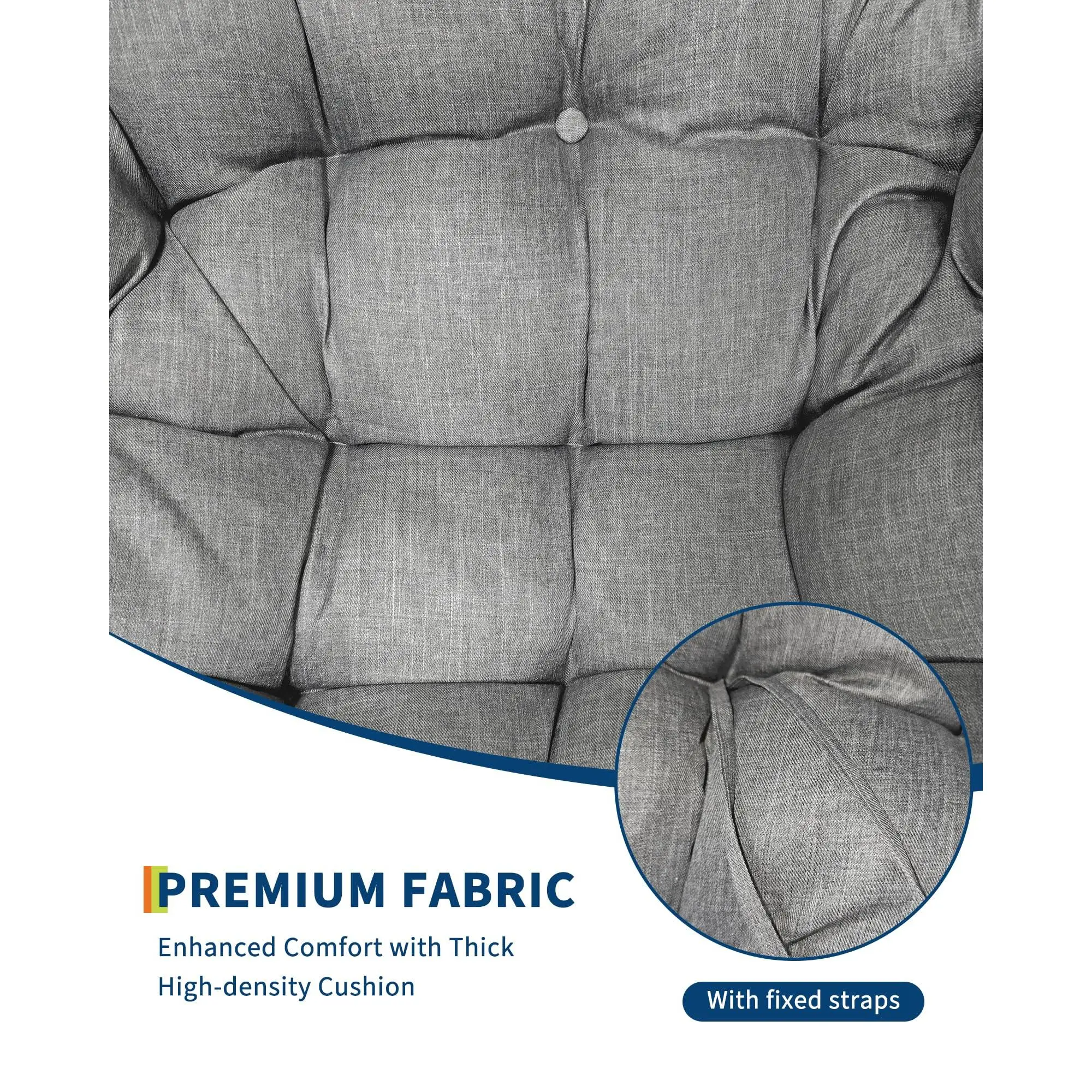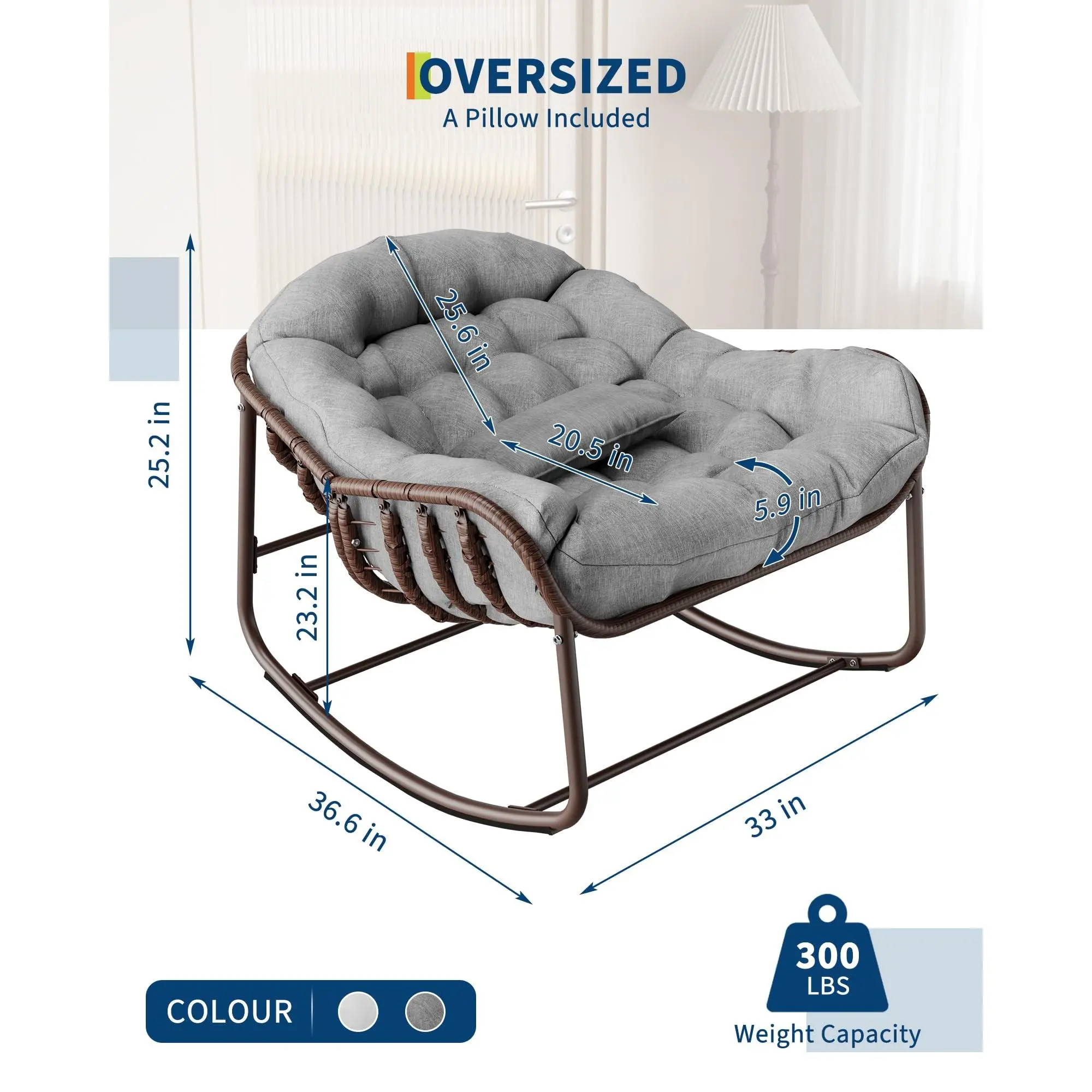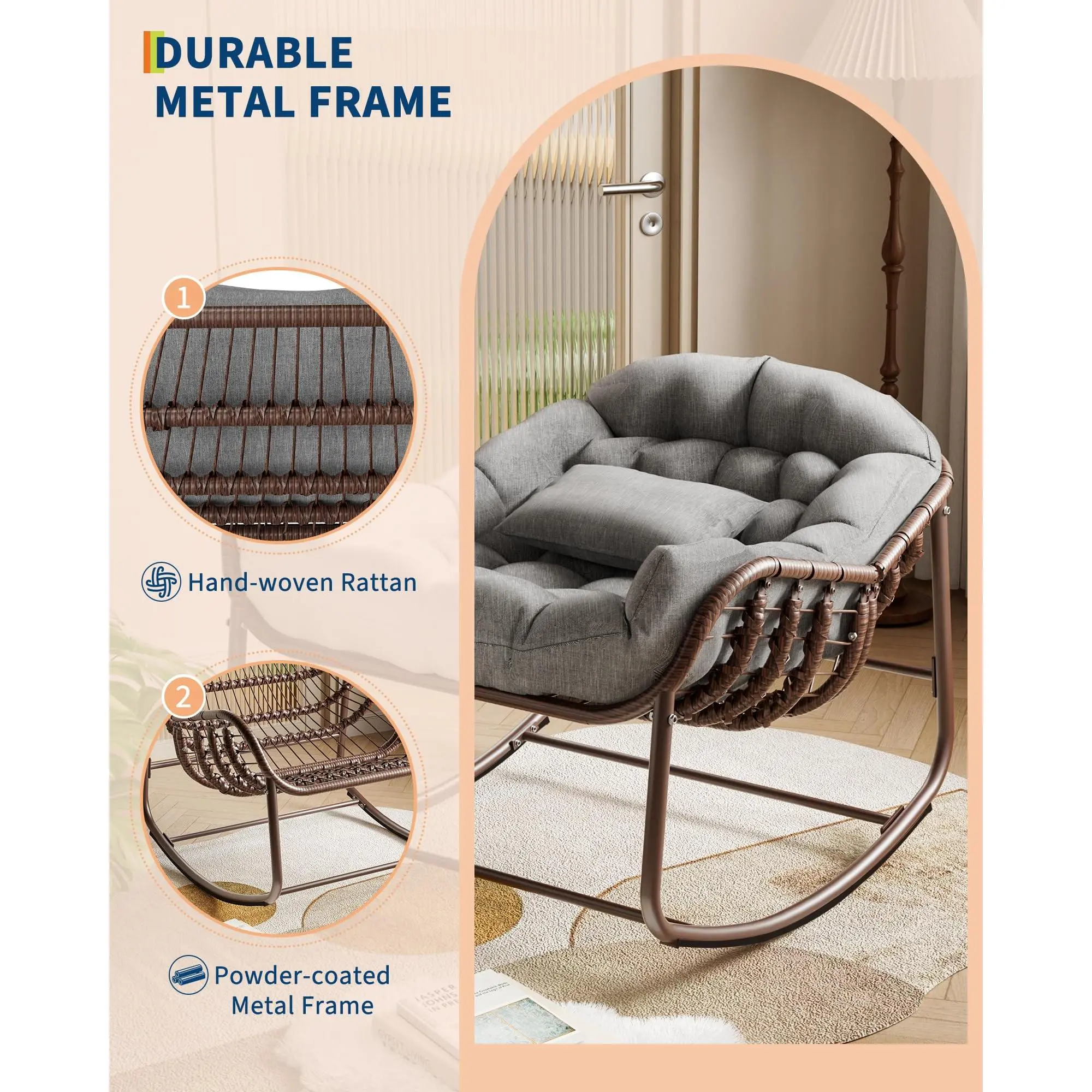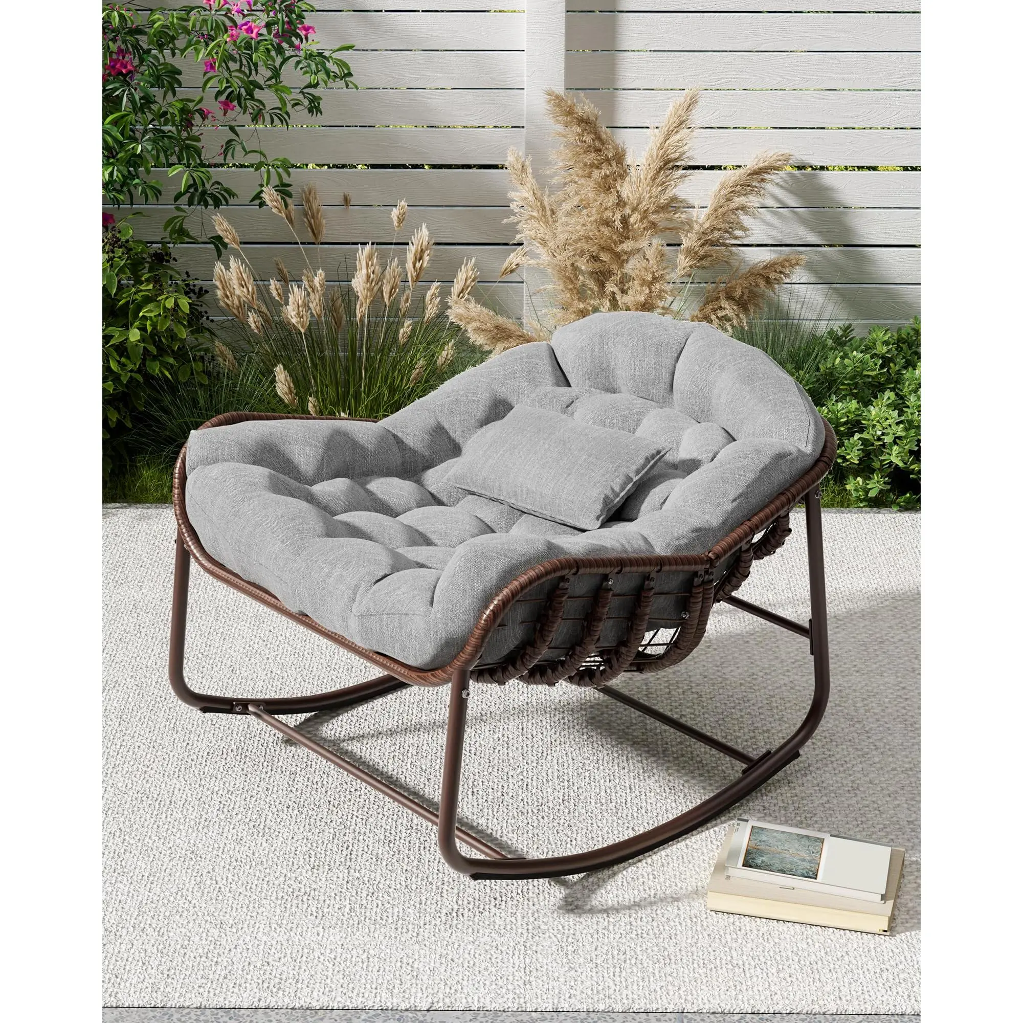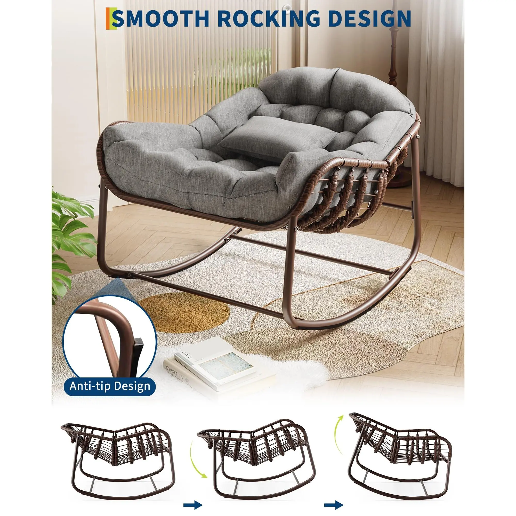 GAOMON Outdoor Papasan Rocking Chair, Oversized Wicker Lounge Chair with Cushion and Metal Frame, Patio Rattan Egg Rocker for Balcony Backyard Porch Bedroom, Grey