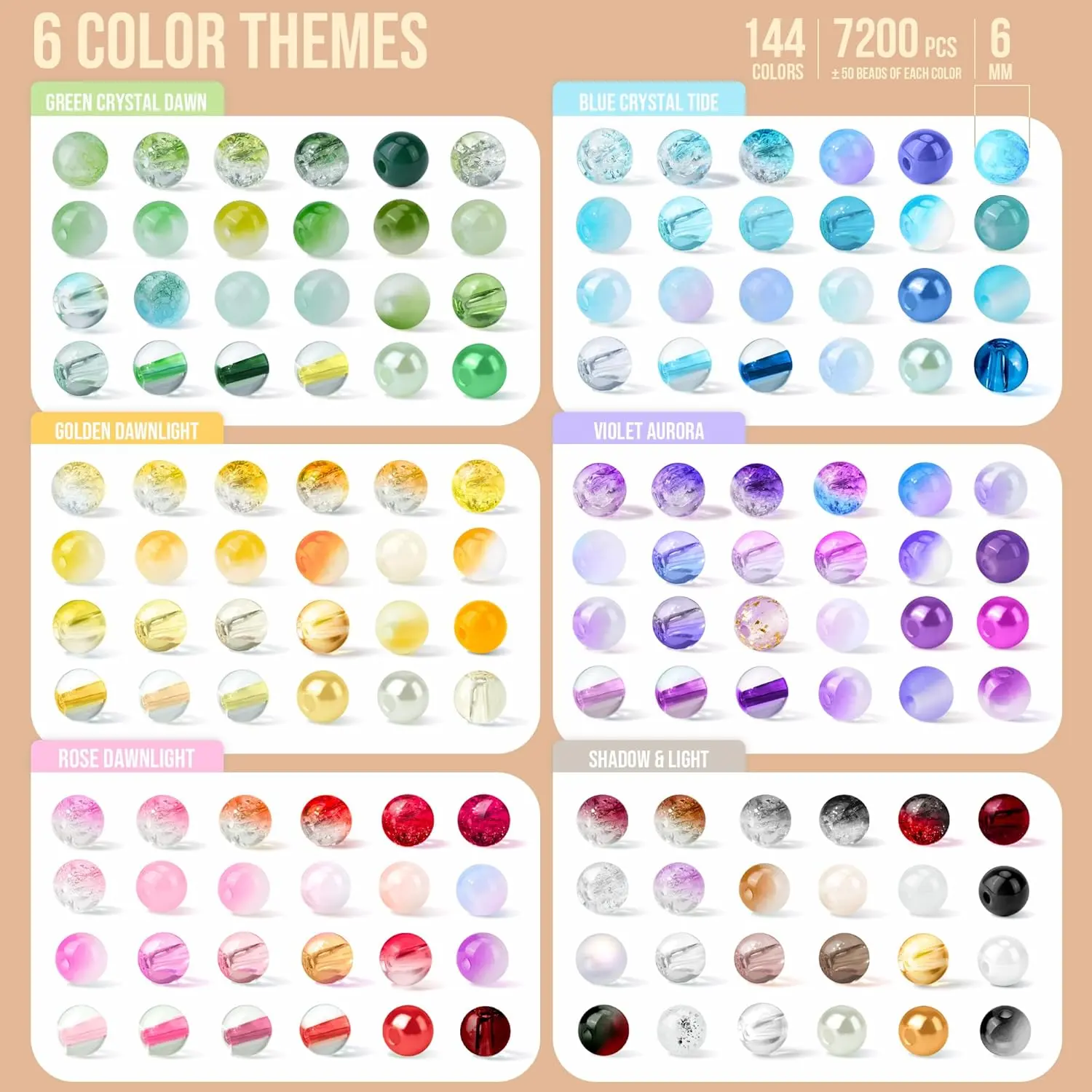 ·Great Value Glass Beads Bracelet Making Kit: Our 6mm glass beads set includes 144 unique colors, about 50 pieces of each color, you’ll have a total about 7200 bracelet beads to unleash your creativity and provide more choices for your DIY craft needs. This product is suitable for adults, not for those under 12