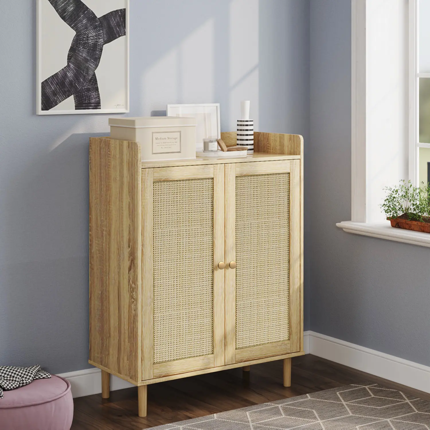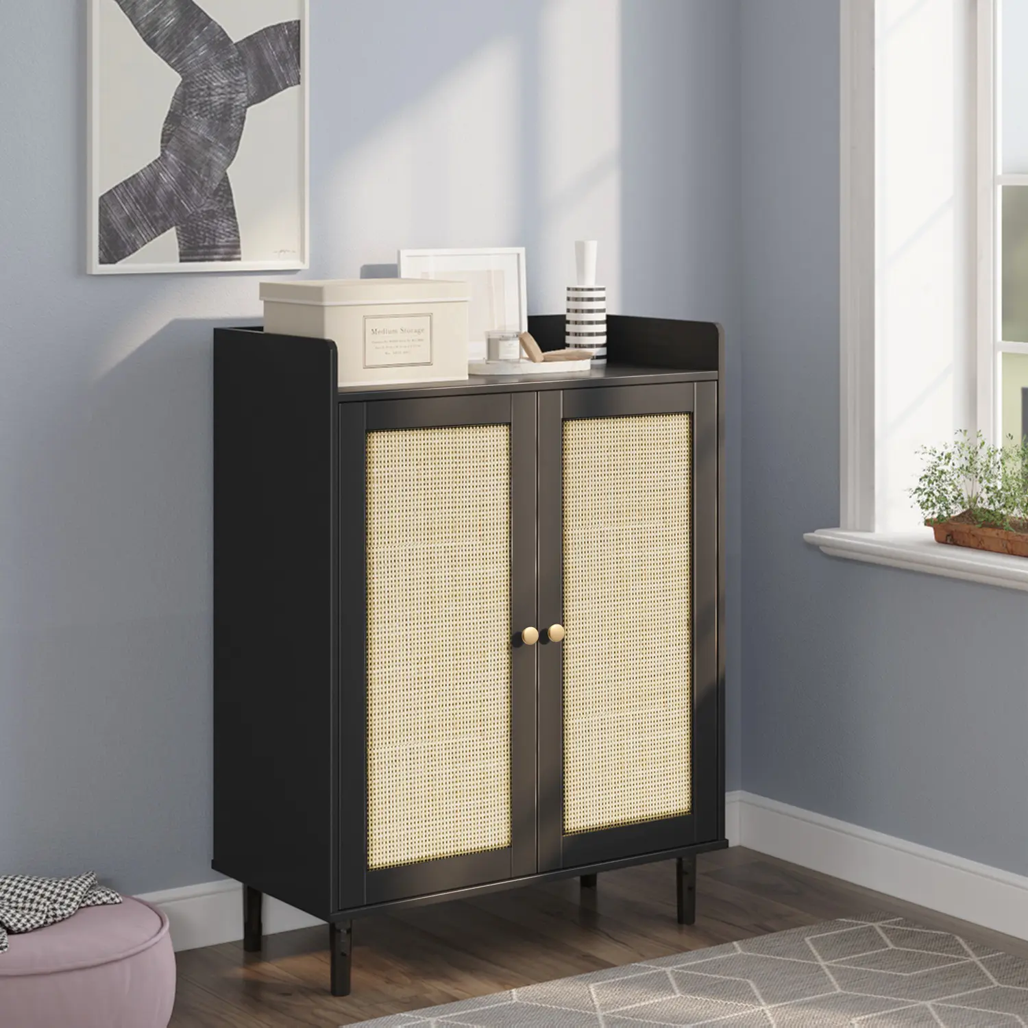 Wooden Wardrobes With Hanging Rods Freestanding Modern Clothing Storage Cabinets With 2 Rattan Doors & Drawers In Black White Natural Colors For Bedroom Living Room Laundry Cloakroom