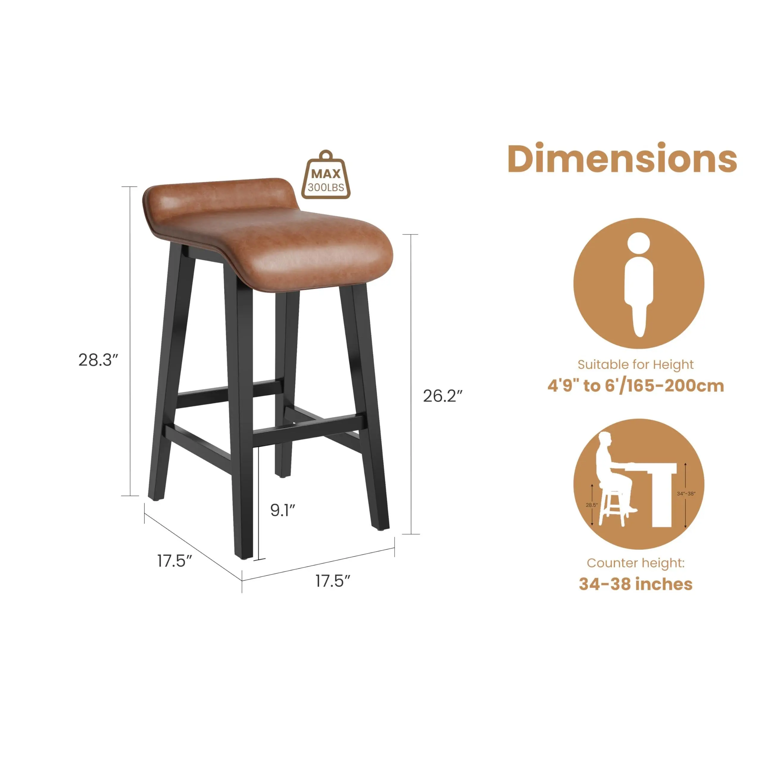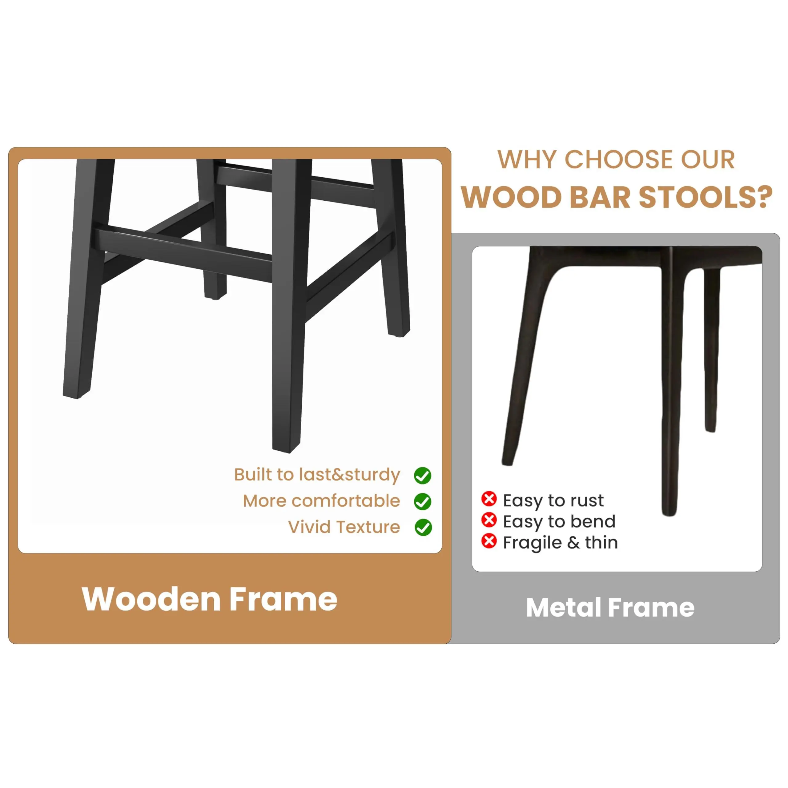 【Durable Construction for Long-Lasting Stability】Built to withstand frequent use, each stool features a sturdy wood frame reinforced with embedded joints and screw fastenings to prevent wobbling. With a weight capacity of 300 lbs (approx. 136 kg), they ensure reliable stability. Hidden adjustable foot pads adapt to uneven floors, maintaining a sleek and steady base.